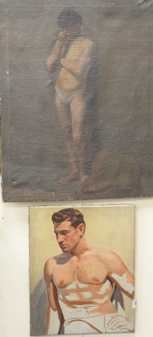 Four Piece Lot of Female Portraits, to include a large nude oil on canvas, signed indistinctly lower left a reclining nude, oil on canvas, unsigned a seated nude oil on canvas by Michael Lemmermeyer, signed lower left along with a woman in an interior scene, oil on canvas, signed: Morin, lower left, having Bass Museum accession numbers on the reverse largest 43 x 28.