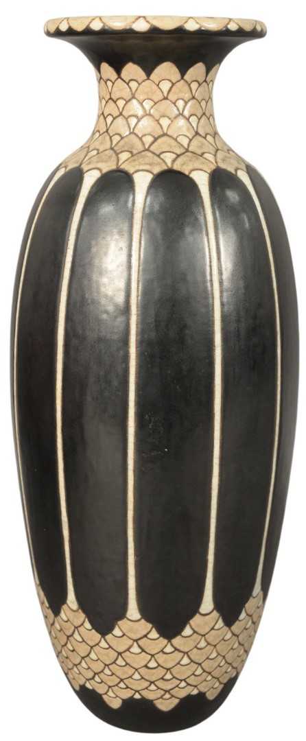 Group of Seven French Ceramic Vessels to include one red glazed vase, marked Marcel Guillard to the underside one vase with green decoration, marked Keramis to the underside four other vases, each unmarked along with a female nude blue glazed figure, tallest 13 inches.