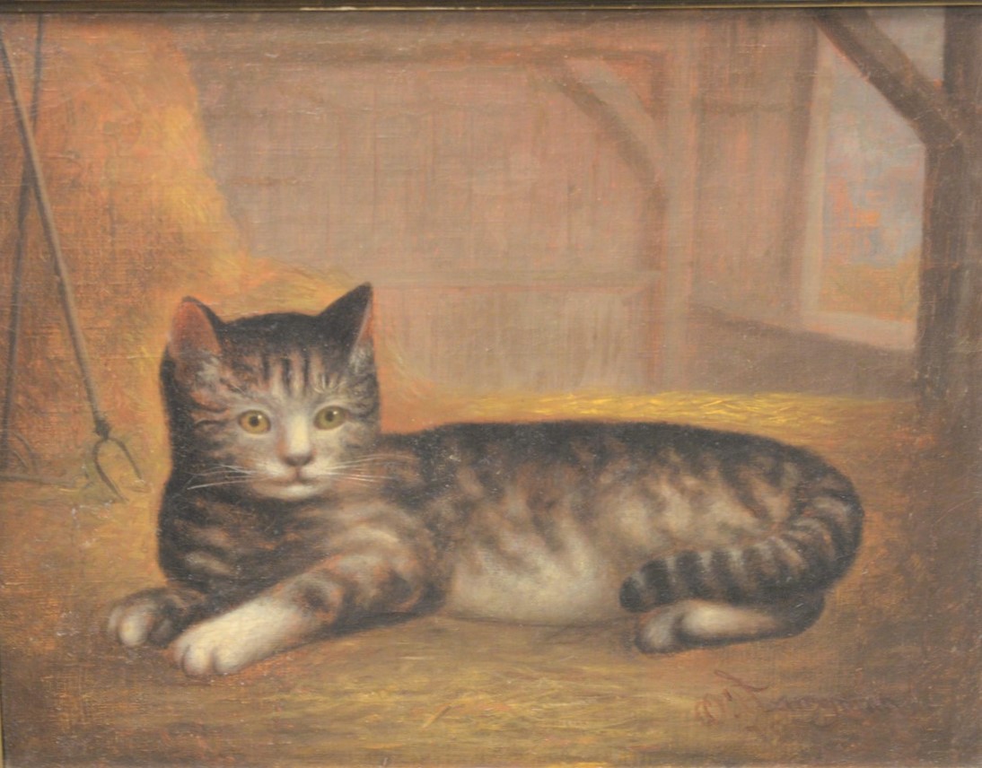 British School 19th century, barn scene with fighting cat and dog, oil on glue lined canvas, unsigned, a note on the stretcher bar attributes this work to George Armfield, 11 x 15.