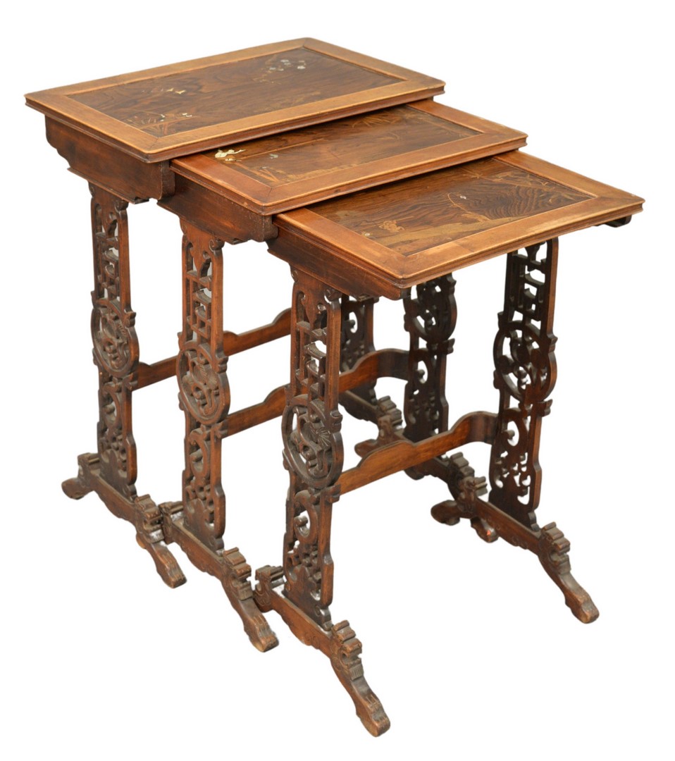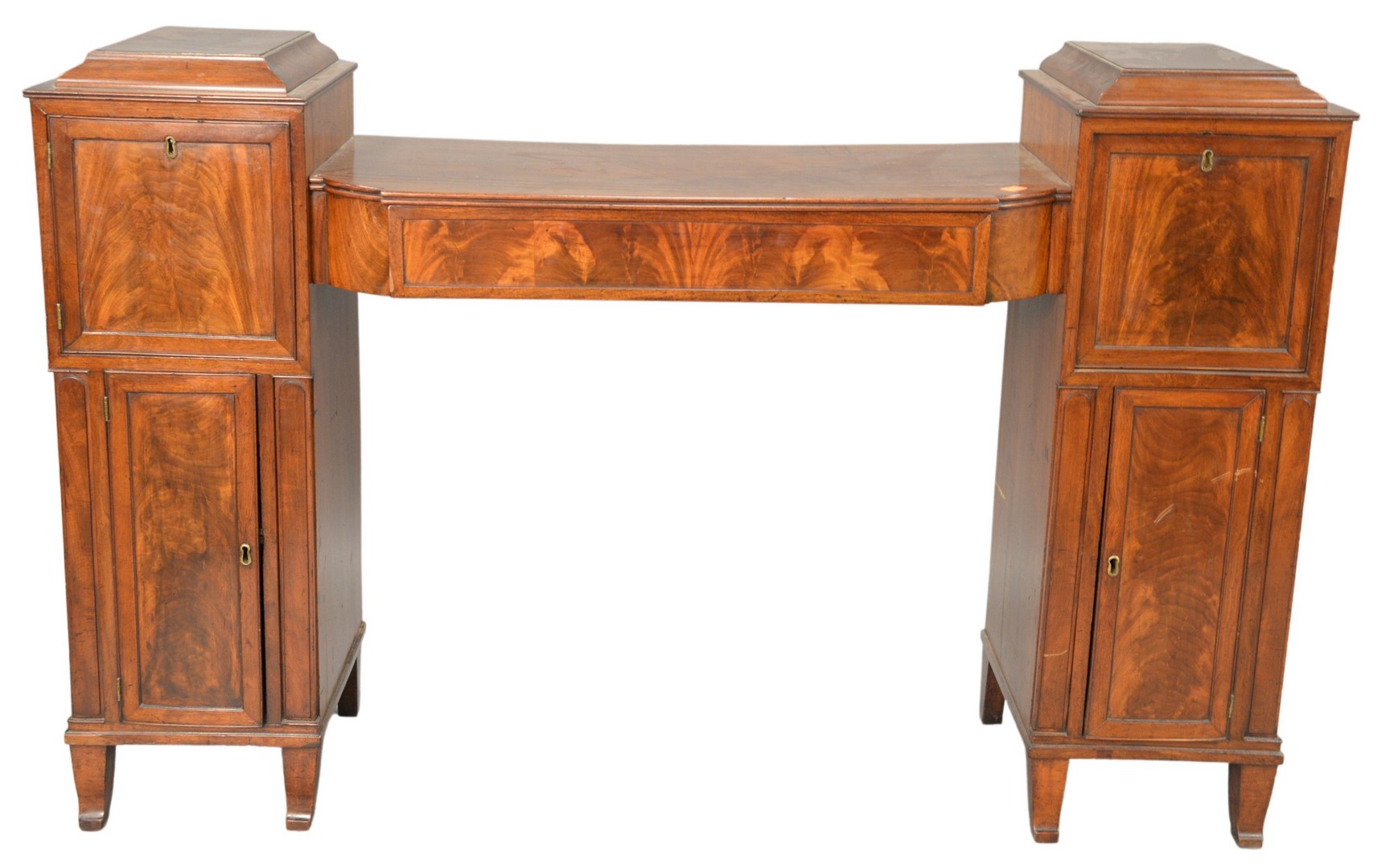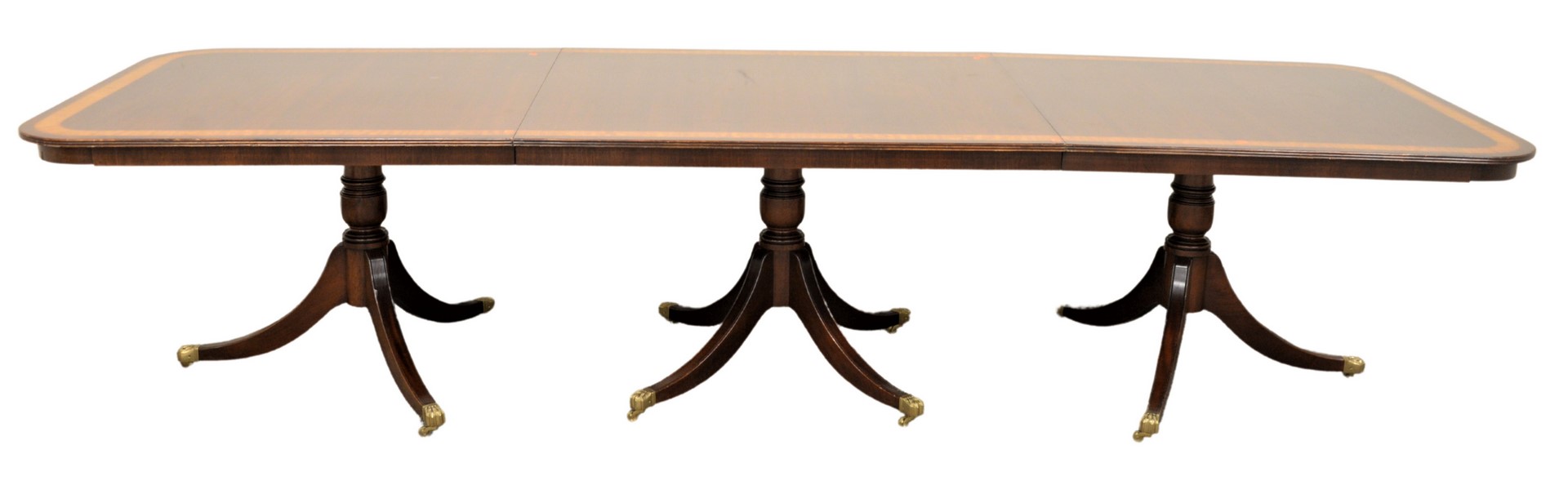 Duncan Phyfe Style Triple Pedestal Dining Table, having banded inlay top, along with brass capped feet, height 29 1/2 inches, with two leaves, top 44 x 137, open length 169 inches.