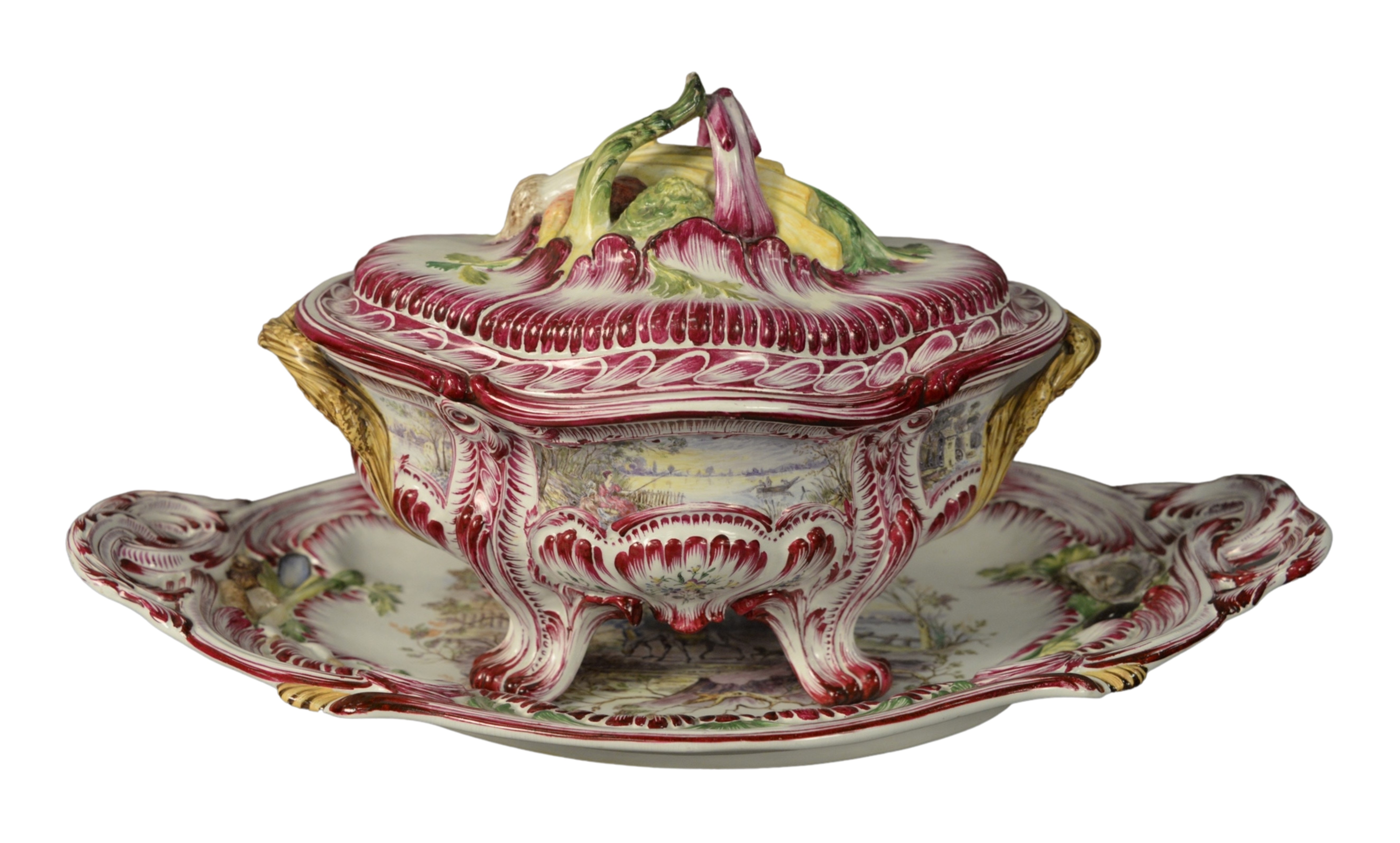 Luneville Platter and Matching Covered Dish having painted fishing village scene with fruit and vegetable motif handle, height of covered dish 10 inches, width of platter 21 inches.