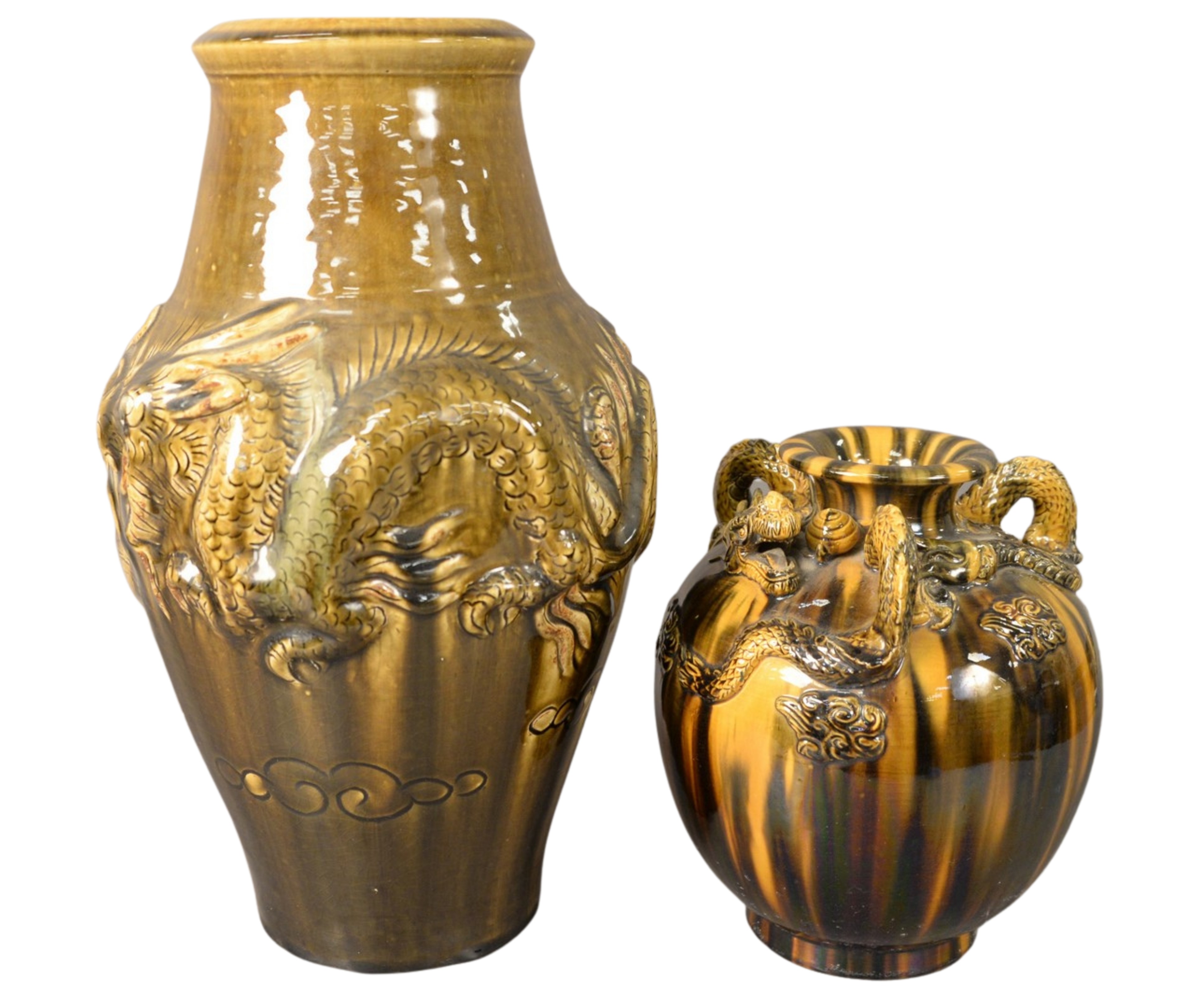 Two Chinese Porcelain Yellow and Brown Glazed Vases to include a globular vase having dragon form handles along with a large drilled vase with three claw dragon relief.