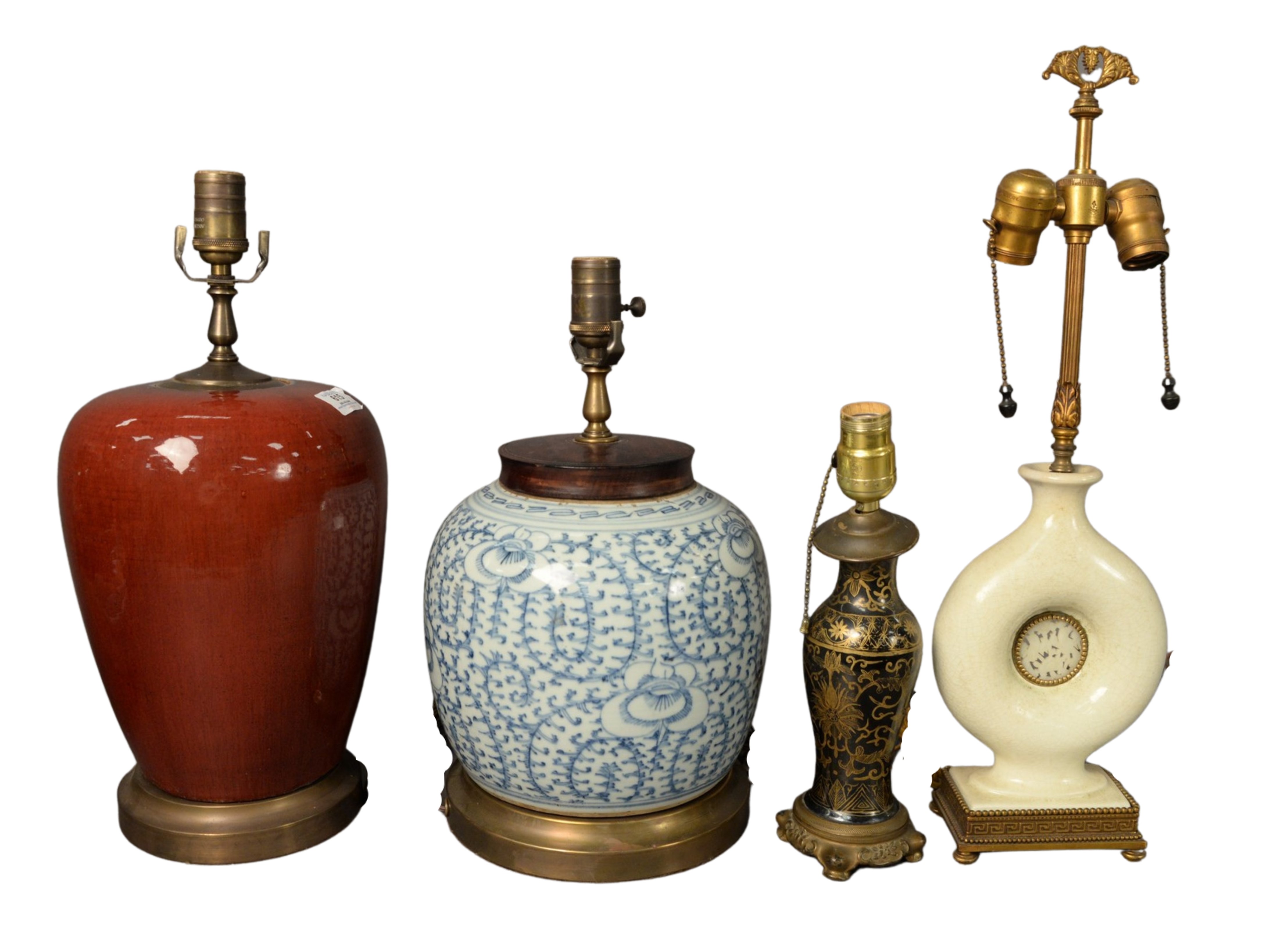 Four Chinese Porcelain Table Lamps each mounted on brass bases, to include one blue and white one oxblood one white glazed with a hardstone center along with one black glazed with gold decoration, tallest height 18 1/2 inches.