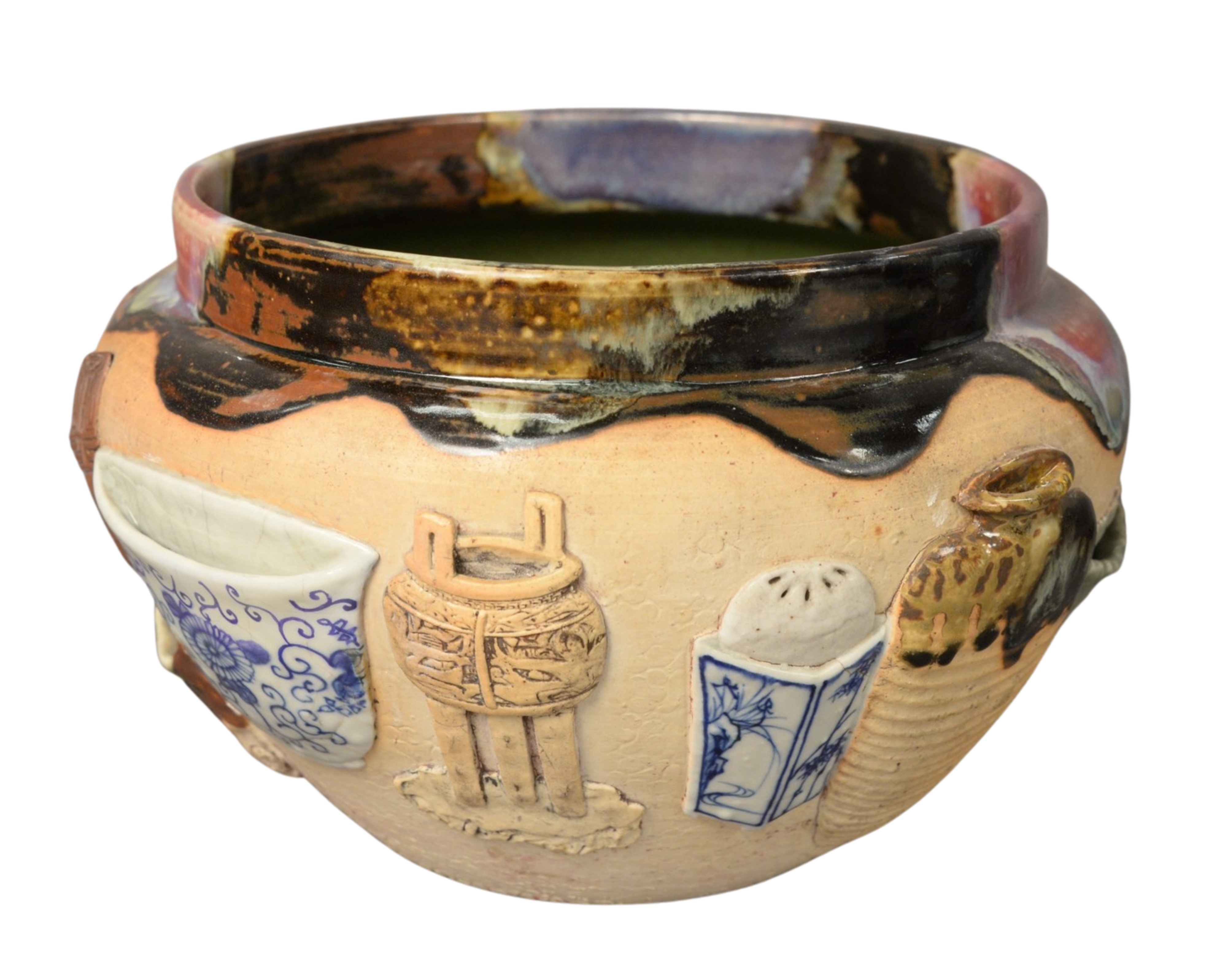 Japanese Ceramic Jardiniere having green interior glaze and multicolor exterior glazes having miniature ceramic vessels mounted along the body, height 7 1/2 inches, diameter 9 inches.