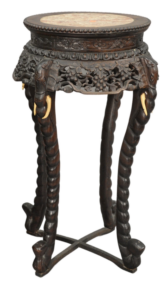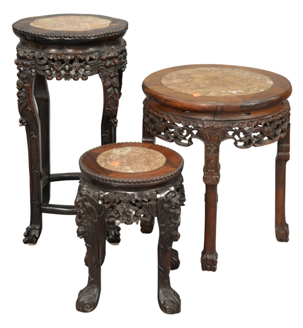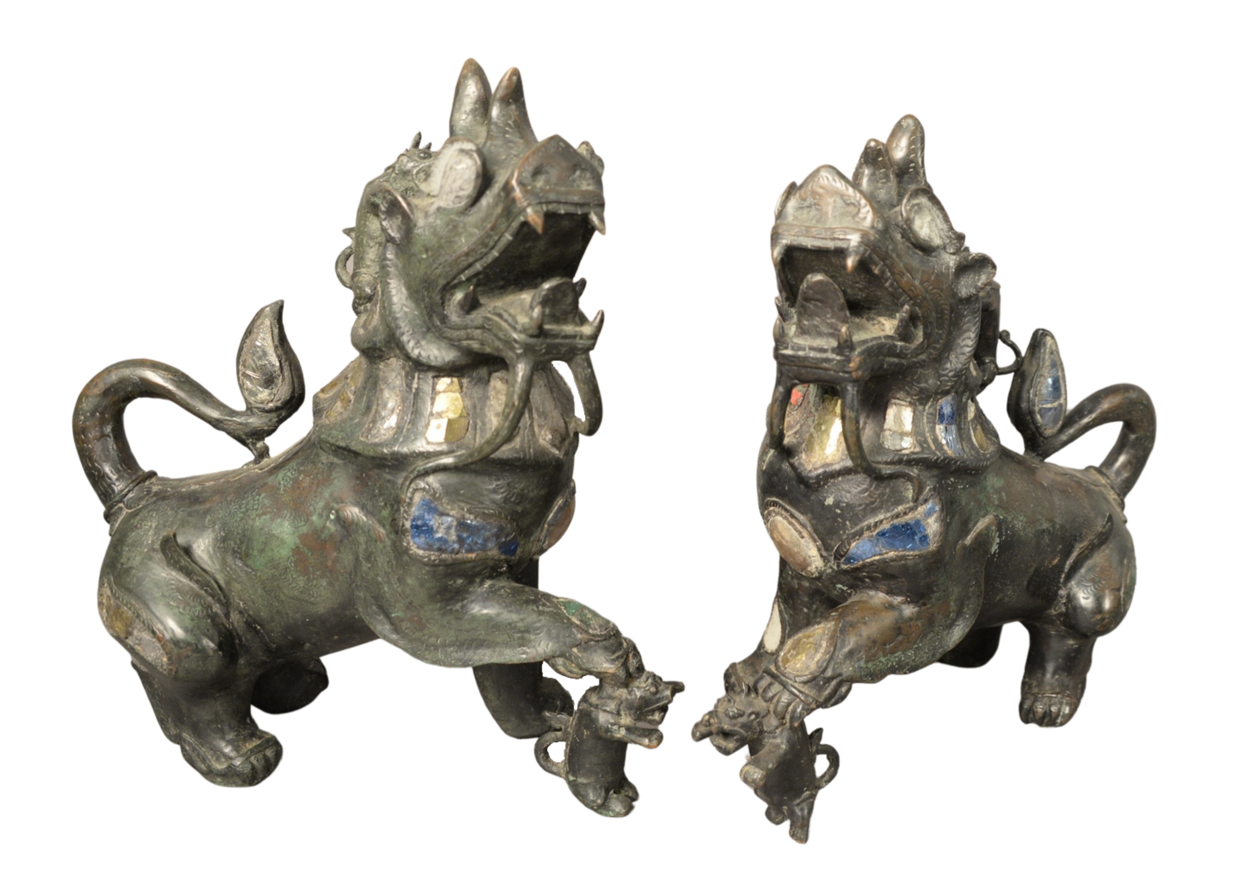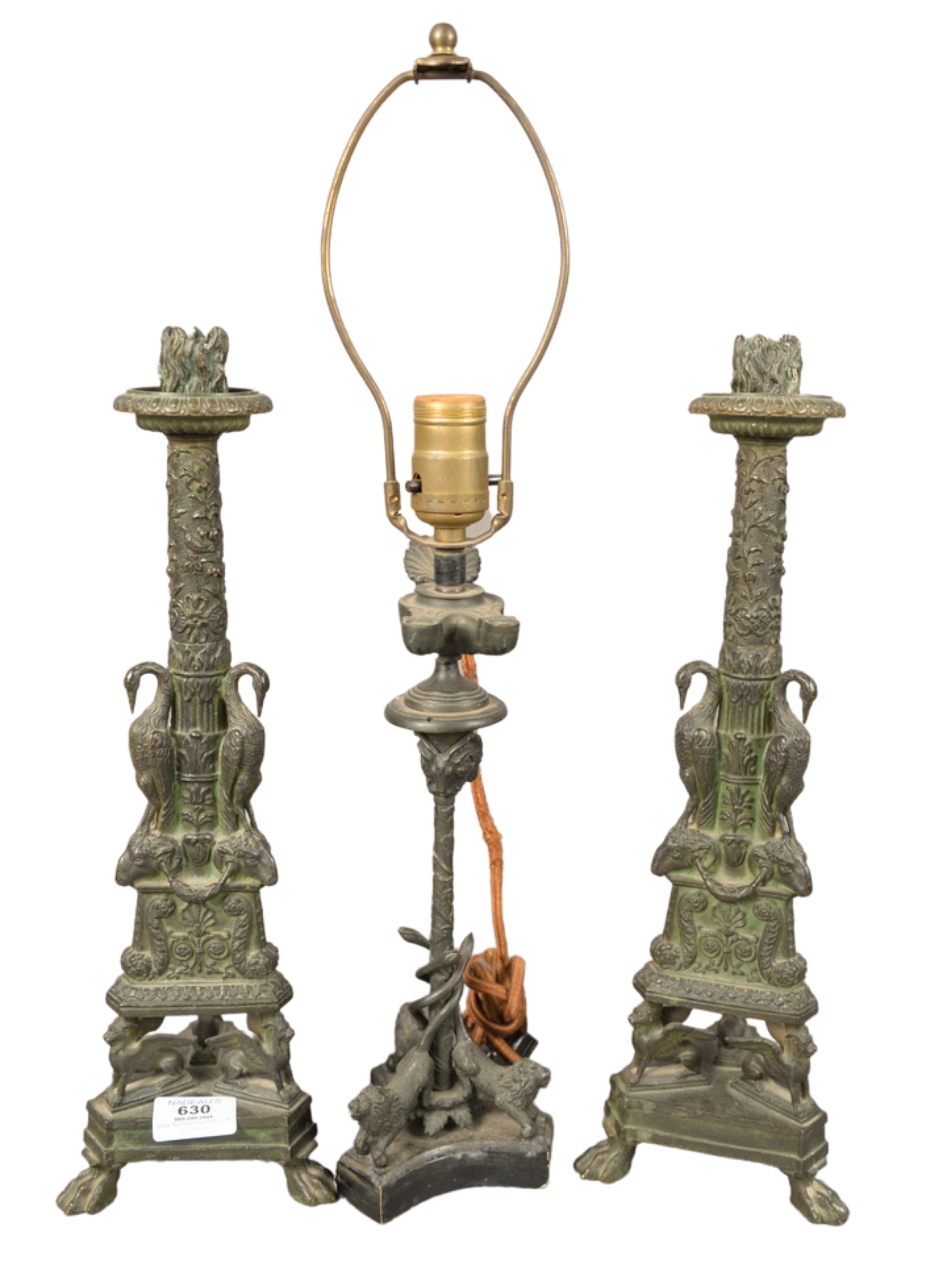 Three Piece Lot to include a pair of bronze Grand Tour candlesticks both having cranes and winged lions on the base and ending in paw feet along with a bronze table lamp having rams head, serpents, and lions, mounted on a faux marble base, height of candlesticks 16 inches, lamp height 21 inches.