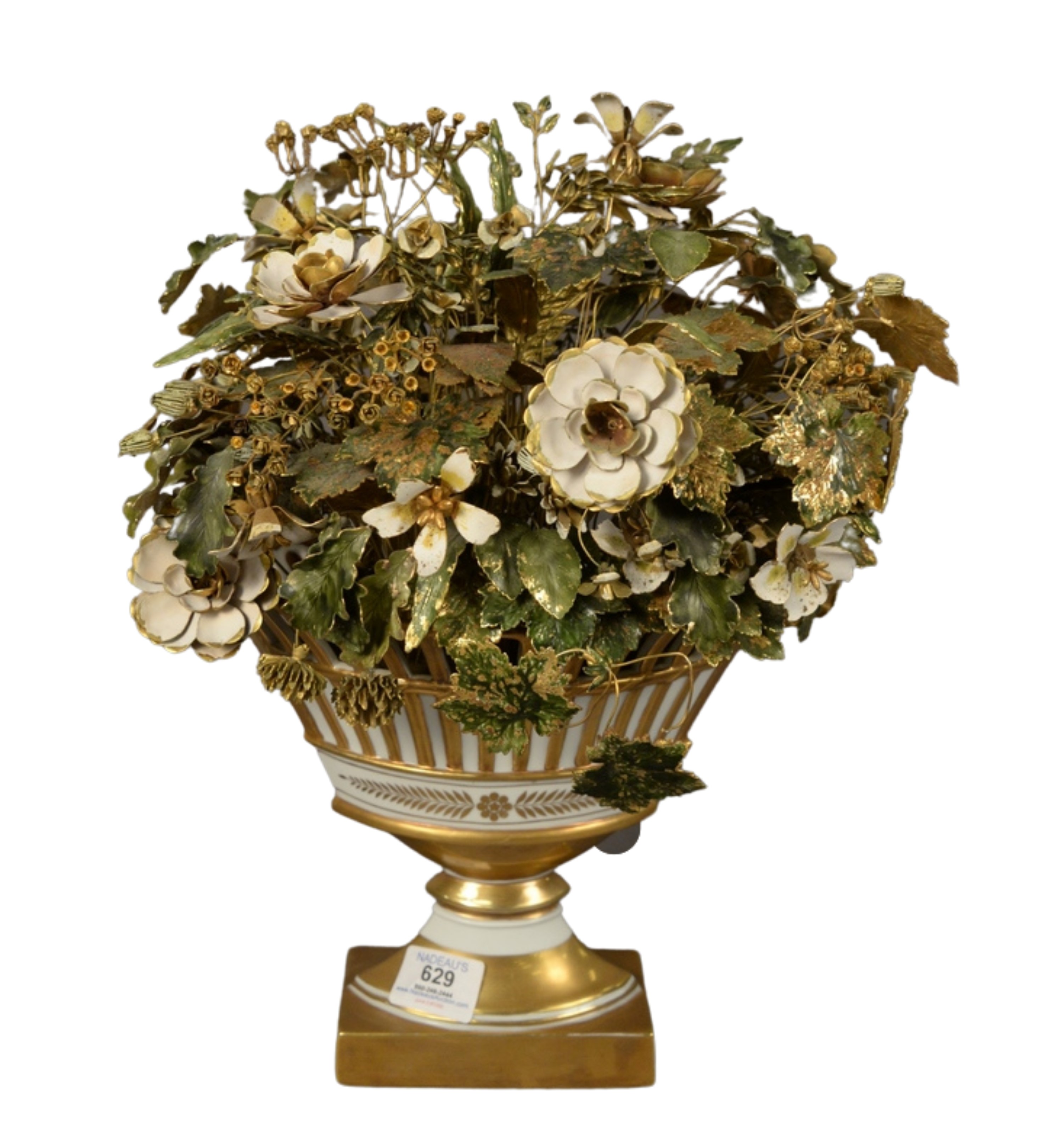 Gorham Gilt Metal and Enamel Floral Arrangement in Porcelain Vase, designed by Jane Hutchinson, marked to the underside, height 16 inches, width 11 inches, depth 9 inches.
