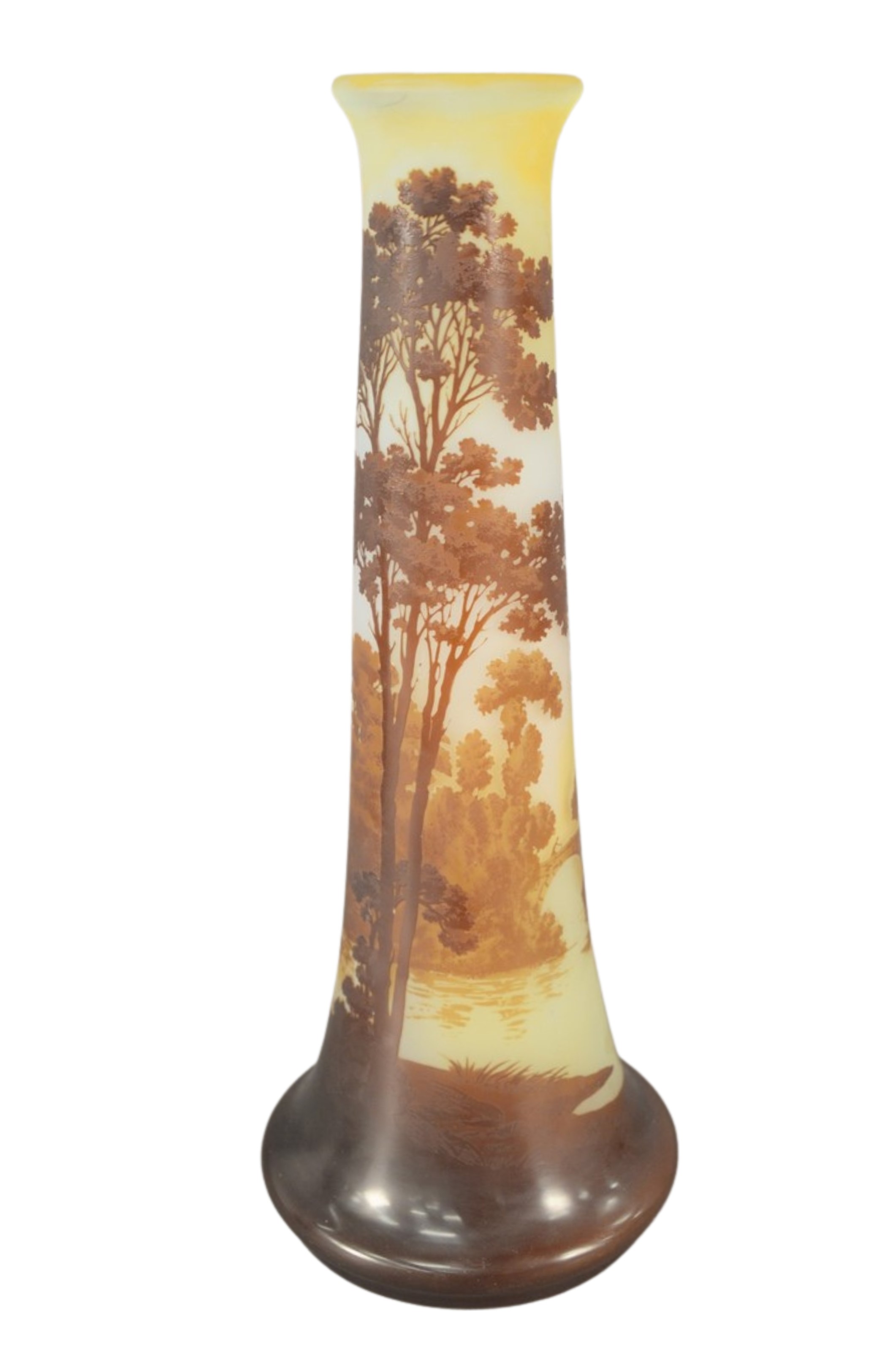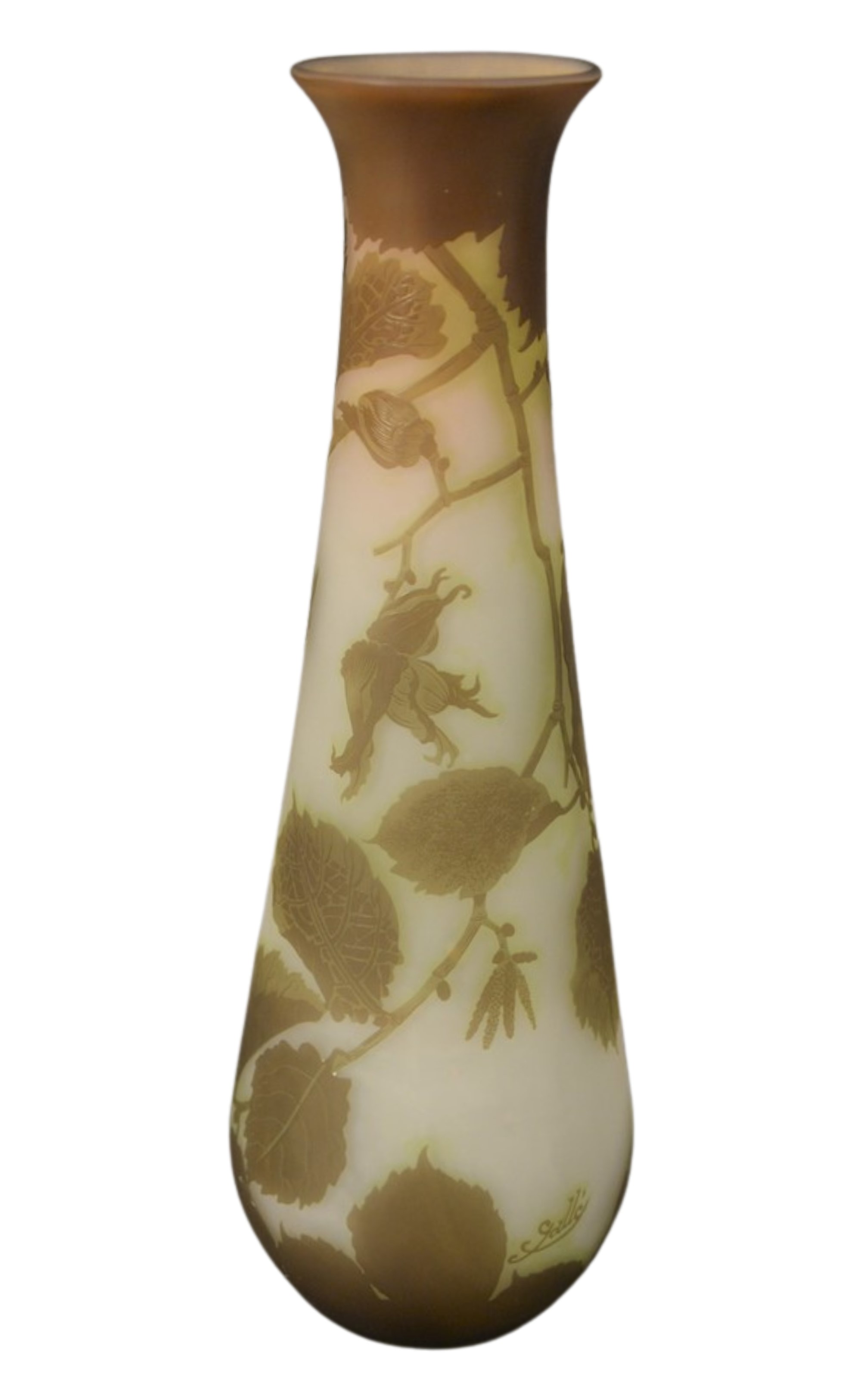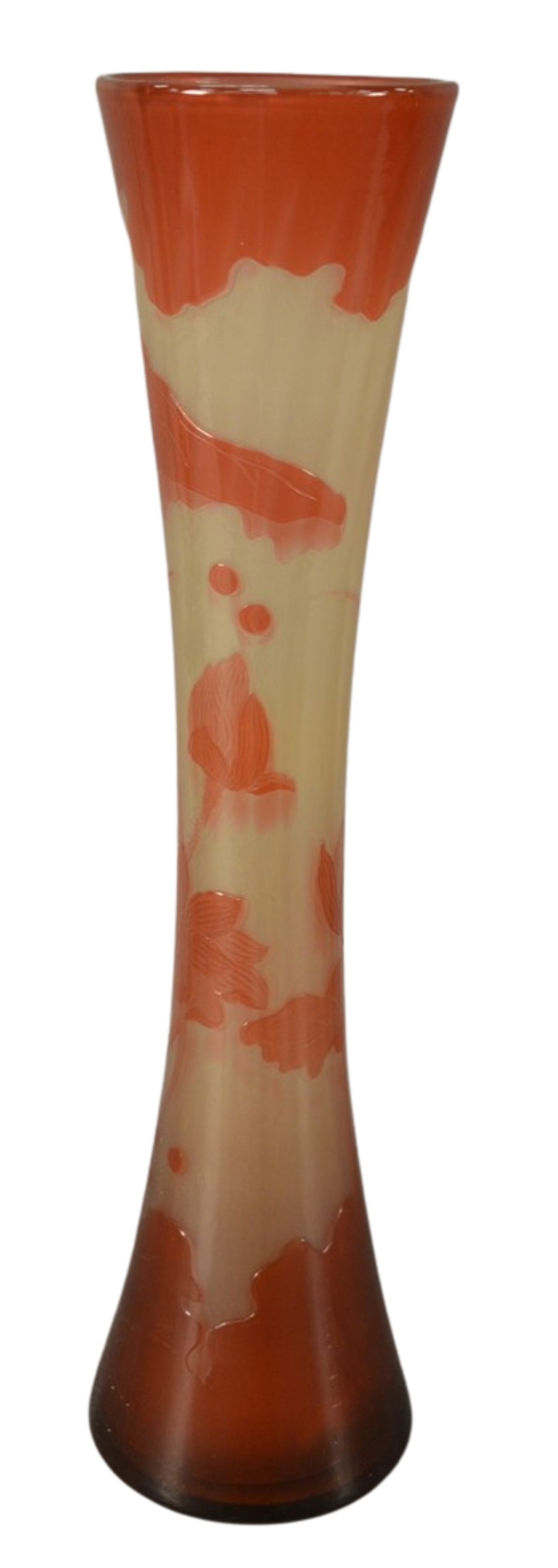Emile Galle Monumental Verresic Parlante Fire Polished Overlay Glass Vase, having broad neck over globular body and naturalistic lotus blossom pattern, inscribed ‘Bonhear and Galle’ in cameo, height 14 inches.