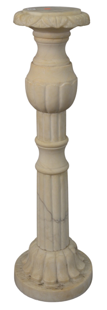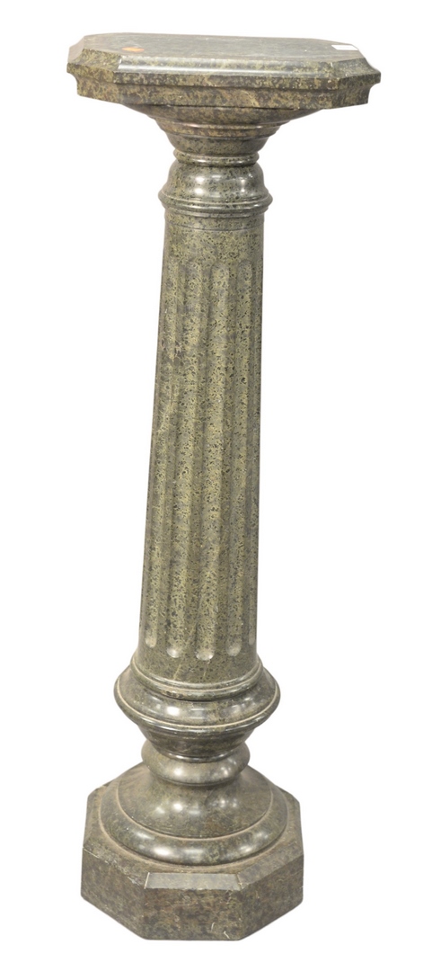 Contemporary Server, having etched, carved marble top over three drawers and four doors, flanked by shelves on each side, height 34 1/2 inches, width 24 inches, length 84 inches.