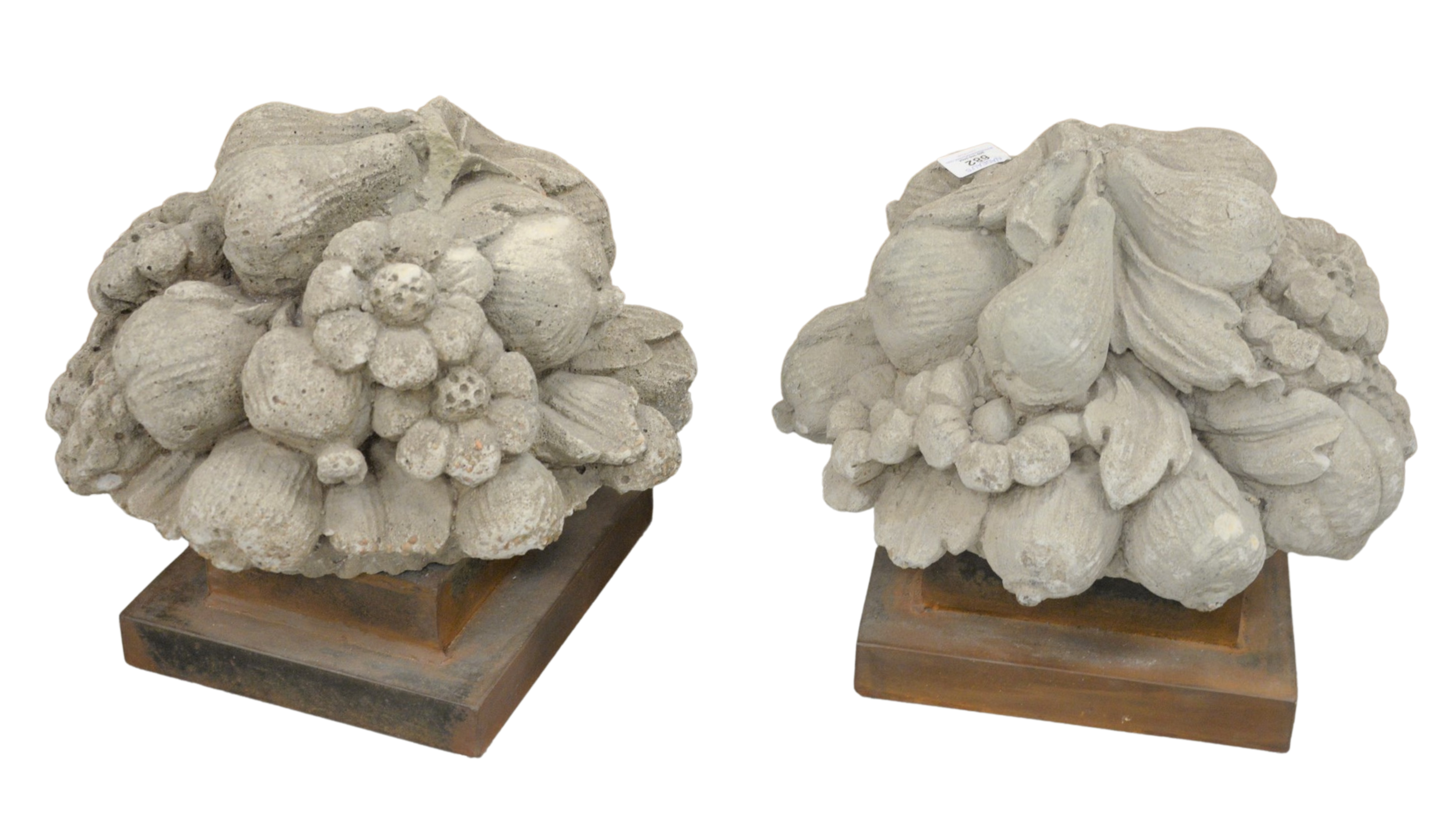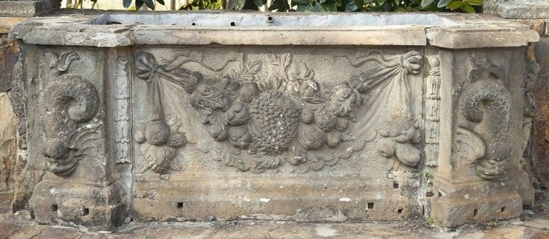 Five Part Limestone Garden Wall, having dolphin and putti ends, wall with fruit, 18th century or earlier, extremely heavy, several hundred pounds/no delivery, not currently assembled largest slab height 39 inches width 62 inches.