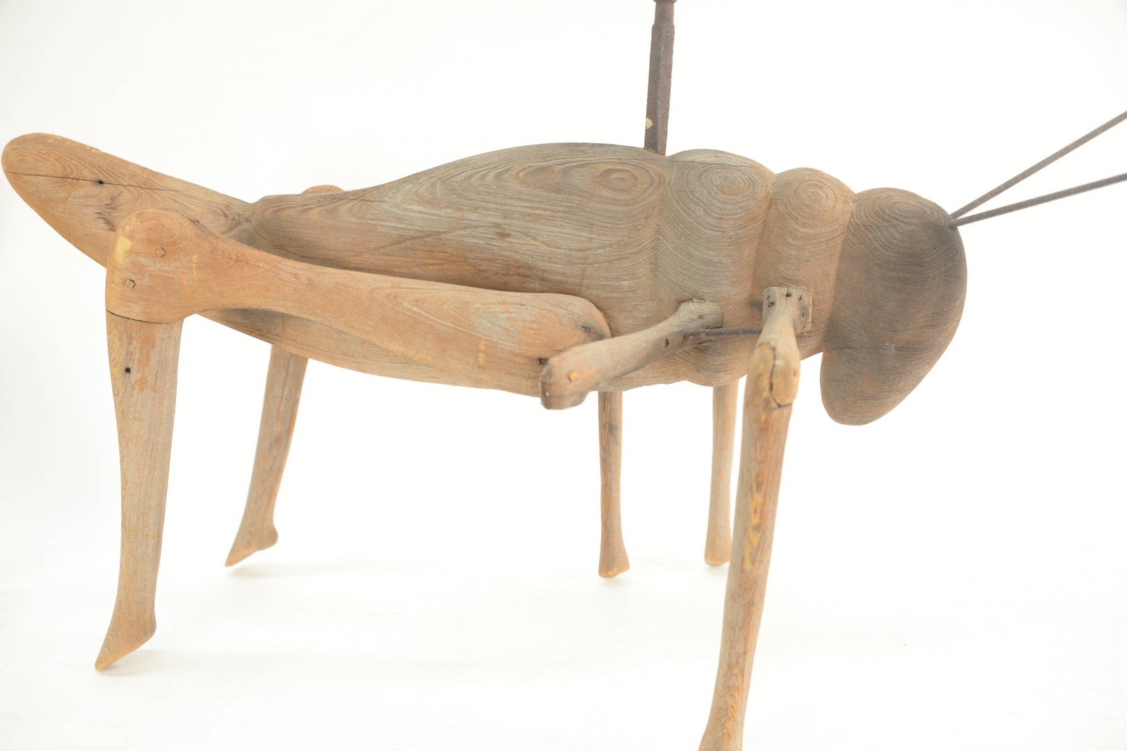 Carved Folk Art Grasshopper Weathervane, having carved and weathered wood body and metal lighting rod, early to mid 20th century, height 25 inches, width 14 inches, length 34 inches.