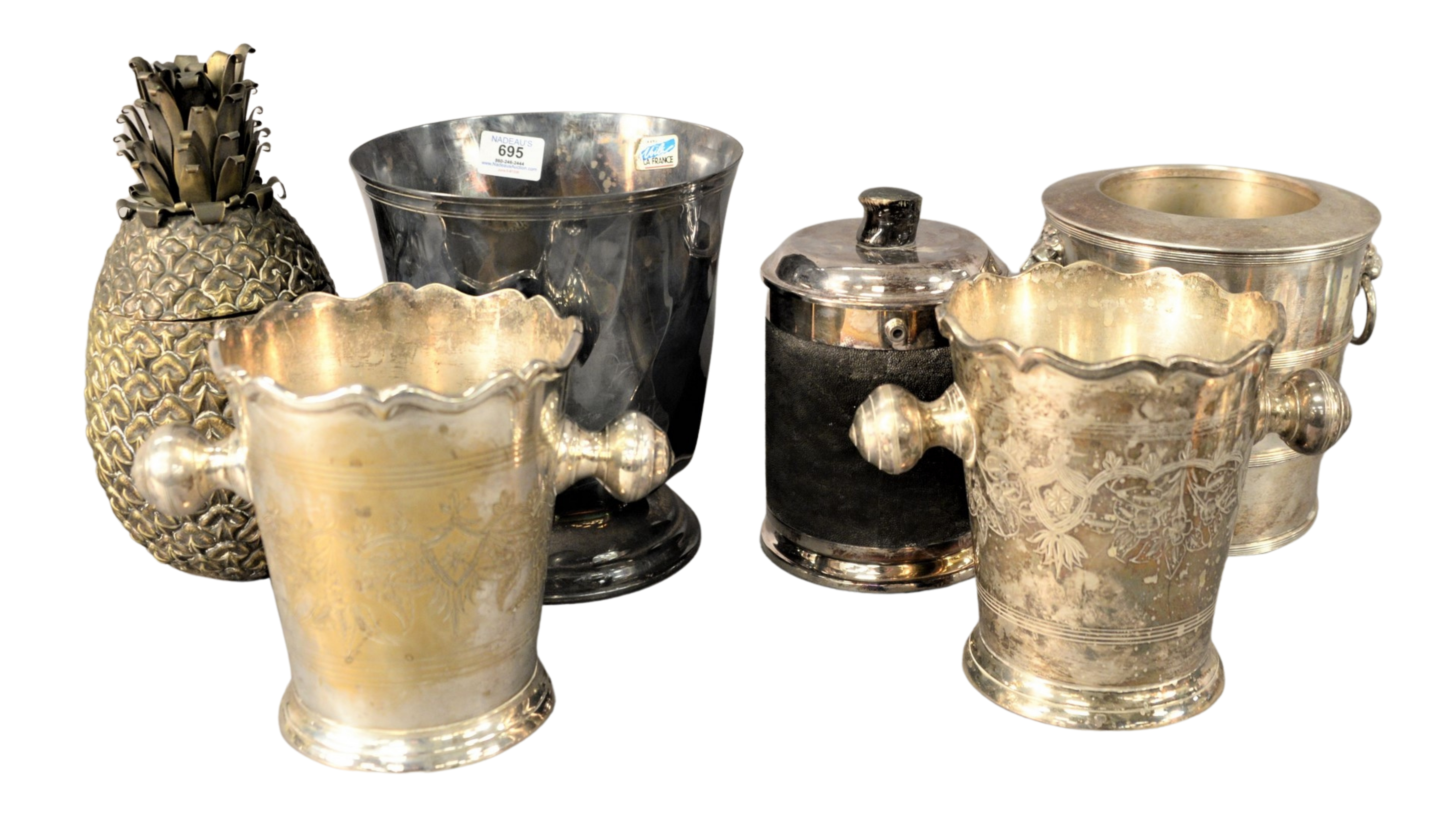 Six Piece Lot of Barware to include Christofle vessel Alpaca pineapple form ice bucket pair of silvered ice buckets marked ‘India’ silvered ice bucket with lion form handles along with a silver plated Royal Sable ice bucket.
