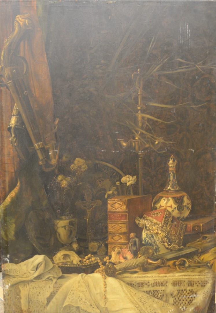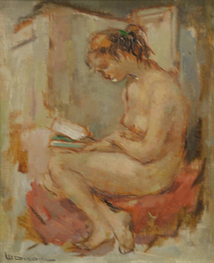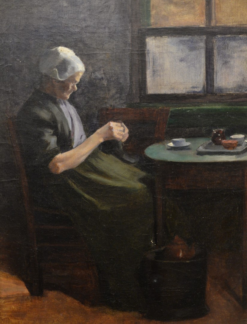 American School early 20th century, Woman at the Table, oil on canvas, unsigned, 22 1/2 x 17 1/4. Provenance: Wally Findly Galleries label adhered to the backing board.