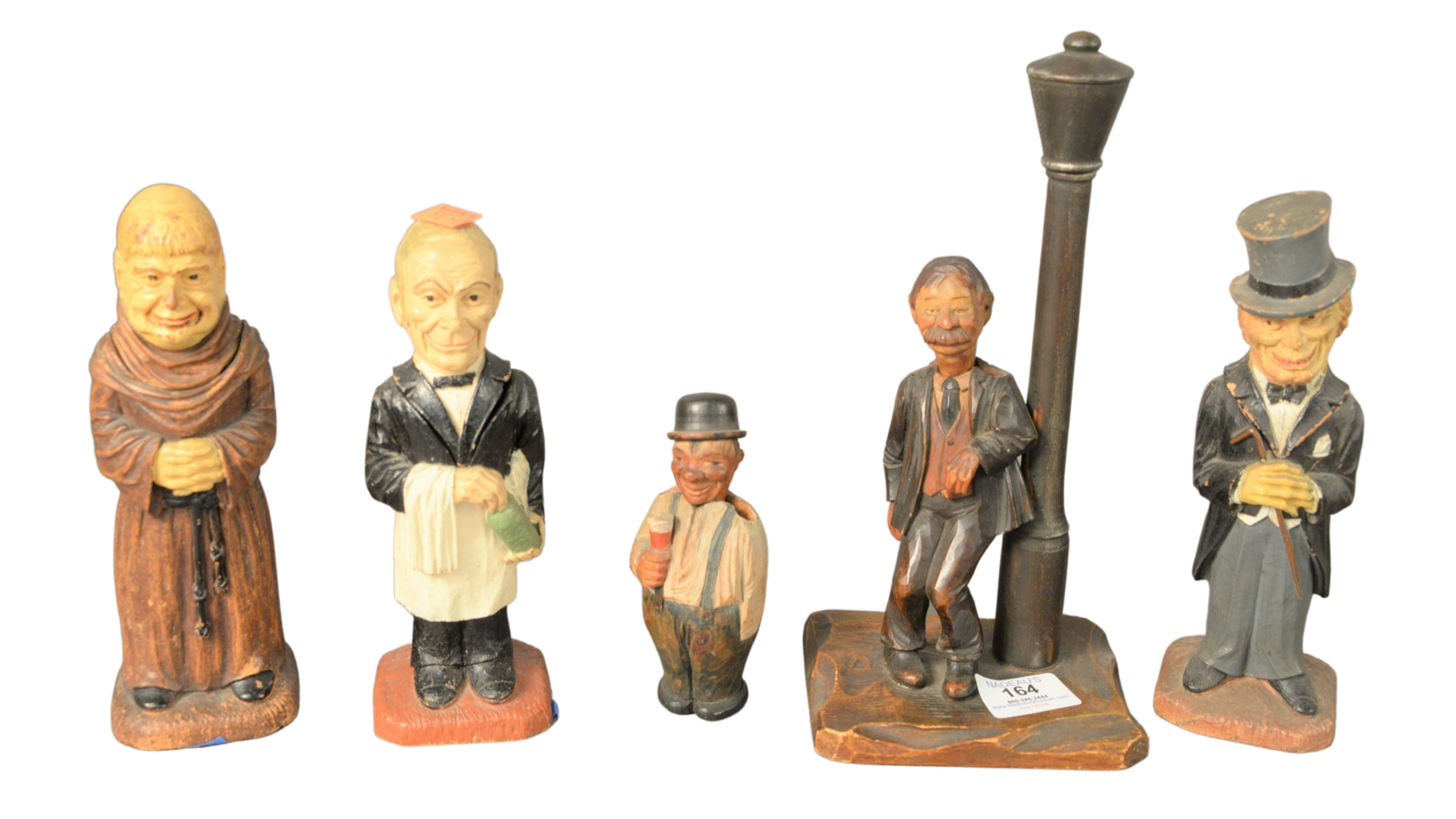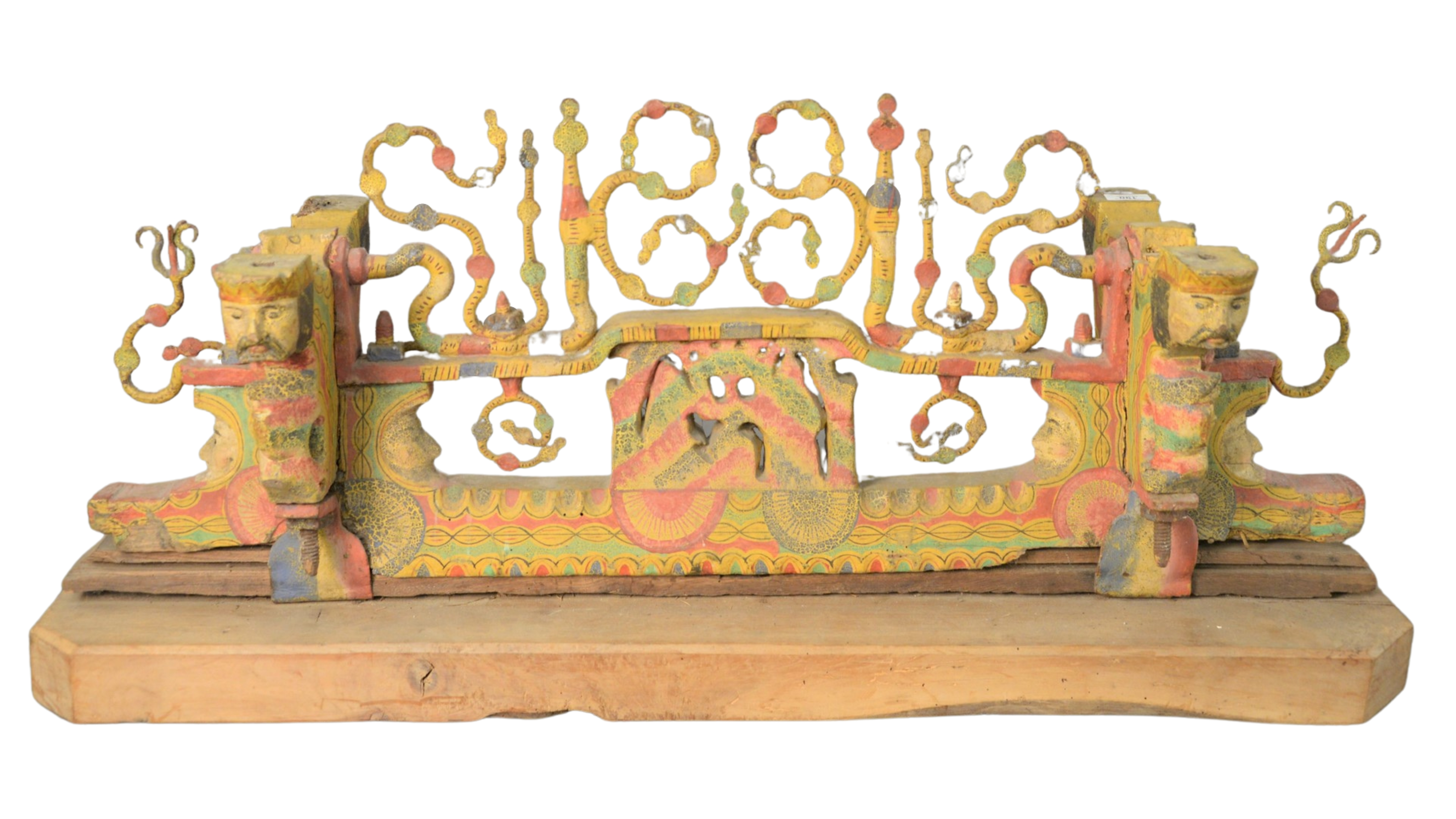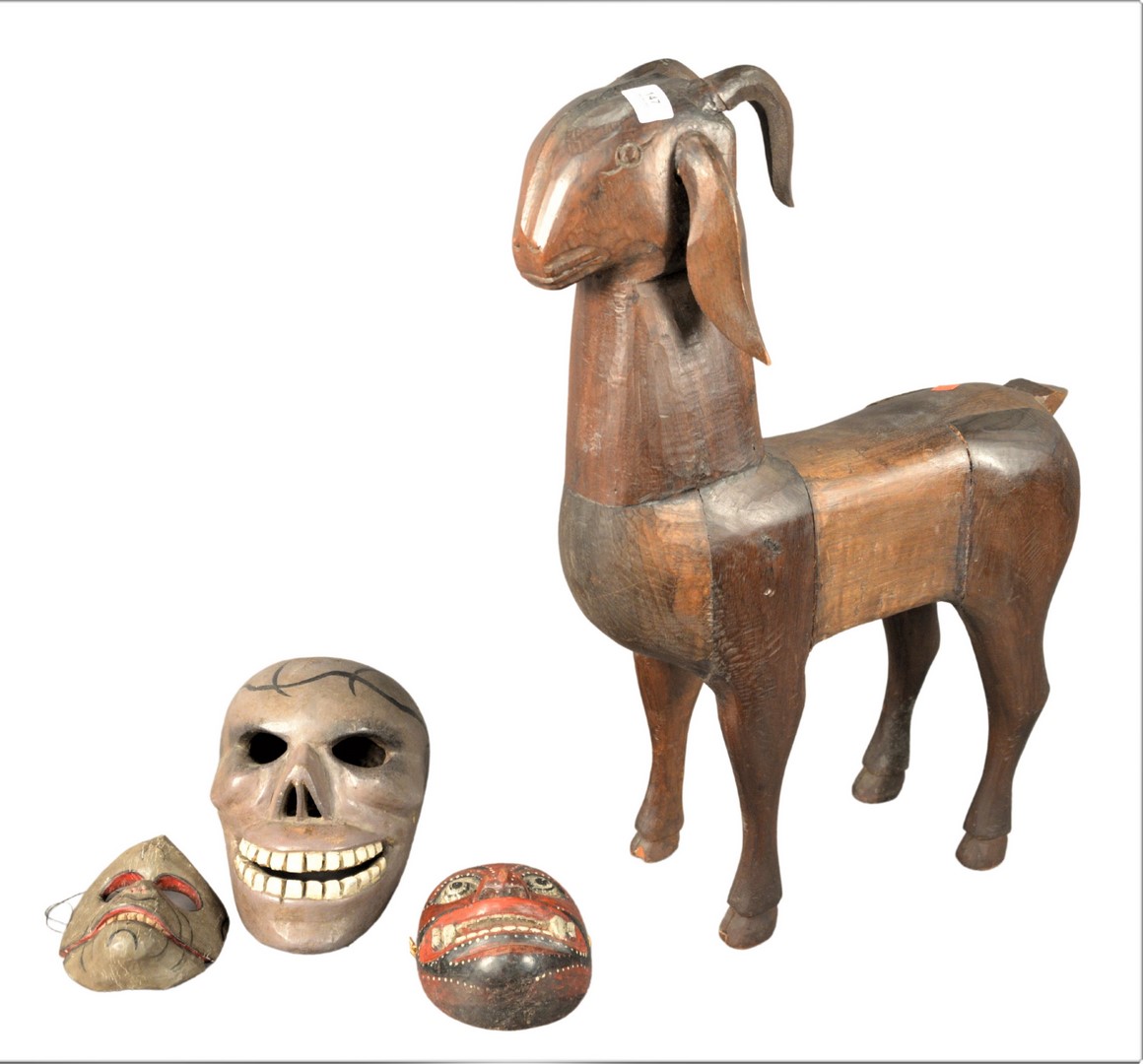 Four Piece Group, to include large wood carved goat with repairs and loss to the front left hoof, unsigned, height 29 1/2 inches along with three carved and painted masks, height 11 1/2 inches, depth 7 inches.