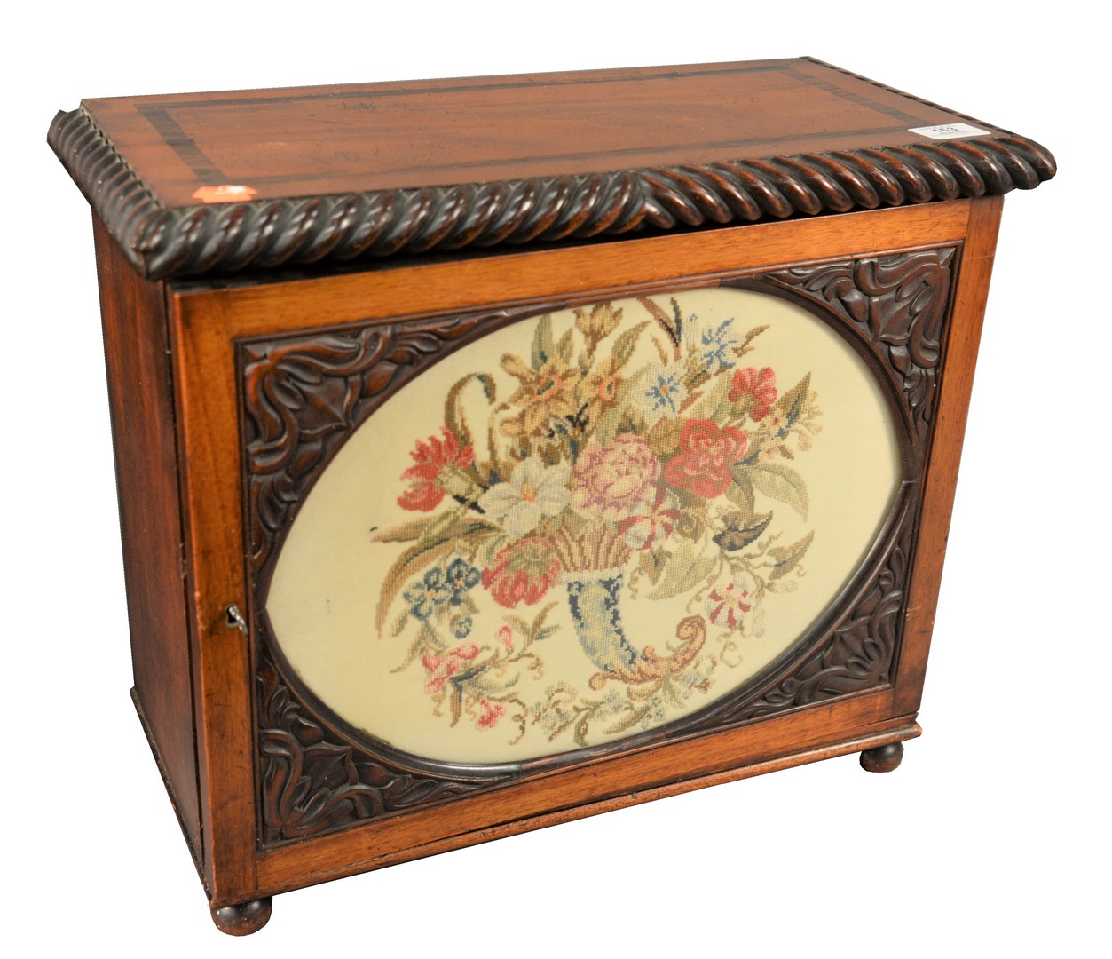 English Regency Collectors Cabinet, having one door with needlepoint panel, opening to two over two over three drawers, all on ball feet, 19th century, height 16 1/2 inches, width 19 1/2 inches, depth 9 1/2 inches, drawers full of shells.