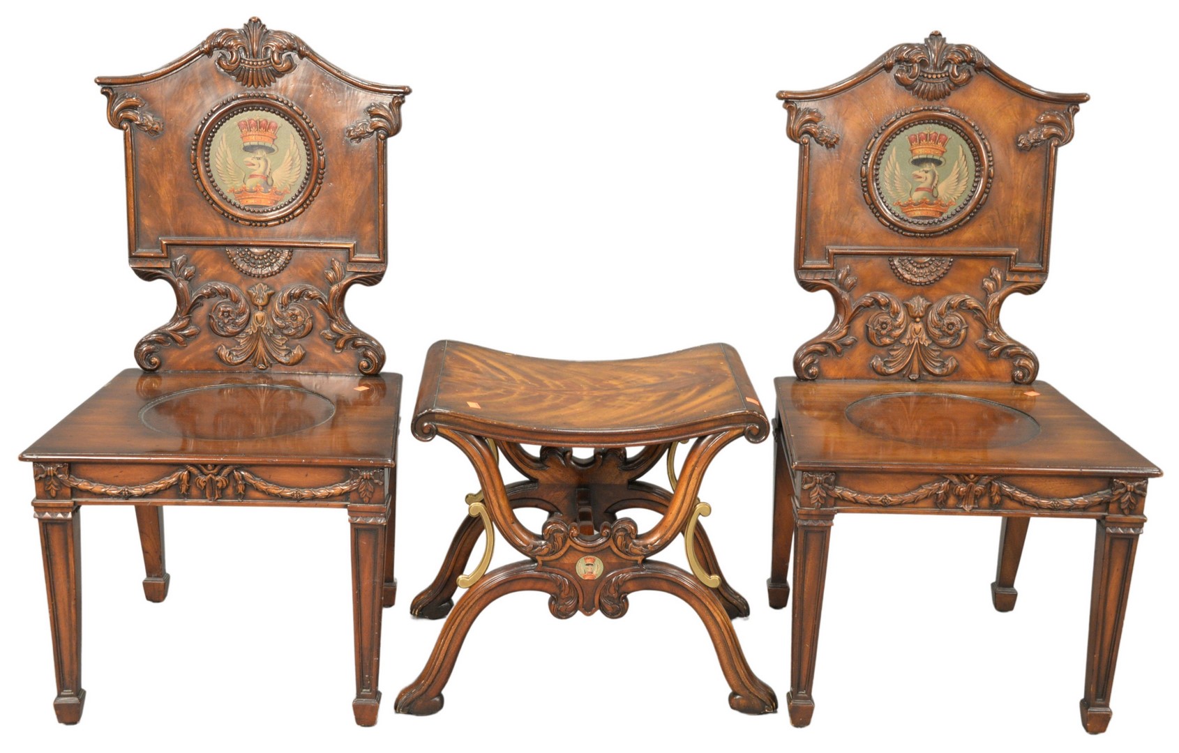 Charles Spencer Three Piece Lot, to include a pair of carved and painted side chairs, along with a matching bench, all signed on back, chair height 40 inches, bench height 19 inches, length 21 inches.