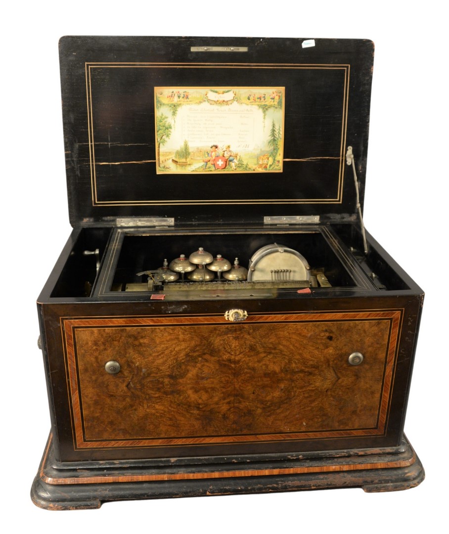 Large Swiss Cylinder Music Box, having inlaid burl case, fitted with six bells and drum, height 15 inches, width 25 inches, depth 18 inches, teeth missing/not working as is.