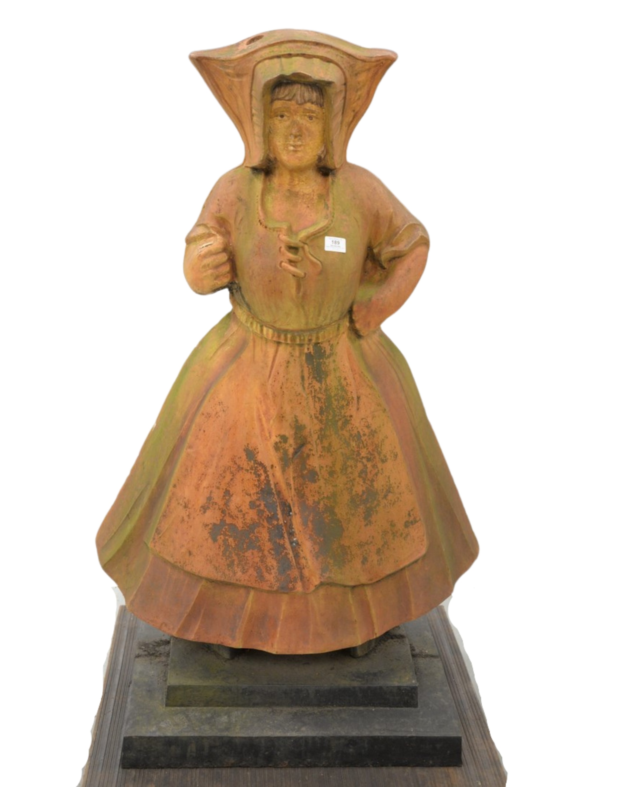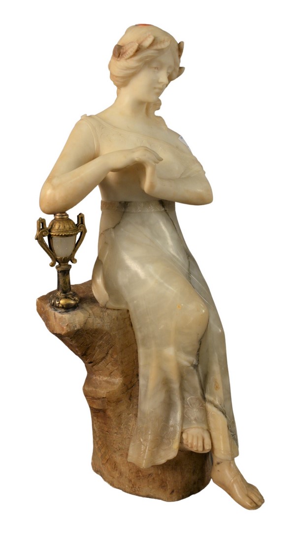 Carved Alabaster Female Figure, seated on a rock with a mounted light post form, also having incised floral details on her dress, height 24 1/2 inches, width 9 inches, depth 10 1/2 inches, repaired.