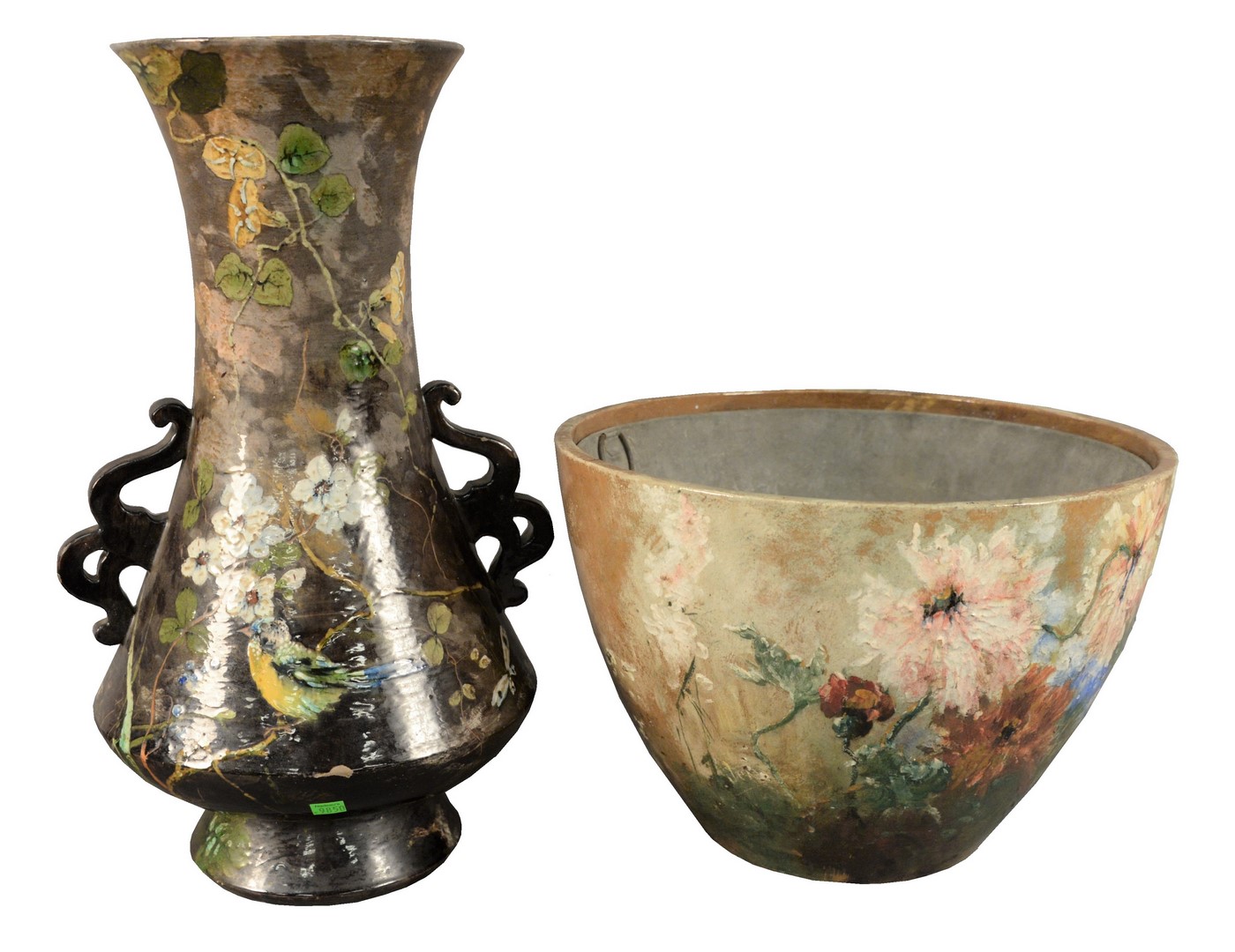 Two Large French Faience Pottery Pieces, to include vase with handles having painted bird and flowers, marked Lappin on the underside, height 16 inches along with a large planter having painted flowers and metal insert, height 11 1/4 inches.