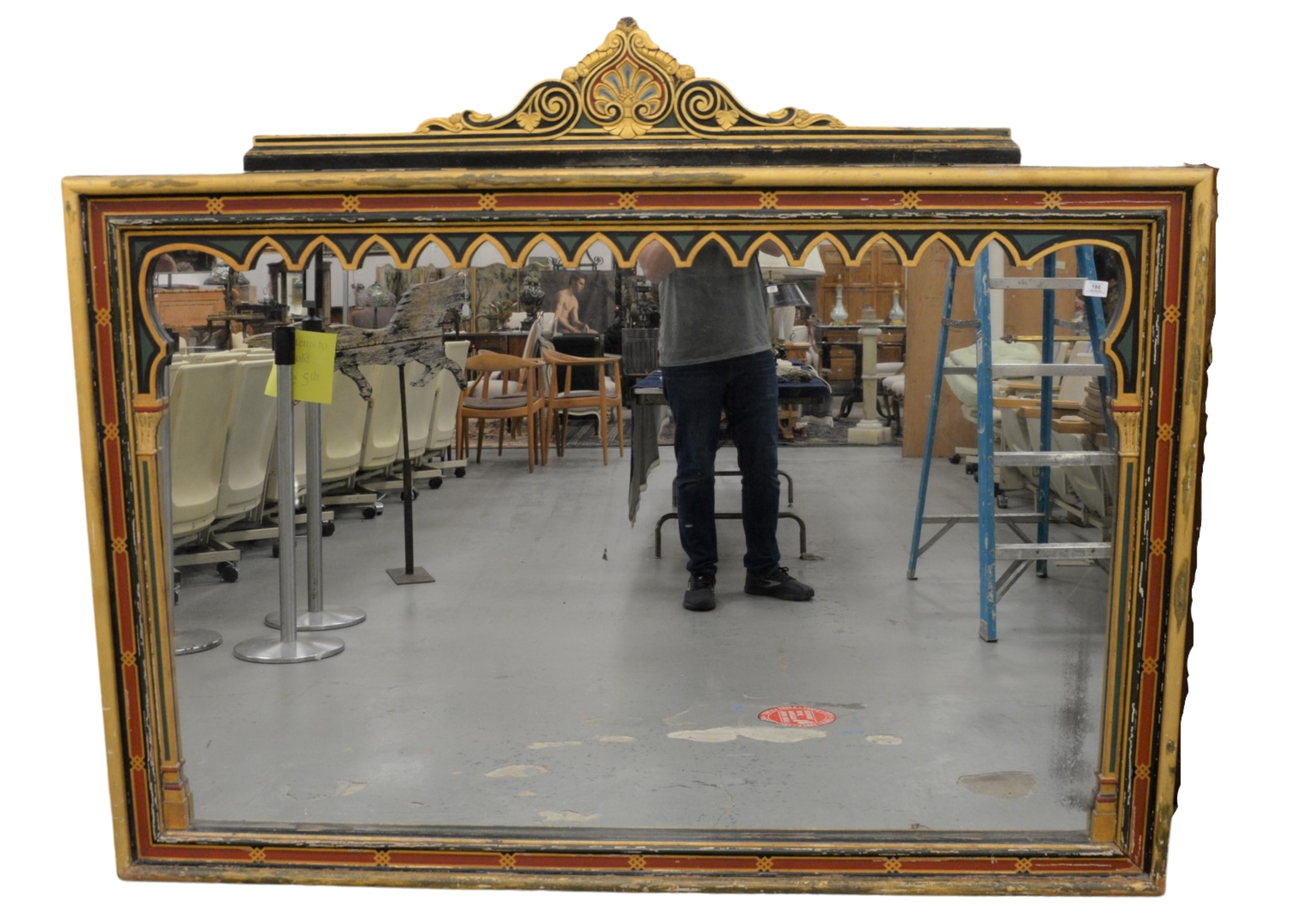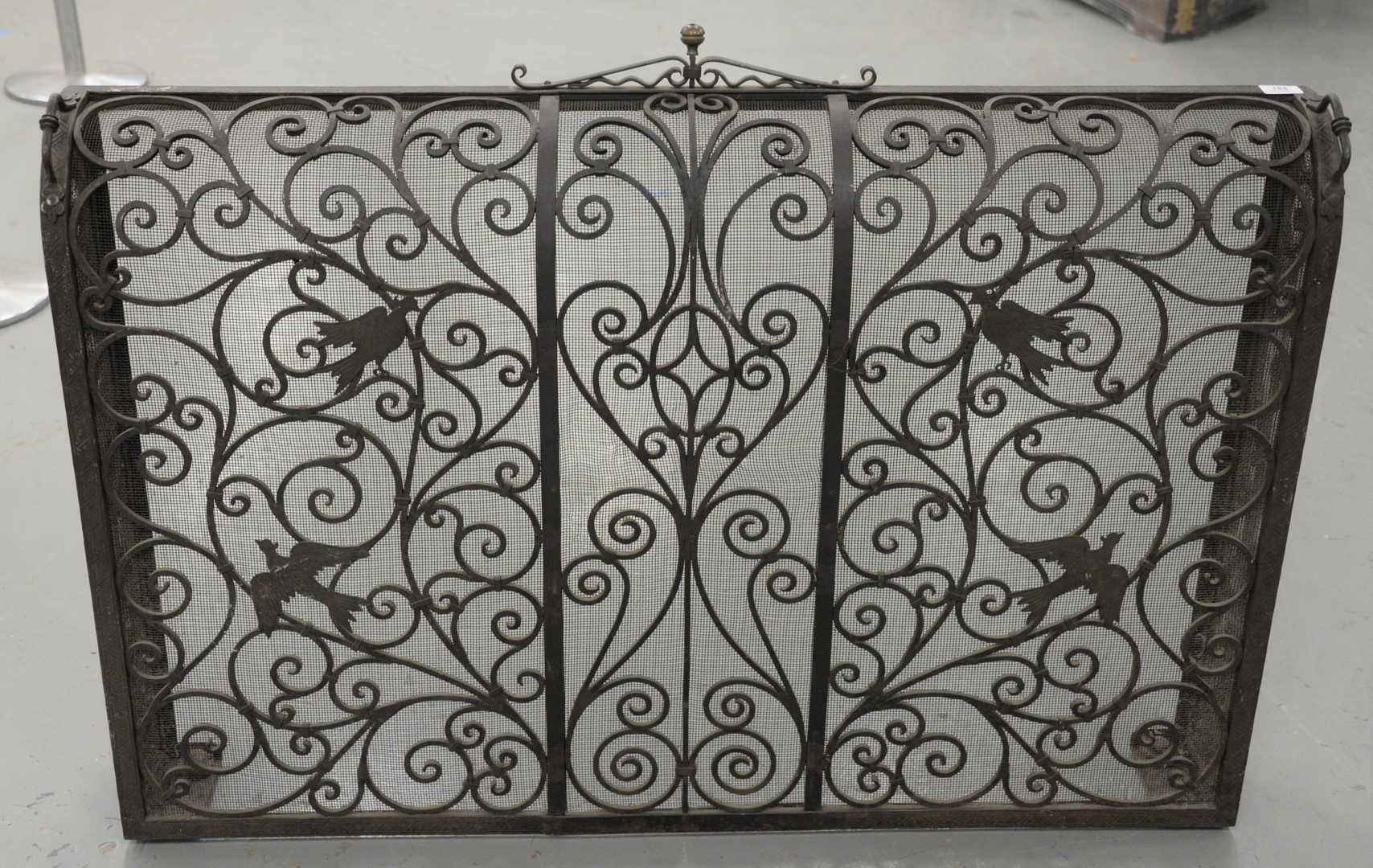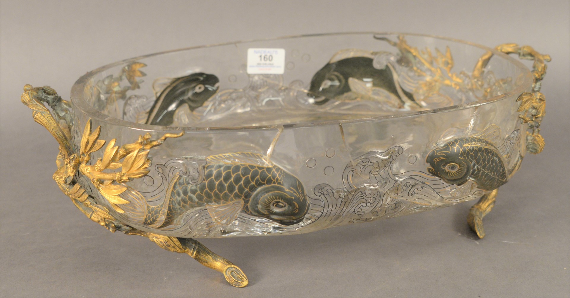Escalier De Cristal Center Bowl, mounted with gilt bronze enameled fish with waves, height 5 inches, length 18 1/2 inches, width 11 1/4 inches, cracked on all sides.
