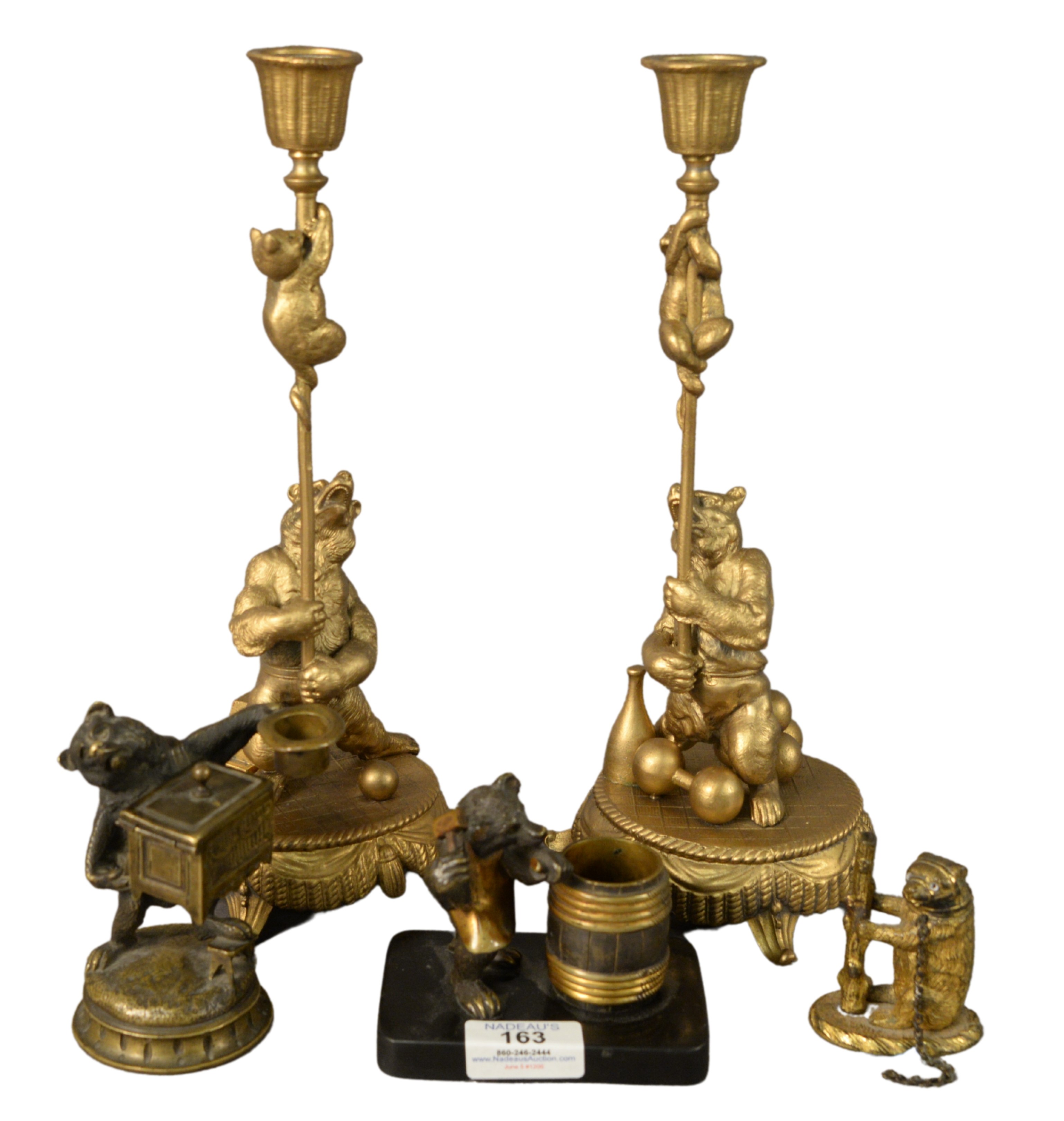 Five Piece Group of Bronze and Metal Bears, match strikes or safes, along with a pair of candlesticks in the form of a circus act with bears, height 4 1/2 inches, width 4 inches.