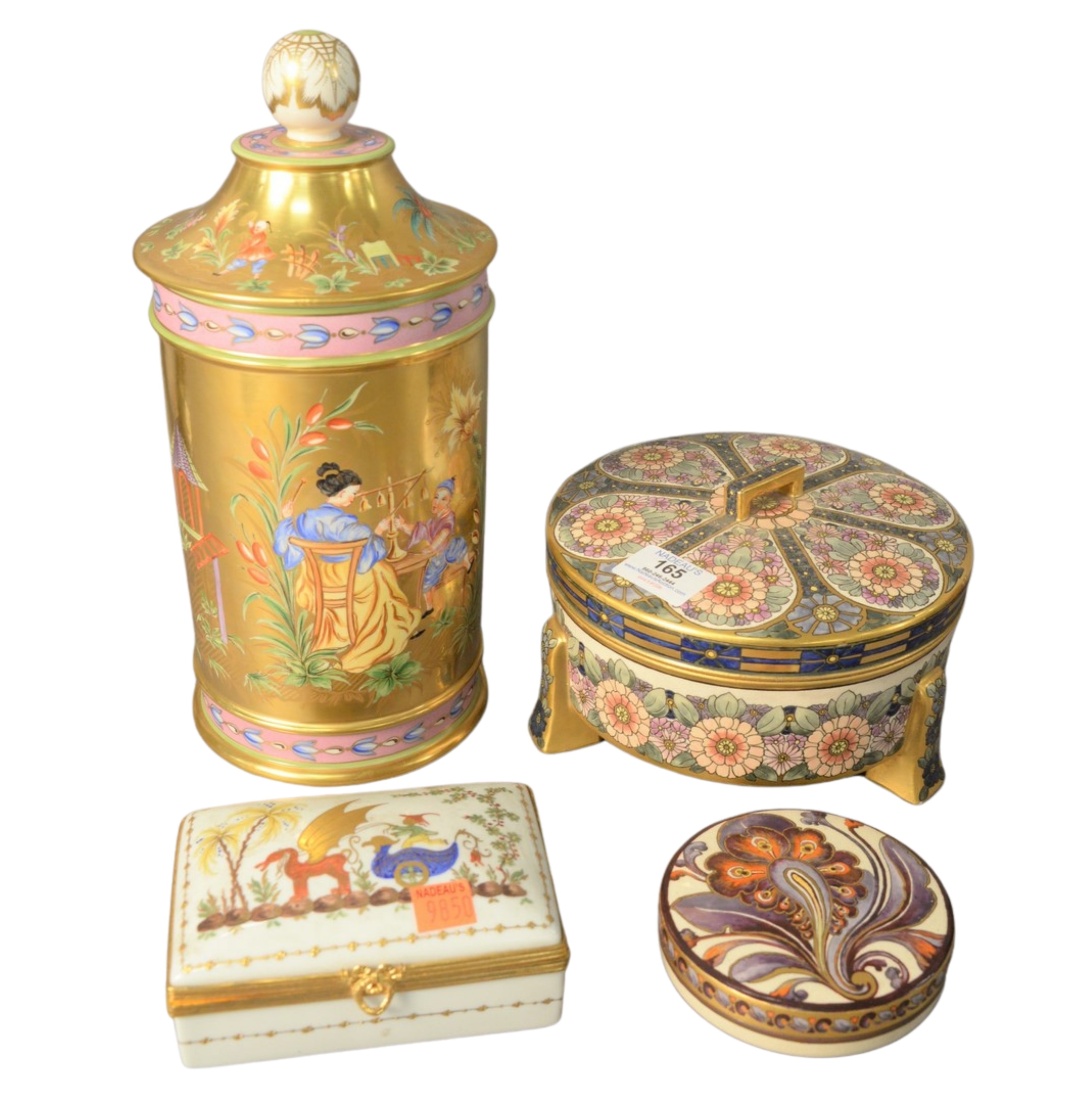 Four Piece Group of French Porcelain Covered Boxes and Vessels, to include a footed and covered bowl, having foliate and gilt decoration, signed CB Turnbull 1916 a Helen Frazee covered dresser box having gilt and floral decoration, signed to the underside along with a covered jar having gilt and Japanese decoration, inscribed in French to the underside along with a Tiffany Private Stock trinket box, height 12 1/2 inches, diameter 6 inches.