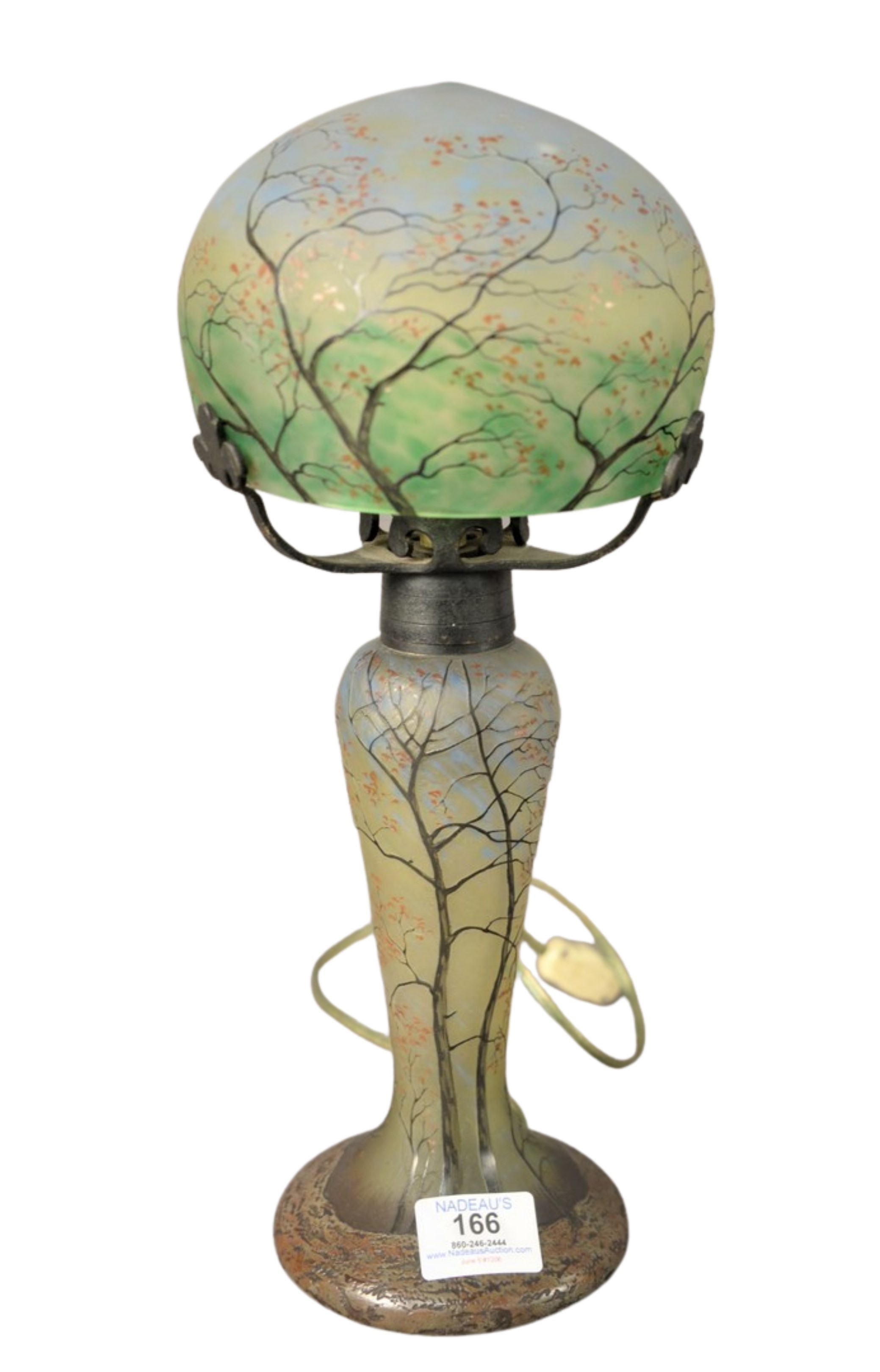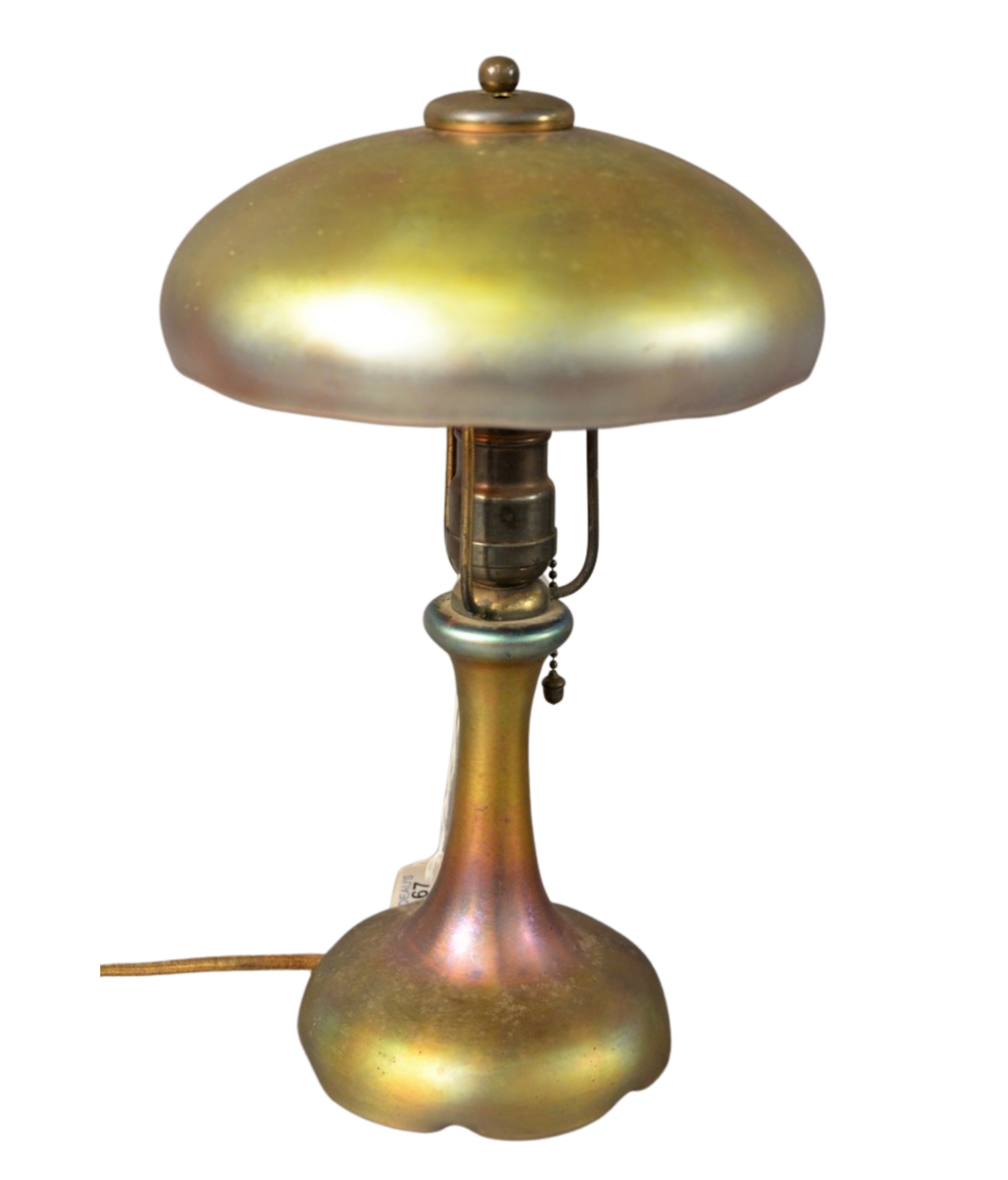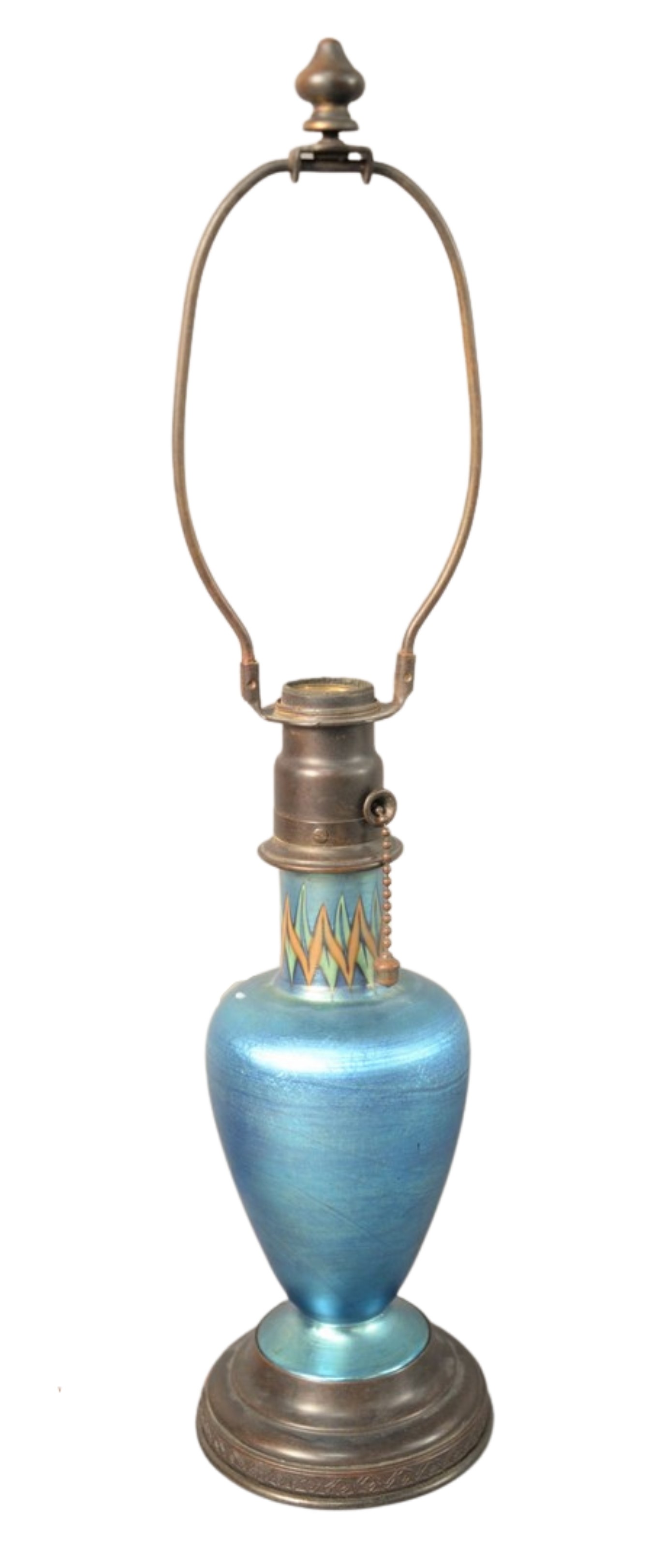 Small Tiffany Art Glass Table Lamp in Tel-el Amarna Pattern, having blue aurene iridescent vase on bronze base, having bronze fittings, bronze base marked: Louis C. Tiffany Furnaces, Inc. 175 total height 18 1/2 inches.