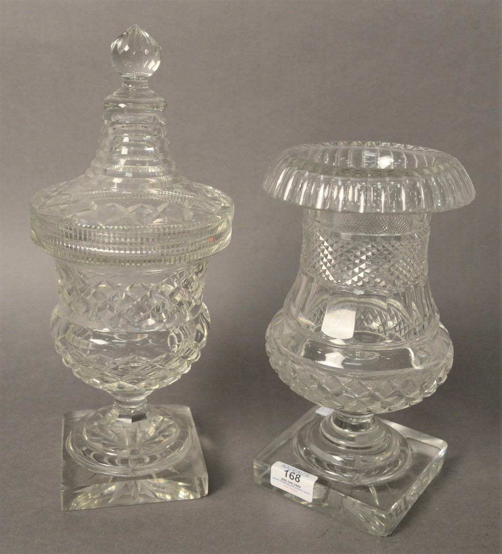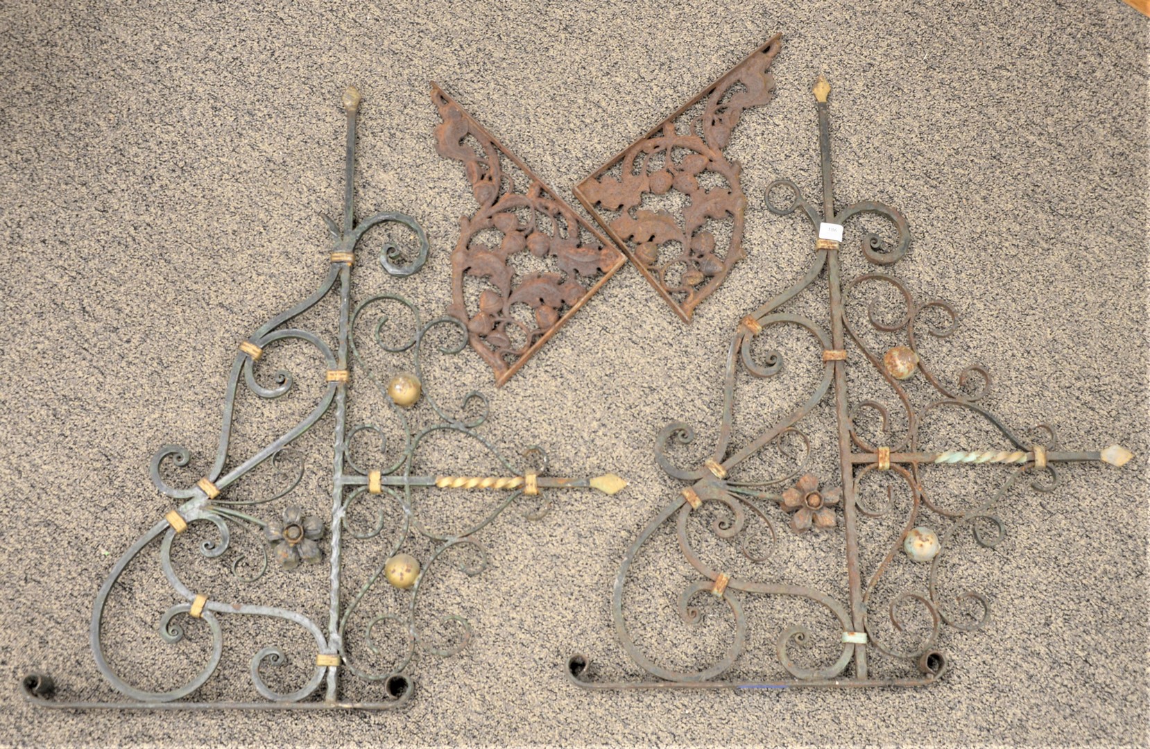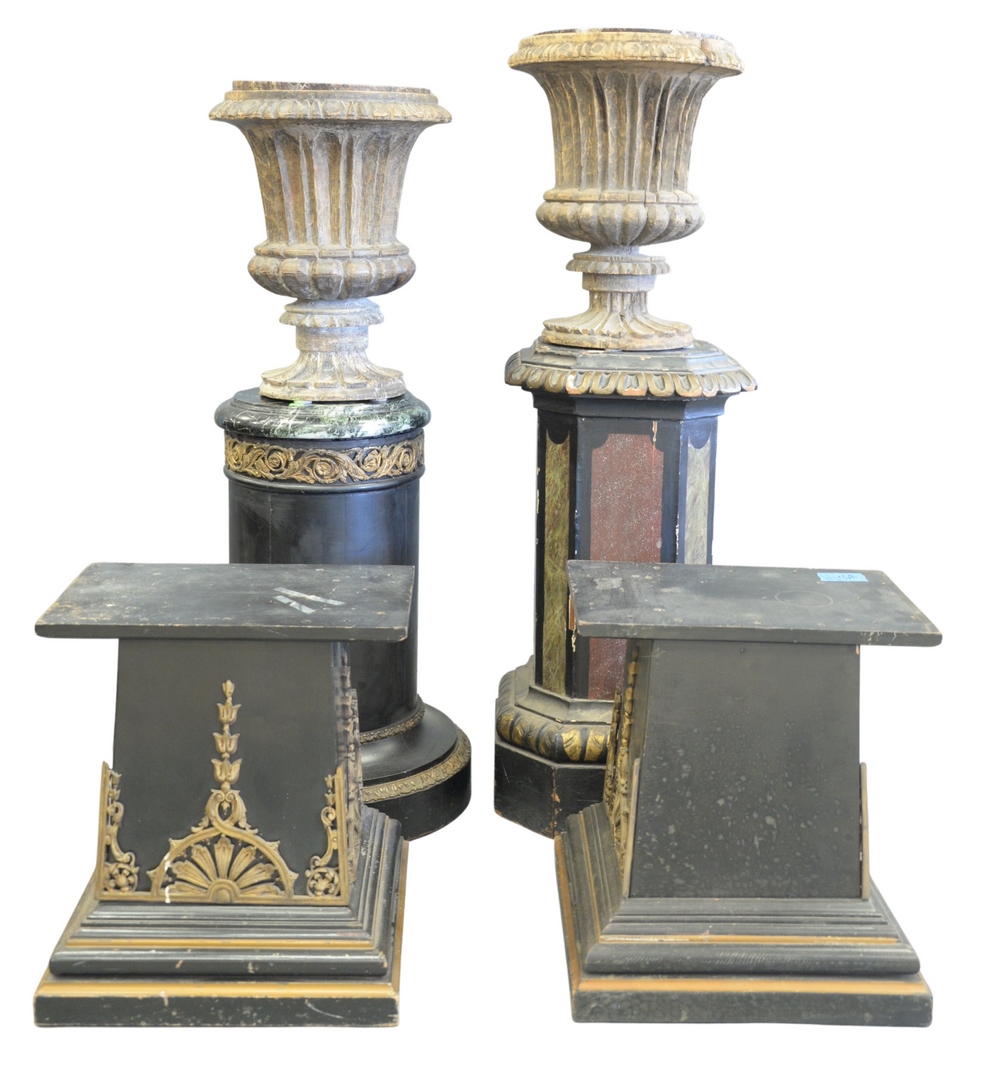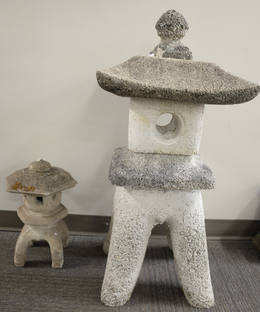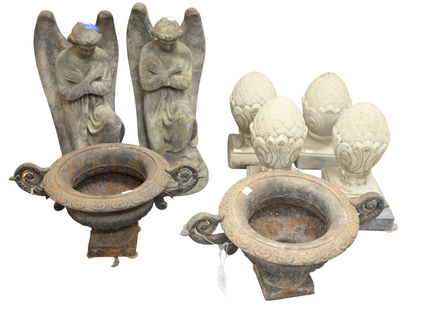 Eight Piece Group, to include four cast concrete garden finials, height 13 1/2 inches, width 8 1/4 inches a pair of garden angels, height 21 inches a pair of small cast iron garden urns, width 12 1/2 inches.