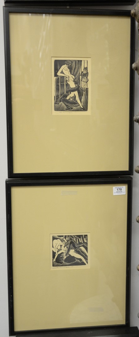 Eric Gill British, 1882 – 1940, five erotic woodcuts on paper to include Lovers in Tent, 1929 The Thorn in the Flesh, 1921 Lovers The Raised Bottom, 1934 Lovers, 1924, along with one untitled four signed, titled, and dated in pencil through the lower margin.
