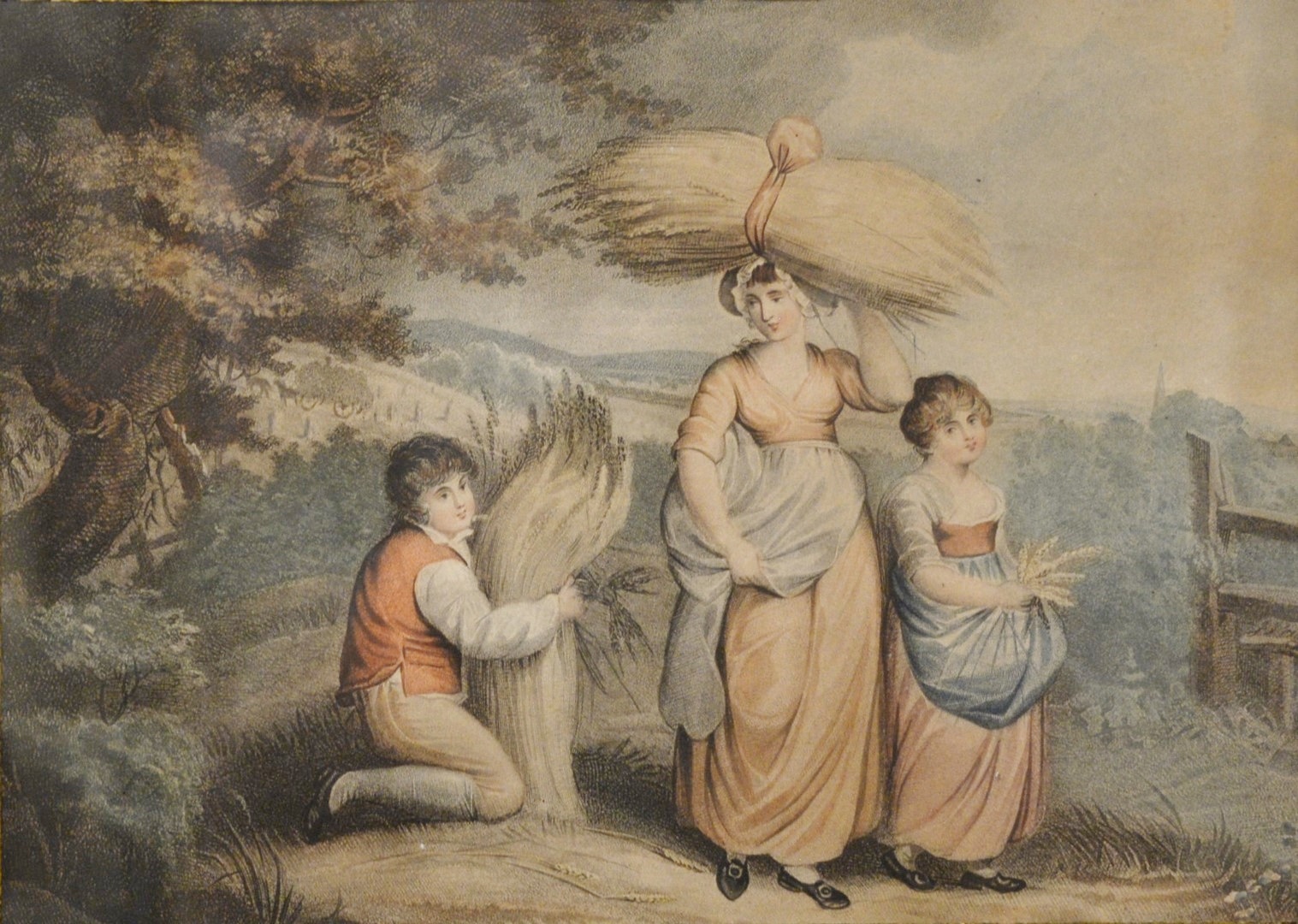 Two Hand Colored Prints, in matching frames, one with three figures carrying hay along with two figures carrying sticks with a dog and a village in the background, inscribed J. Jensen image 13 x 17.