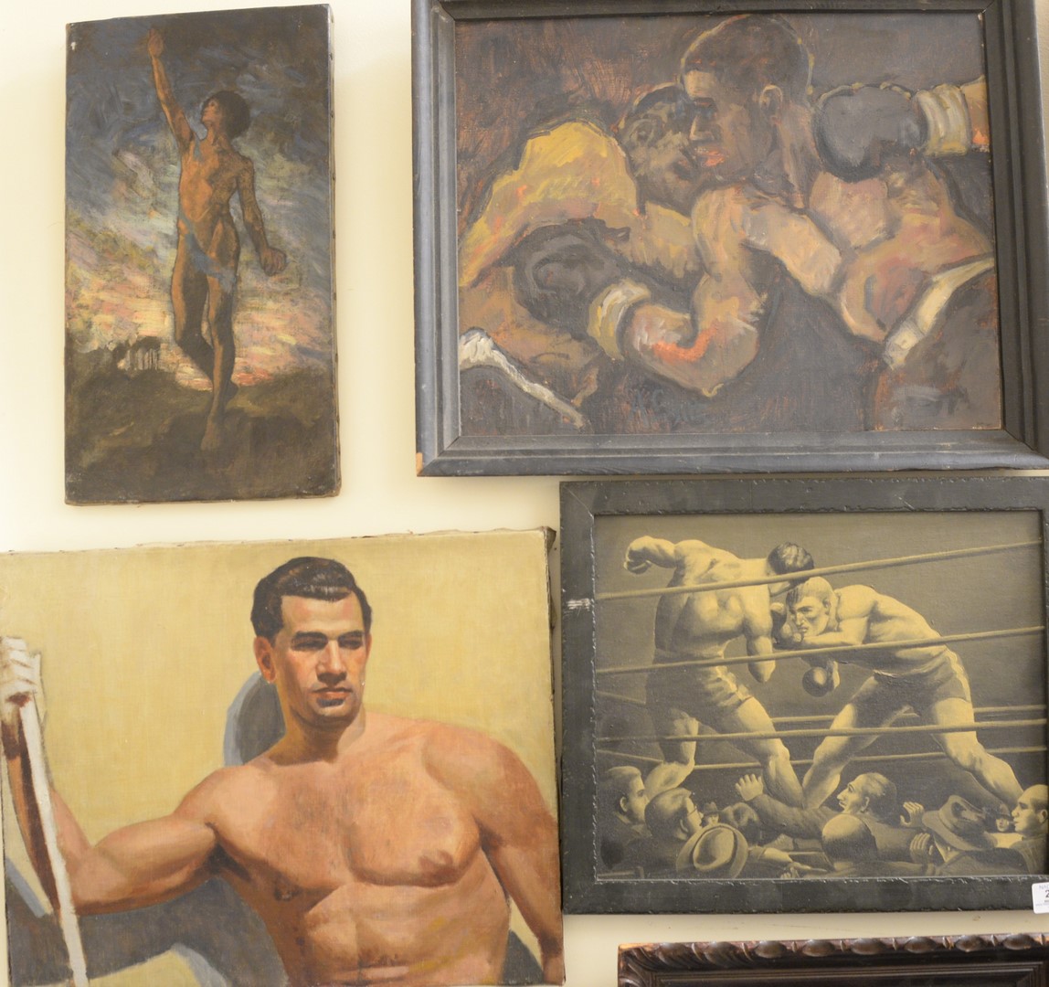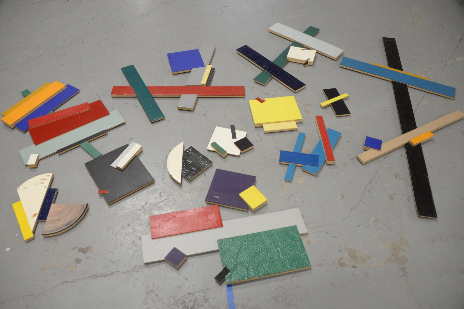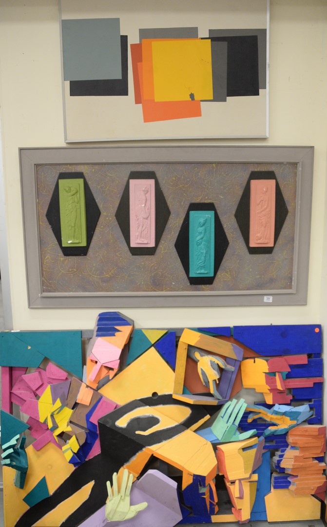 Four Piece Lot, to include Michael Hollis American, b. 1953, Grecian Echoes, 1982, mixed media with construction and ceramic tile, unsigned, 29 1/2 x 53, having a Texas Gallery label on the reverse, as is with tiles cracked and off the piece, pieces available, John Bernard Albers American, 20th century, Hand Some, 1982, painted wood, unsigned, 38 x 57 x 13, with pieces missing/damaged, along with Masaharu Matsui 20th century, Order of the Orient No. 2, acrylic screened on canvas, signed upper right M. Matsui, 26 x 36, as is with paint loss and flaking along with Peter Berg American, b. 1948, Bram’s Very Own Fault, 1981, painted wood, unsigned, overall 48 x 78.