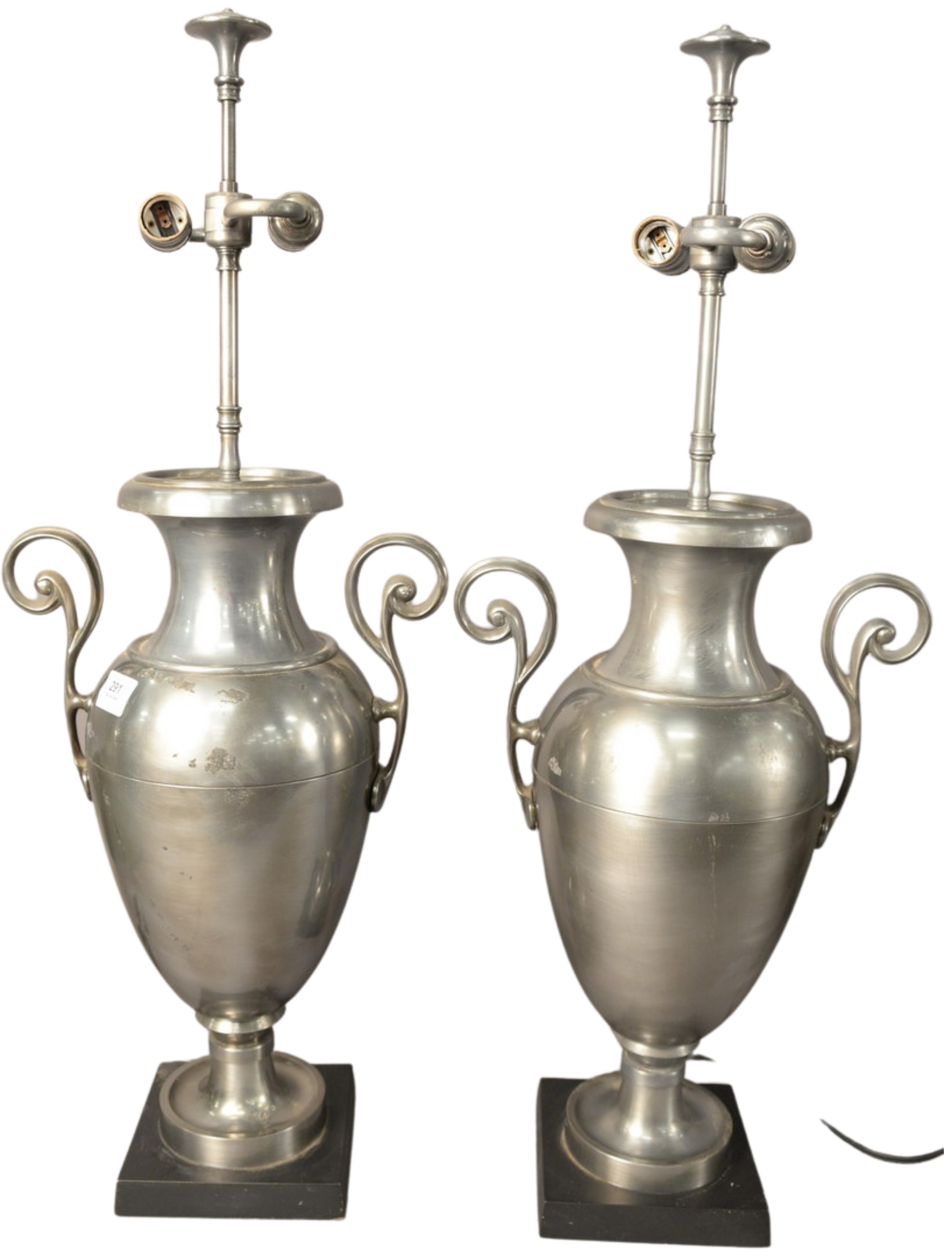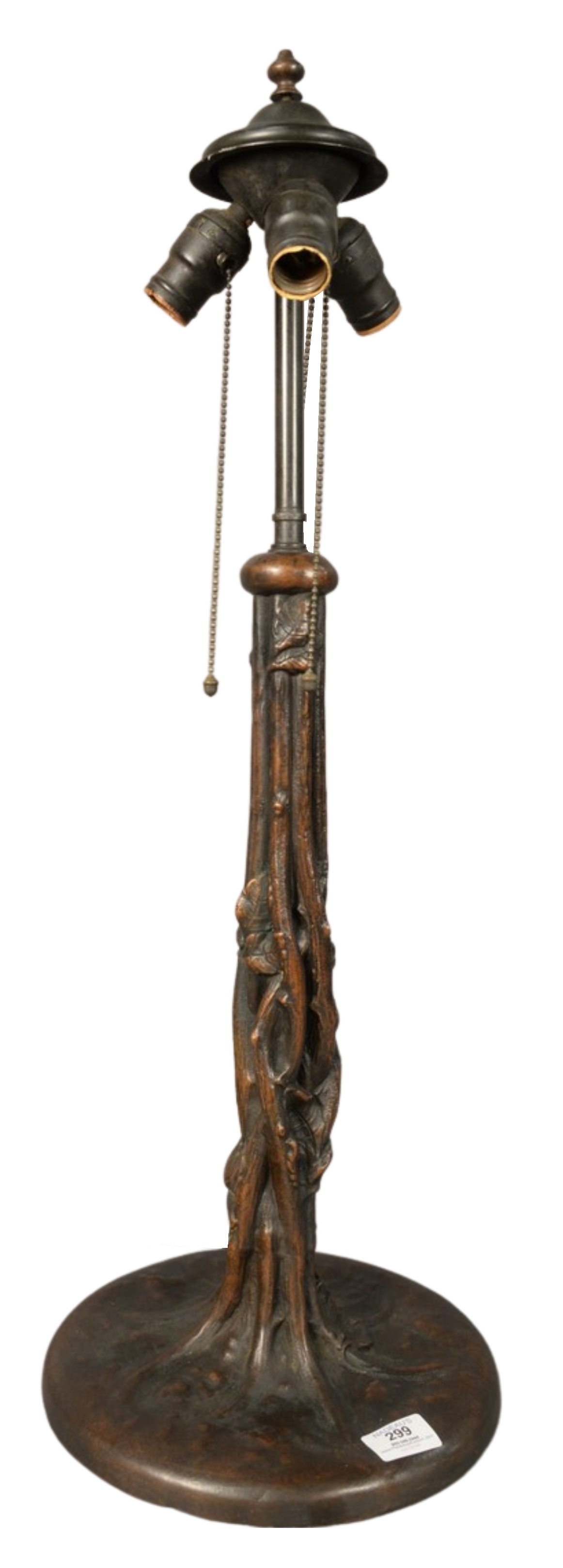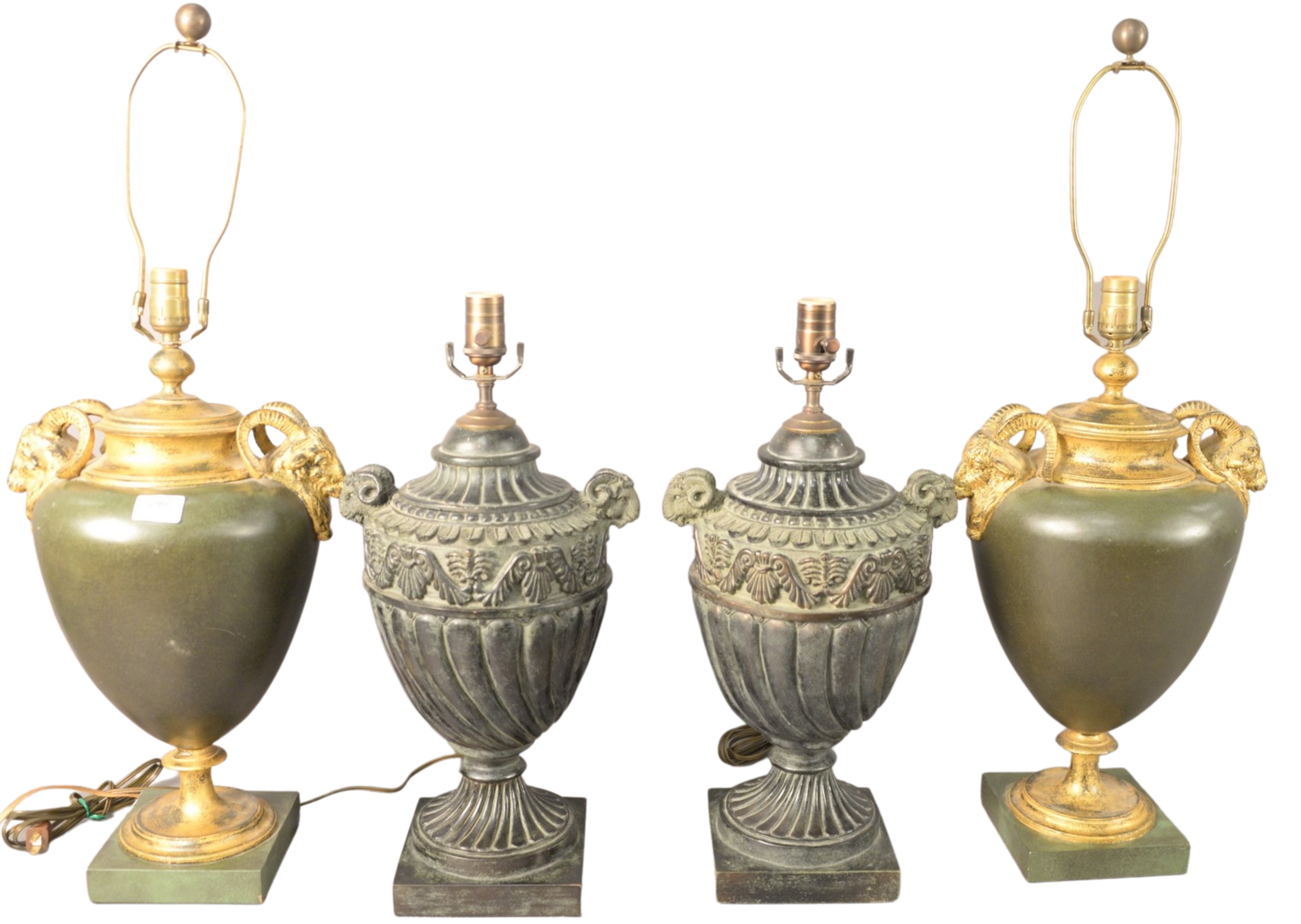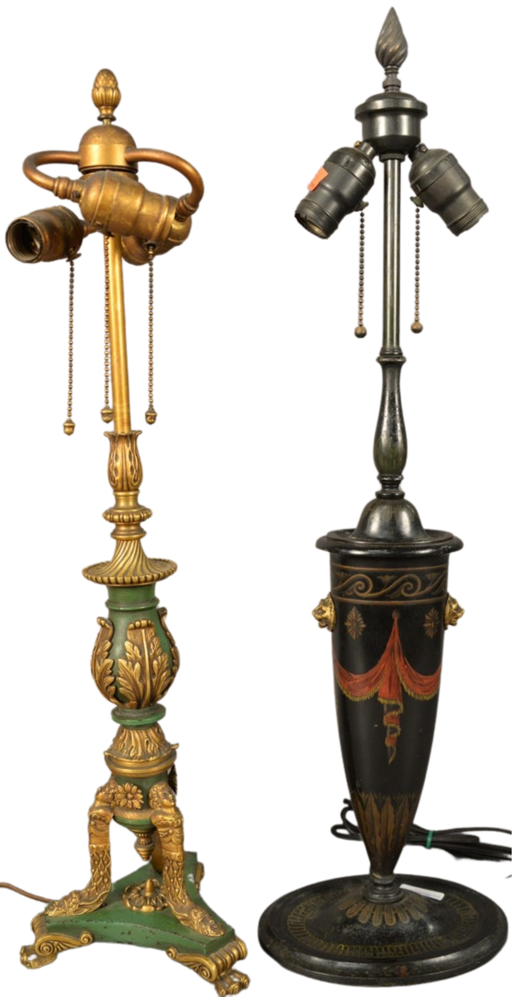 Two Table Lamps, to include a black tole painted two light lamp with lion form mounted handles along with a green and gilt bronze three light lamp, having figural base and paw feet, heights 26 and 28 1/2 inches.