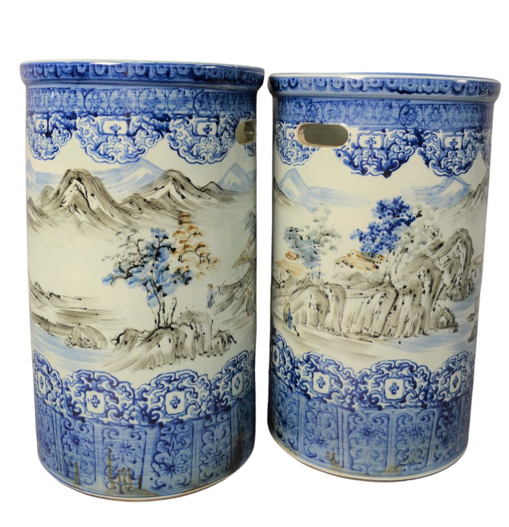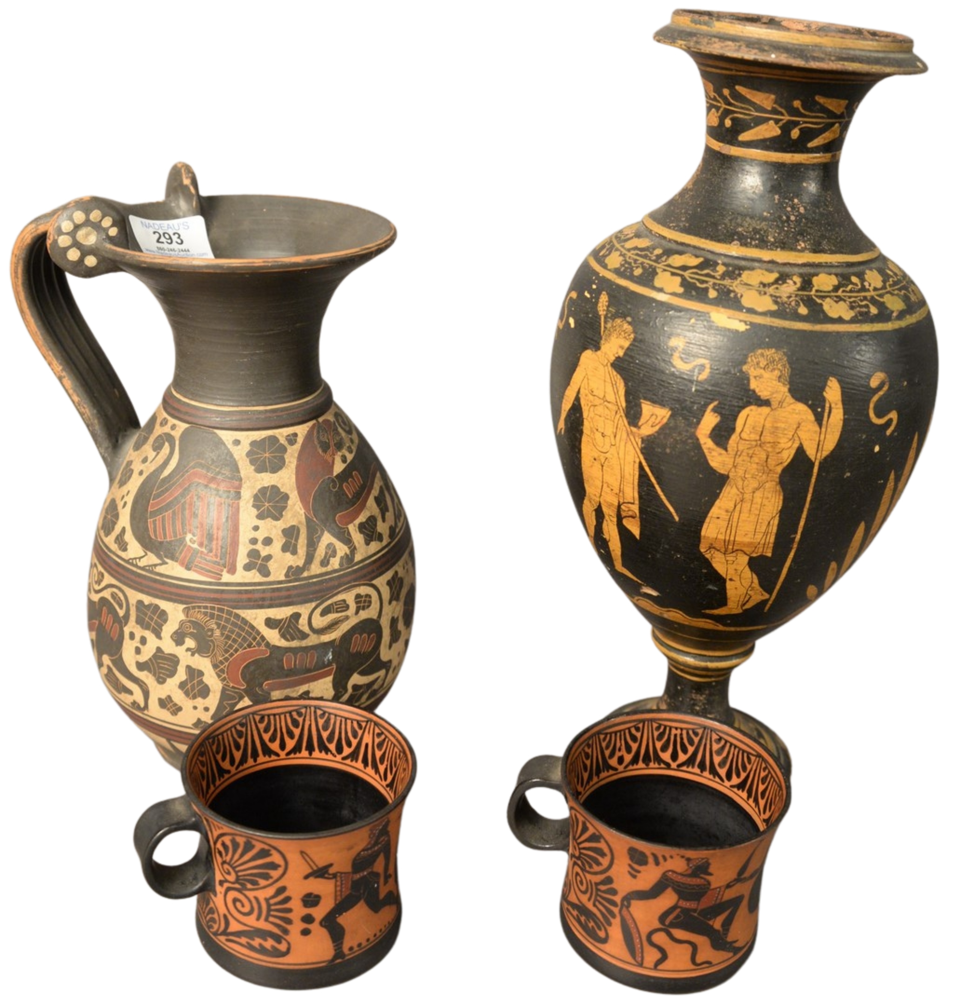 Four Piece Group of Greek Revival Pottery, to include a pair of red and black cups, marked illegibly on the bottom a pitcher painted with animals along with a vase with classic Greek figures, height 13 1/2 inches.