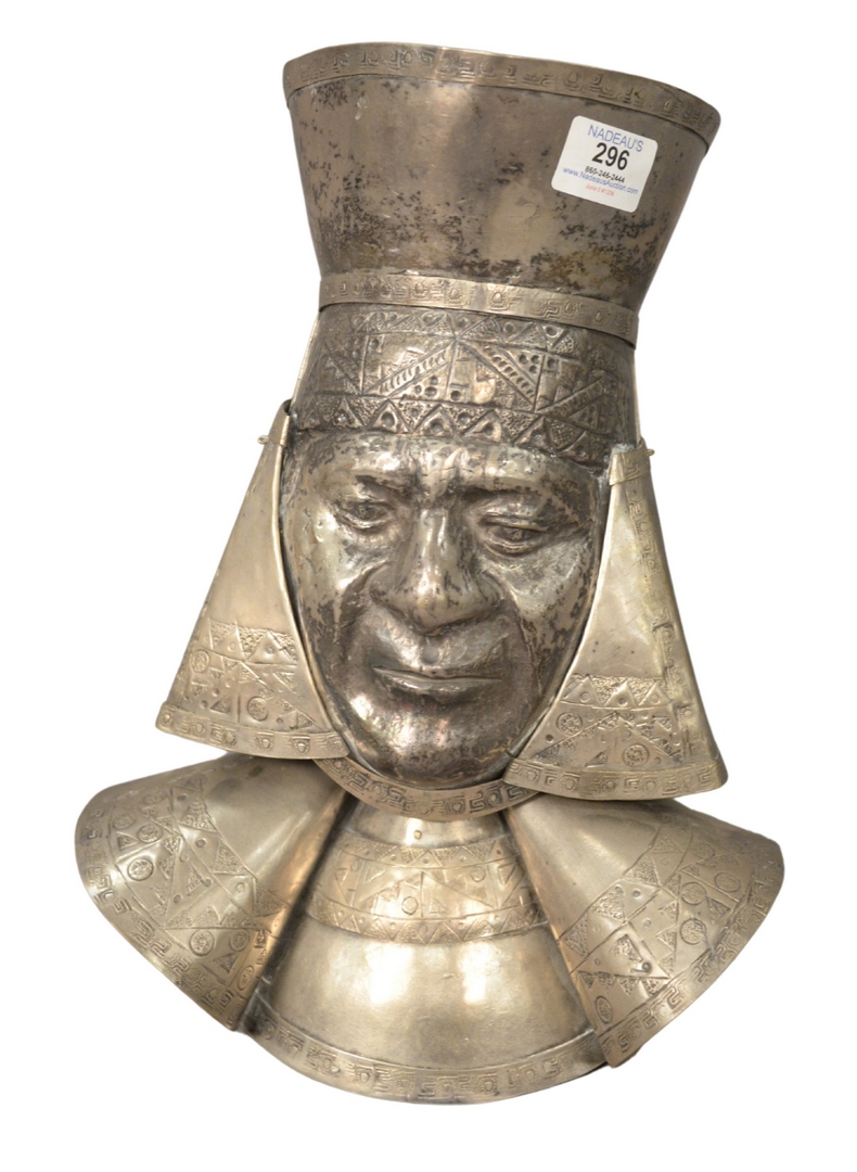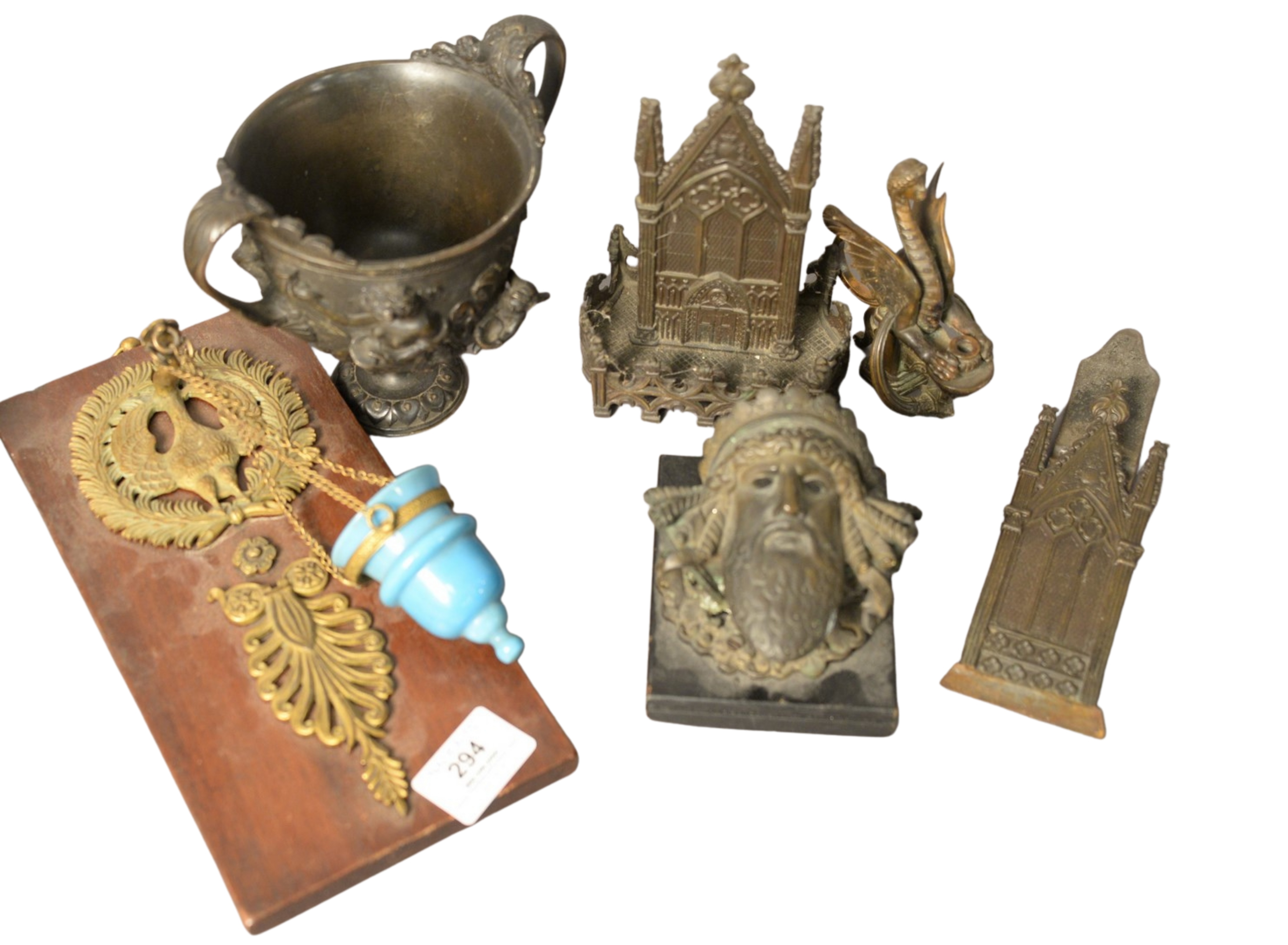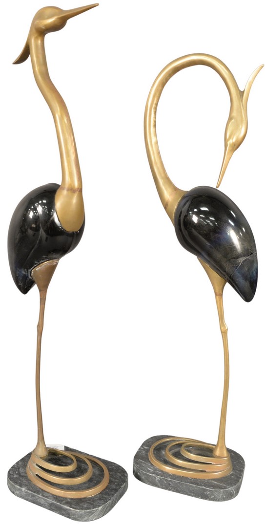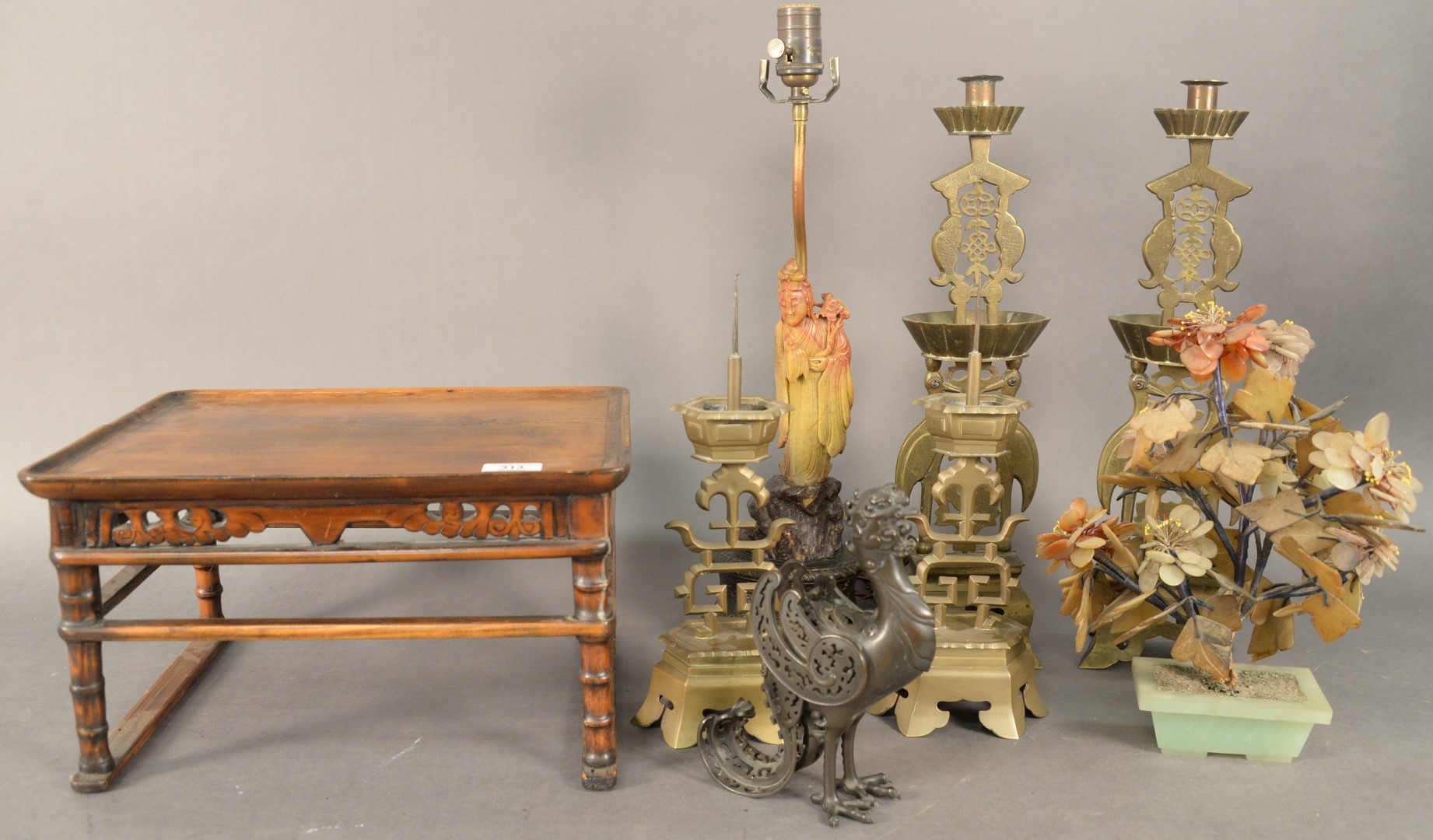 Eight Piece Asian Group, to include a figural carved hardstone table lamp a hardstone planter a reticulated bronze rooster a carved bamboo square stand a pair of brass candle prickets along with a pair of brass candlesticks, both having bird form bases candle stand height 19 1/2 inches, width 5 inches.