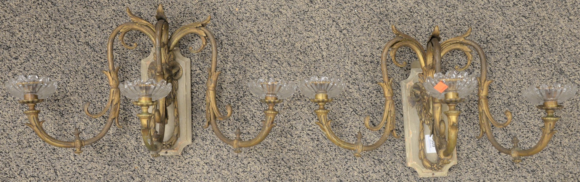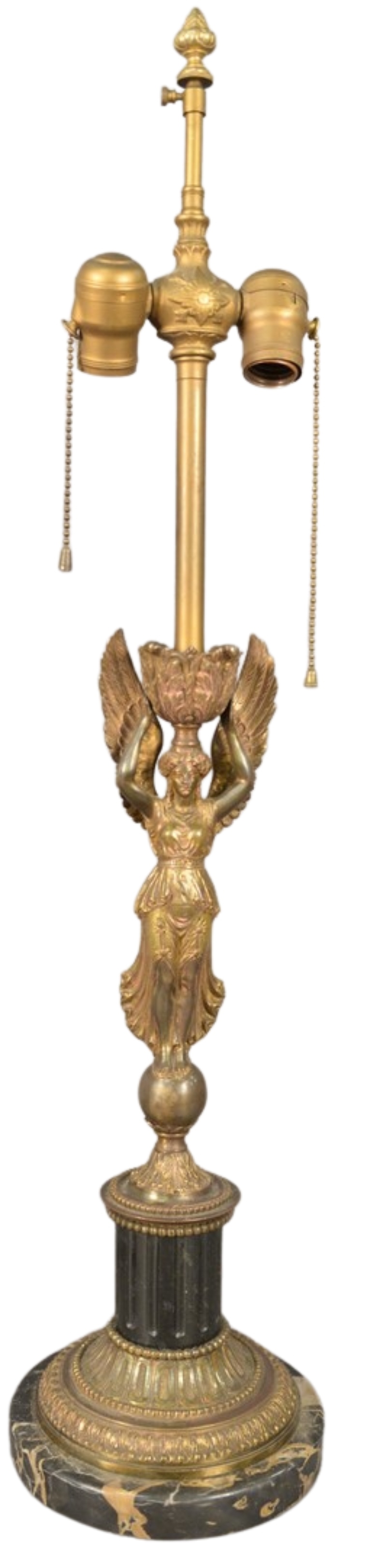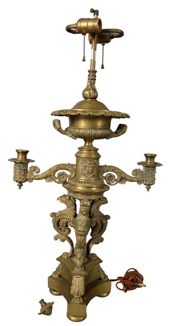 Pair of French Empire Bronze Two Light Table Lamps, both having two candle arms and decorated with eagle forms around the base, overall height 35 inches.