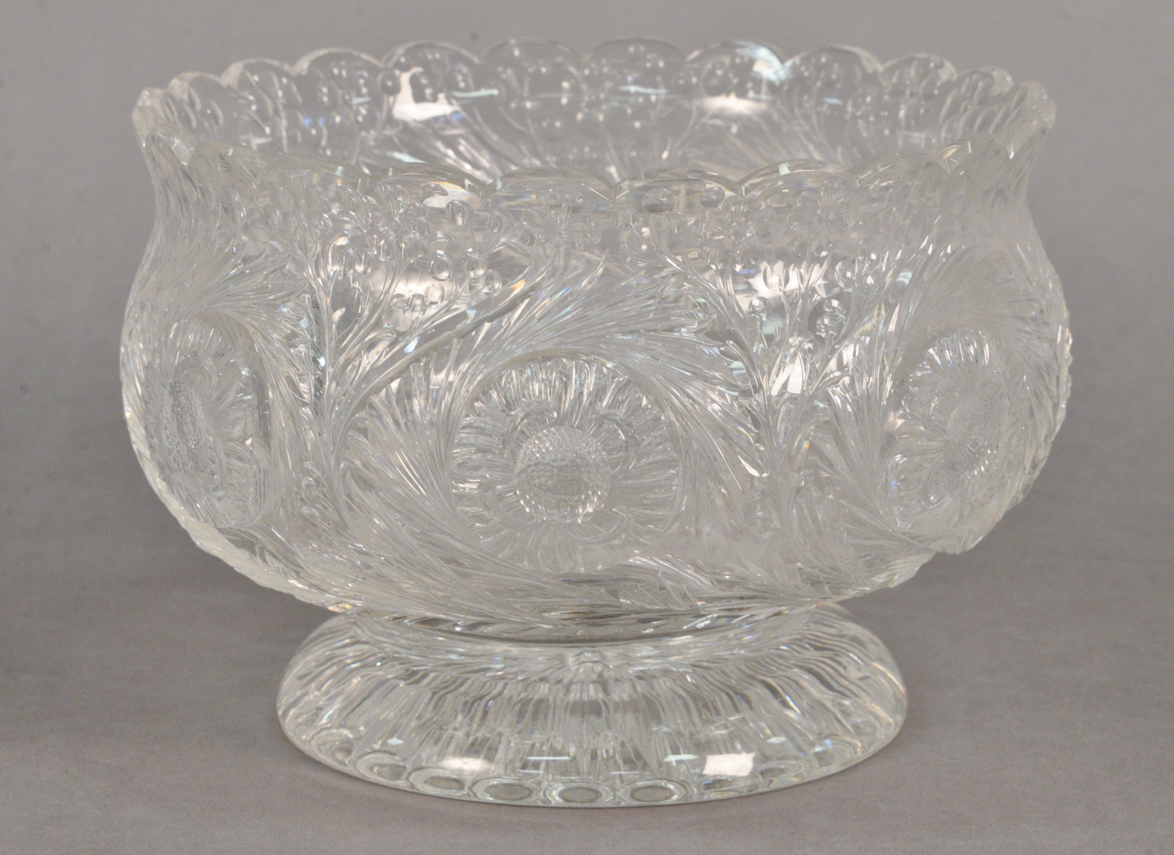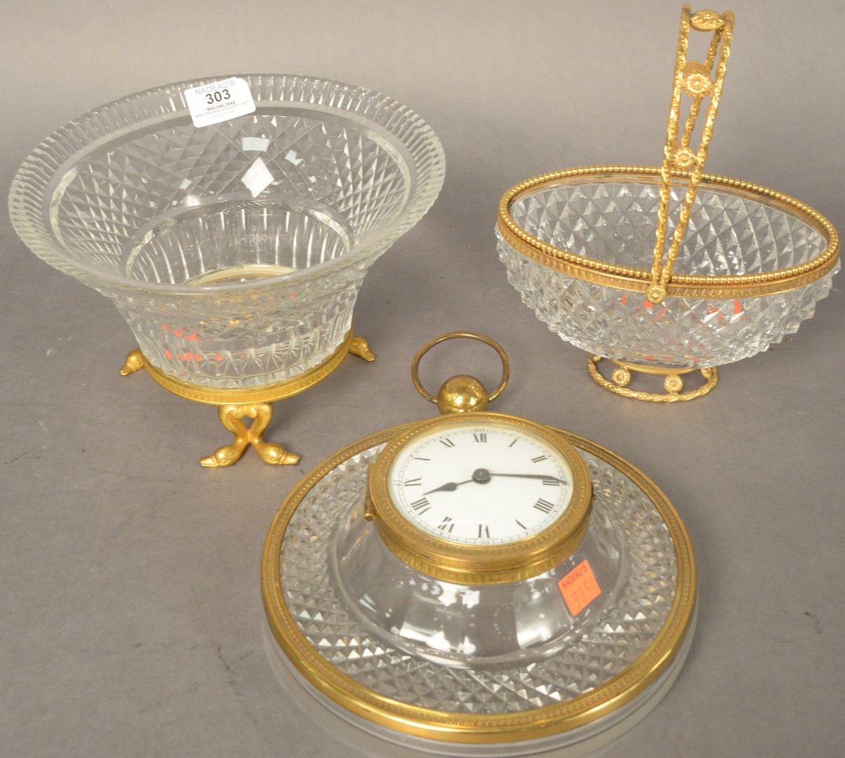 Three Piece Lot of Gilt Bronze Mounted Cut Glass, to include a clock, flower basket and bowl on swan head feet, bowl height 6 inches, diameter 9 inches.