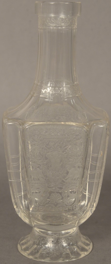 Two Etched Glass Pieces, to include Orrefors Intaglio perfume bottle along with French glass vase depicting goose with flowers and leaves, heights 5 1/2 and 11 1/2 inches.