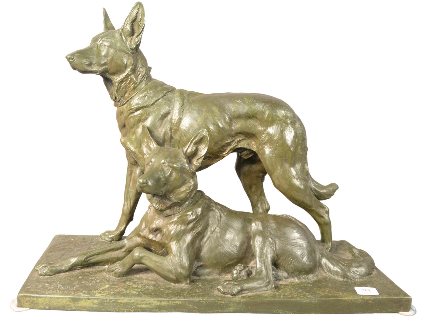 After Charles Paillet French, 1871 – 1937, two German Shepherd dogs, bronze with green patina, inscribed to the base Ch Paillet Medaille d’Or height 21 inches, width 27 1/2 inches, depth 11 inches.