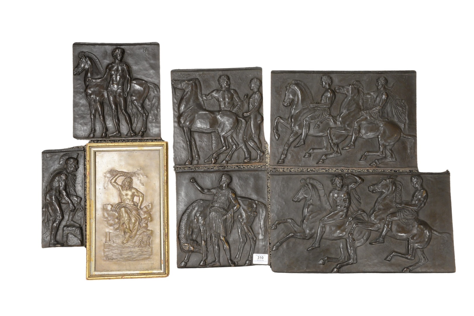Seven French Bronze Wall Plaques, to include a set of five Roman figures, all marked ‘I. Barbedienne’ one signed ‘F. Delaplanche’, largest 10 1/2 x 18.