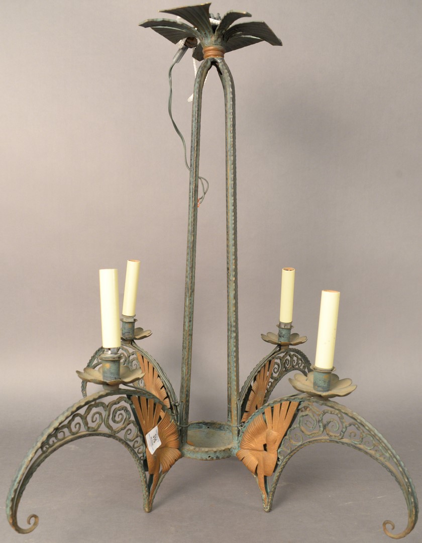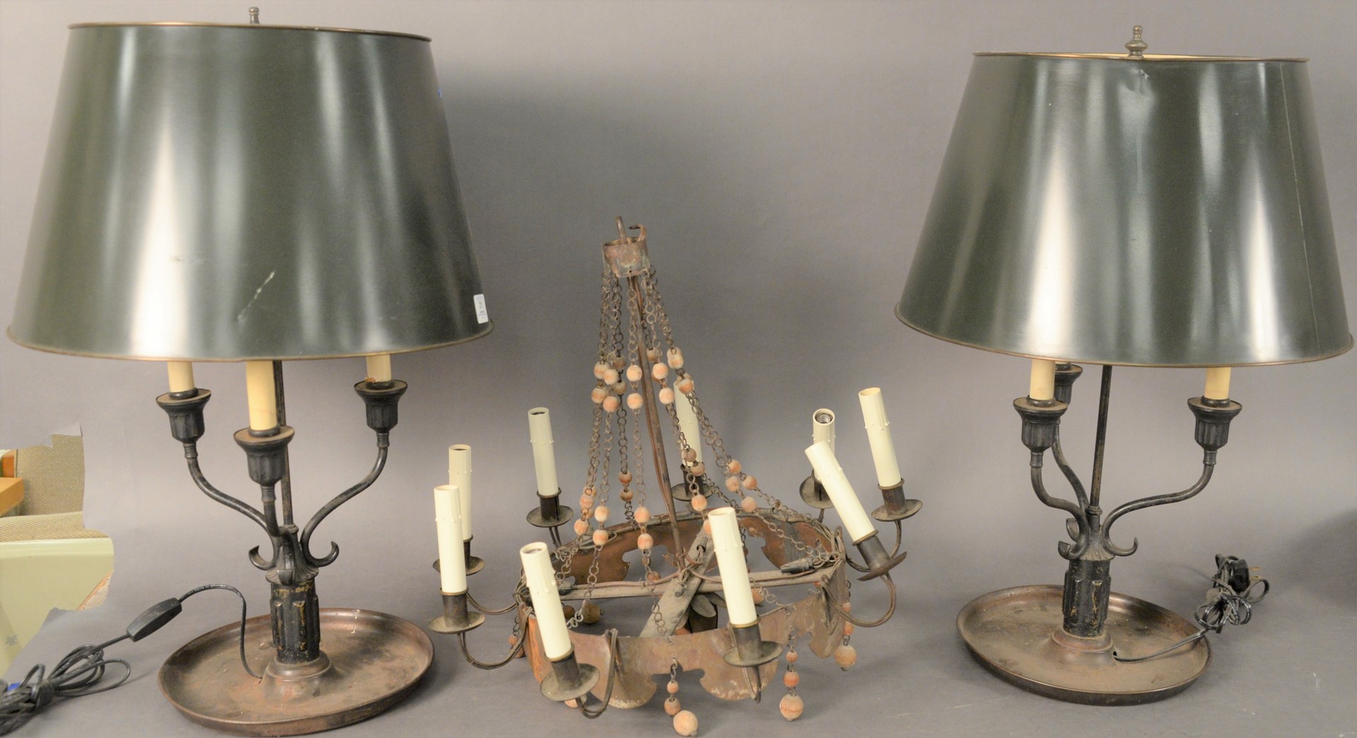 Three Piece Italian Tole Lot to include, pair of large Italian table Lamps, both having painted green tole shades and three lights along with an Italian tole chandelier having nine lights overall 26 inches, width 17 1/2 inches.