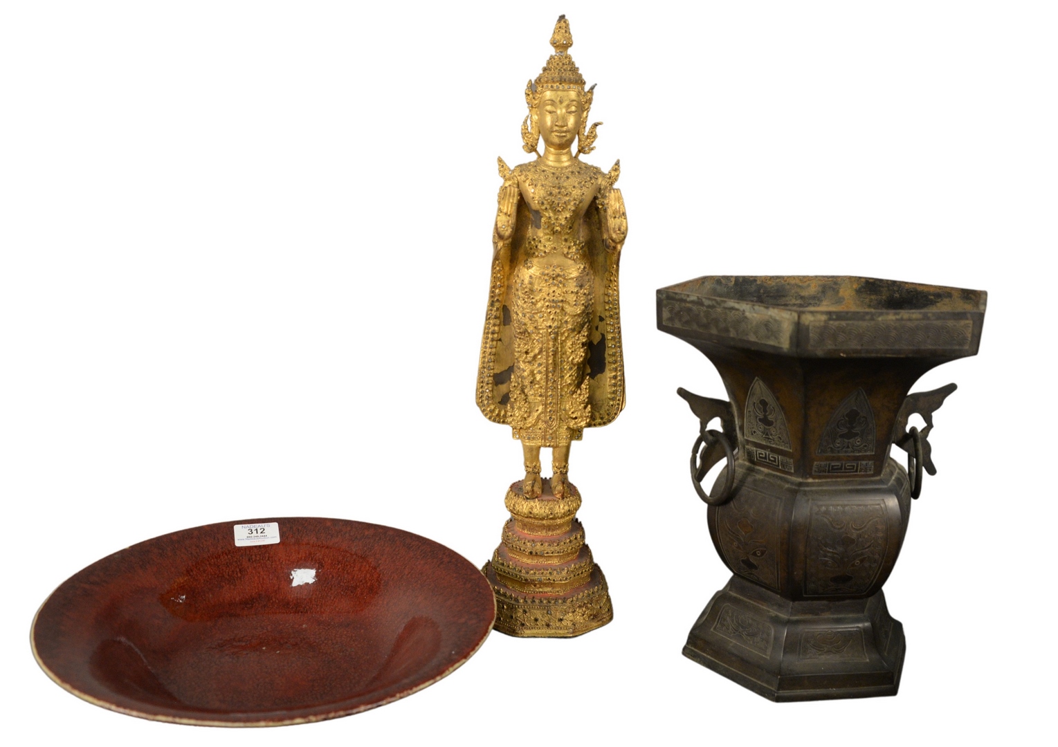 Three Asian Pieces, to include Chinese bronze vase, having several lines of writing on the bottom standing Quanyin mounted with jewels along with a red glazed bowl, diameter 12 inches.