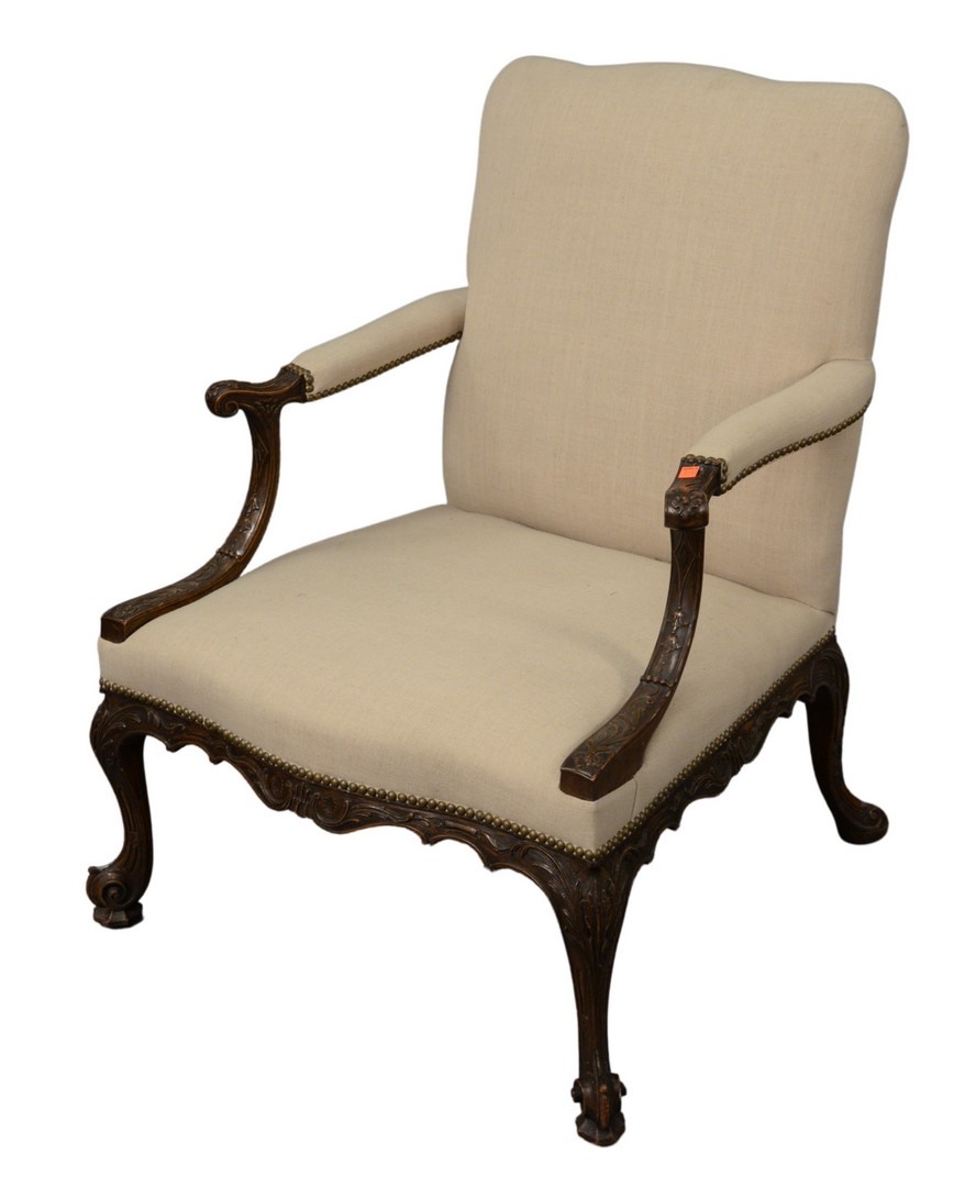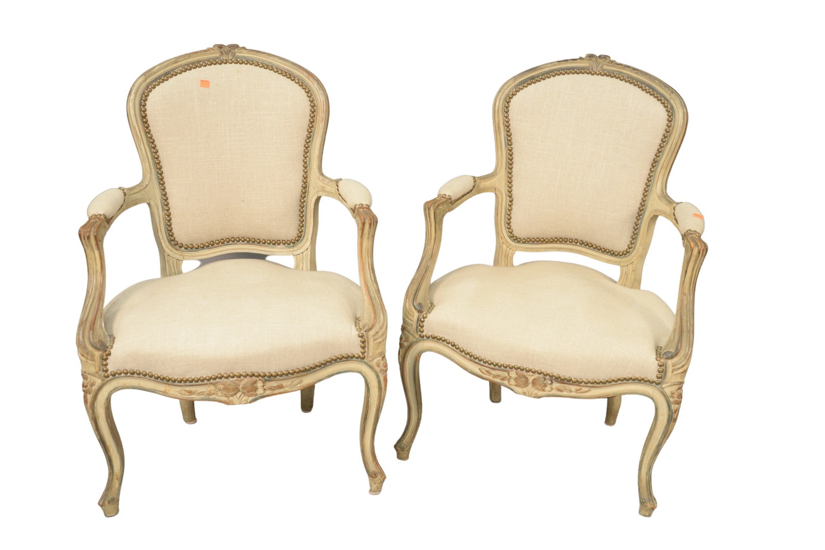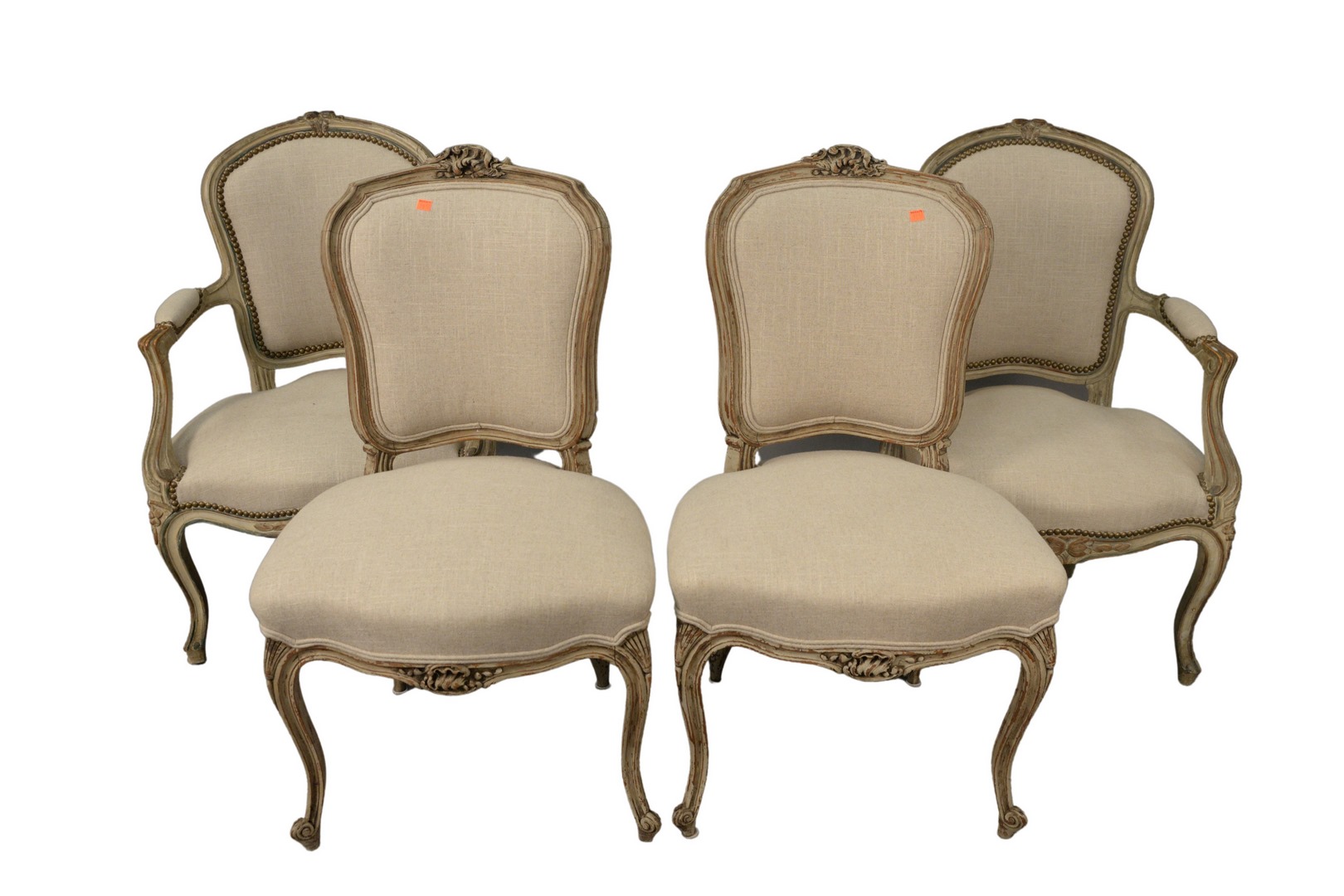 Four Piece Lot, to include pair of Louis XV style fauteuil, along with pair of Louis XV style side chairs, near matching, all with new upholstery, height 35 inches.