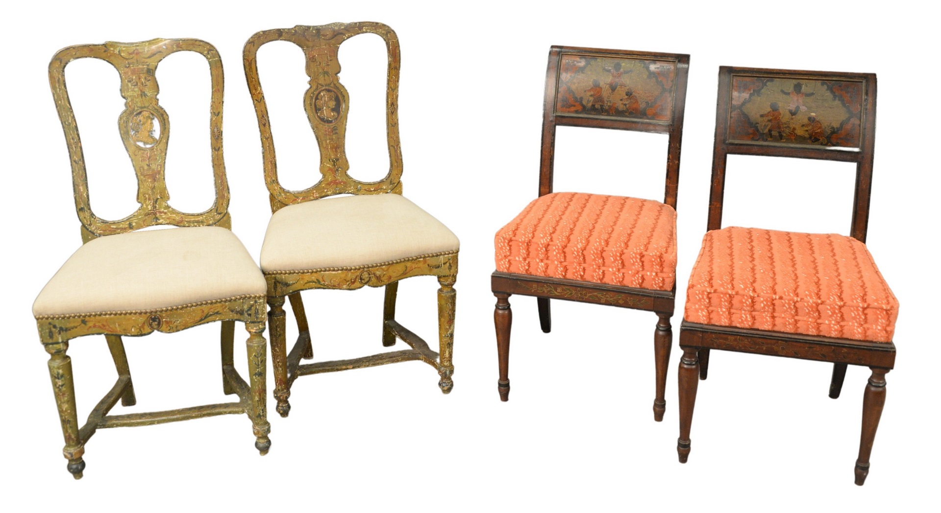 Two Pairs of Chairs, to include Italian pair with chinoiserie painted panel, height 38 inches along with a pair of Venetian side chairs, paint decorated, height 35 inches, all 19th century or earlier.