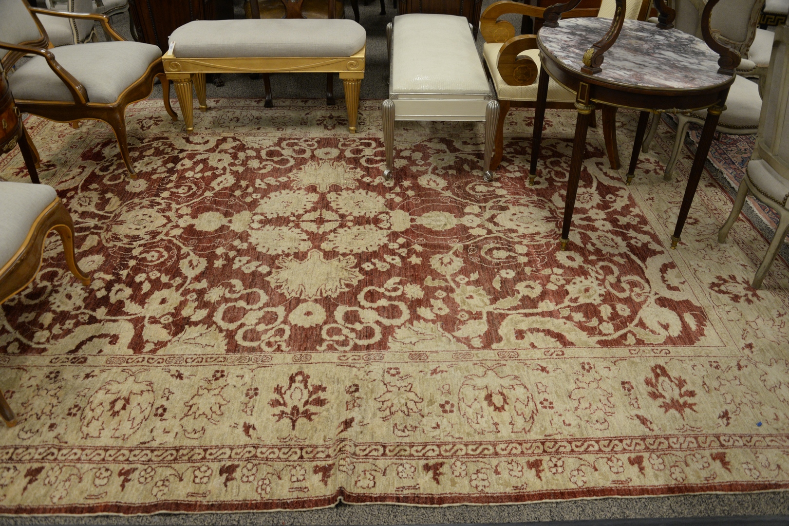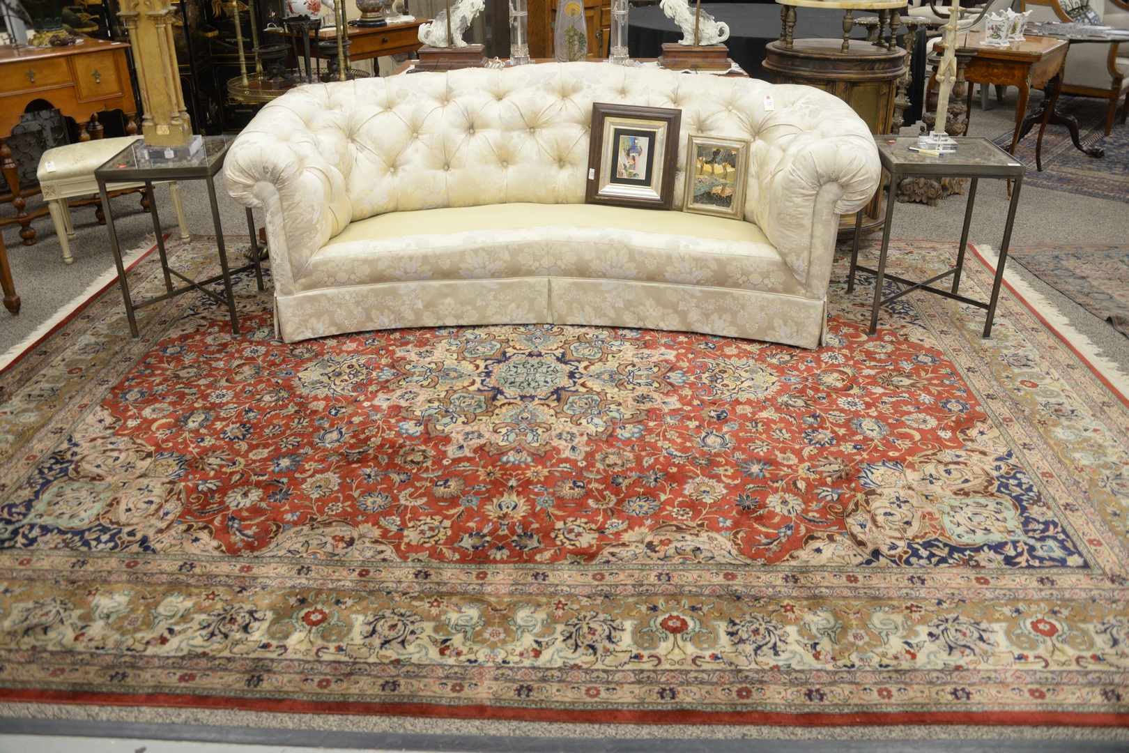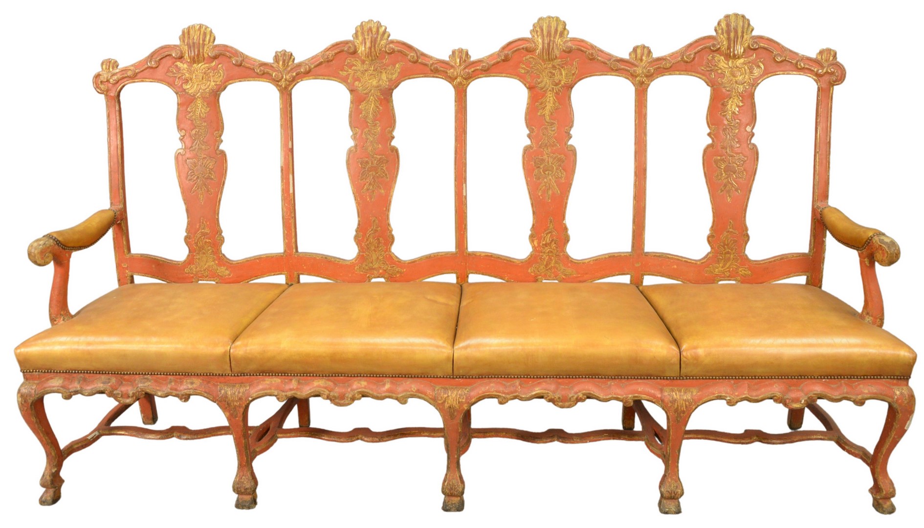 Four Seat Settee, red with gilt, having openwork back, leather upholstered seats on carved legs, probably Venetian, 18th century, height 43 inches, length 87 inches, depth 18 inches.
