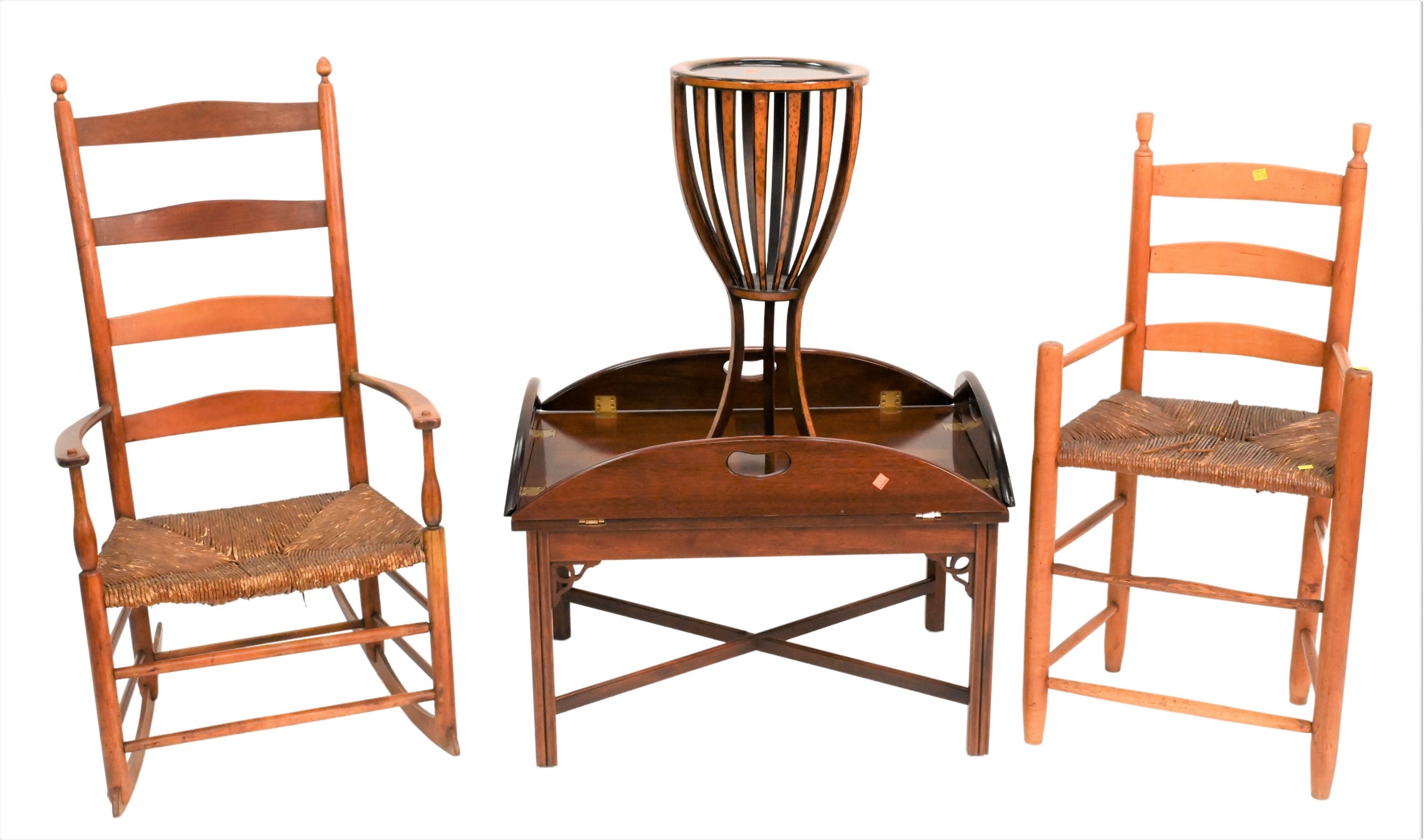 Four Piece Lot, to include ladder back chair, height 43 inches, Shaker ladder back armchair, mahogany tray style coffee table, along with a round stand.