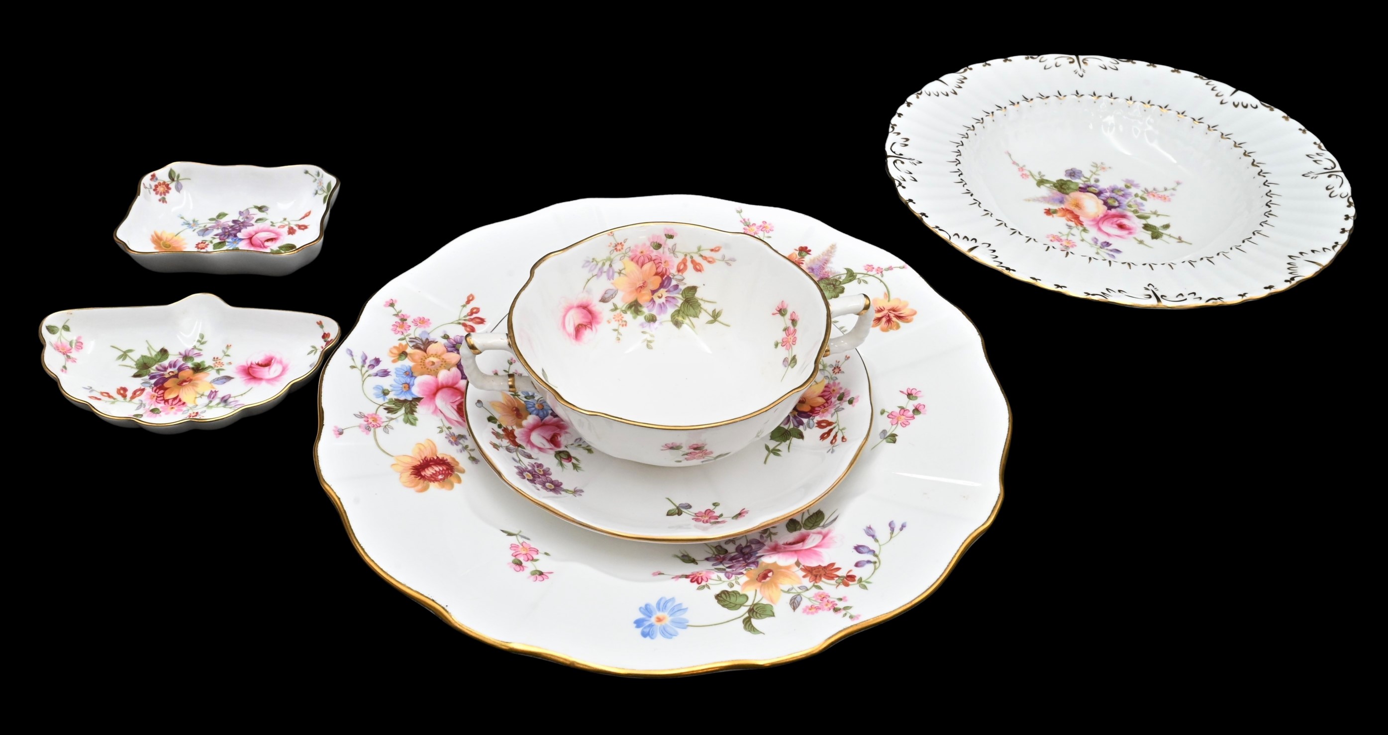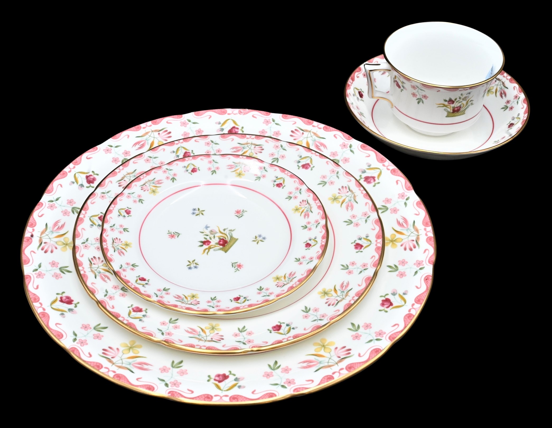 86 Piece Royal Crown Derby “Delphine” Dinner Service, to include 31 dinner plates, 17 cream soups, 18 under plates, 17 salad plates, 1 platter, 1 sherbert, along with 1 bread and butter plate.