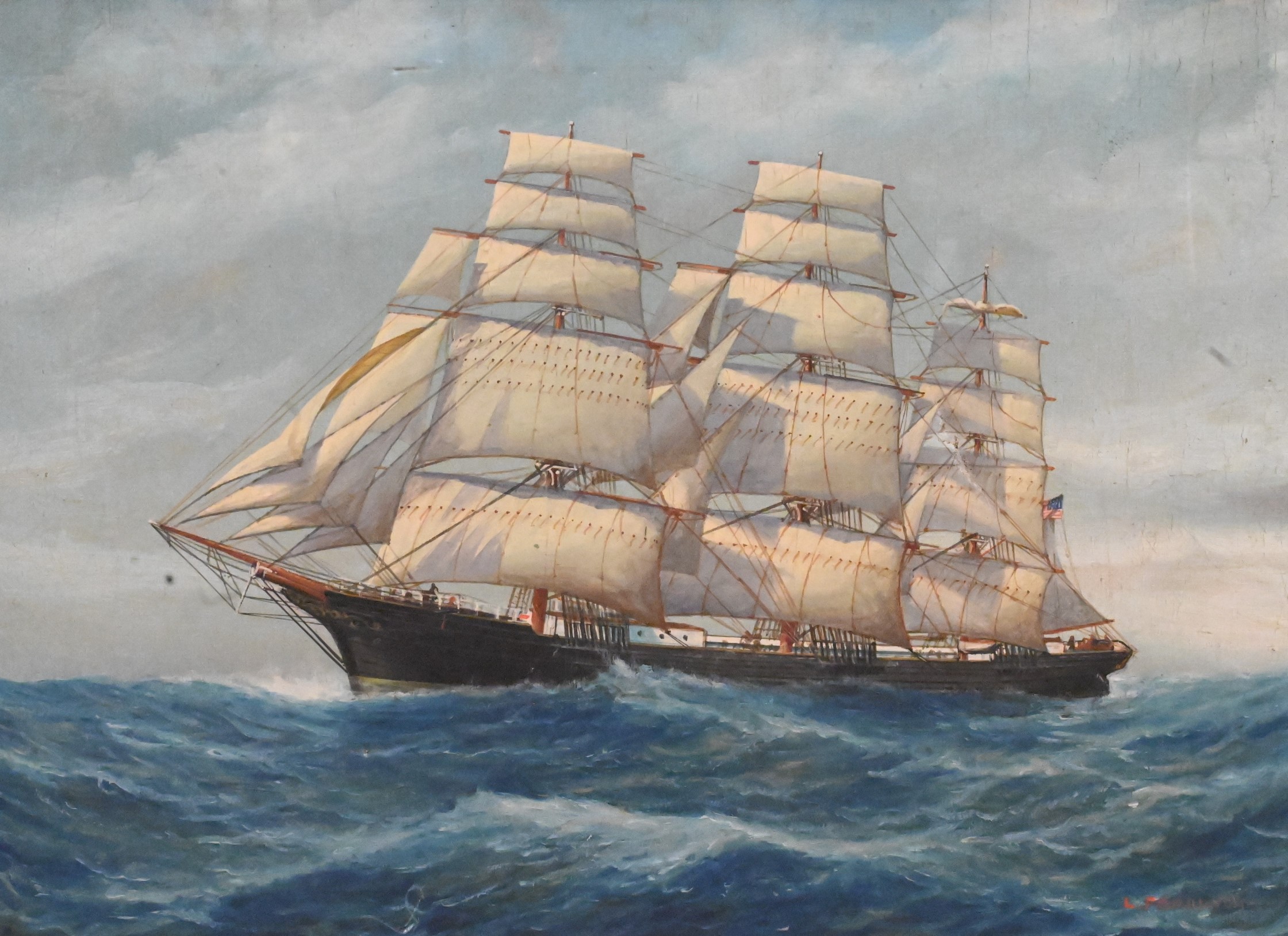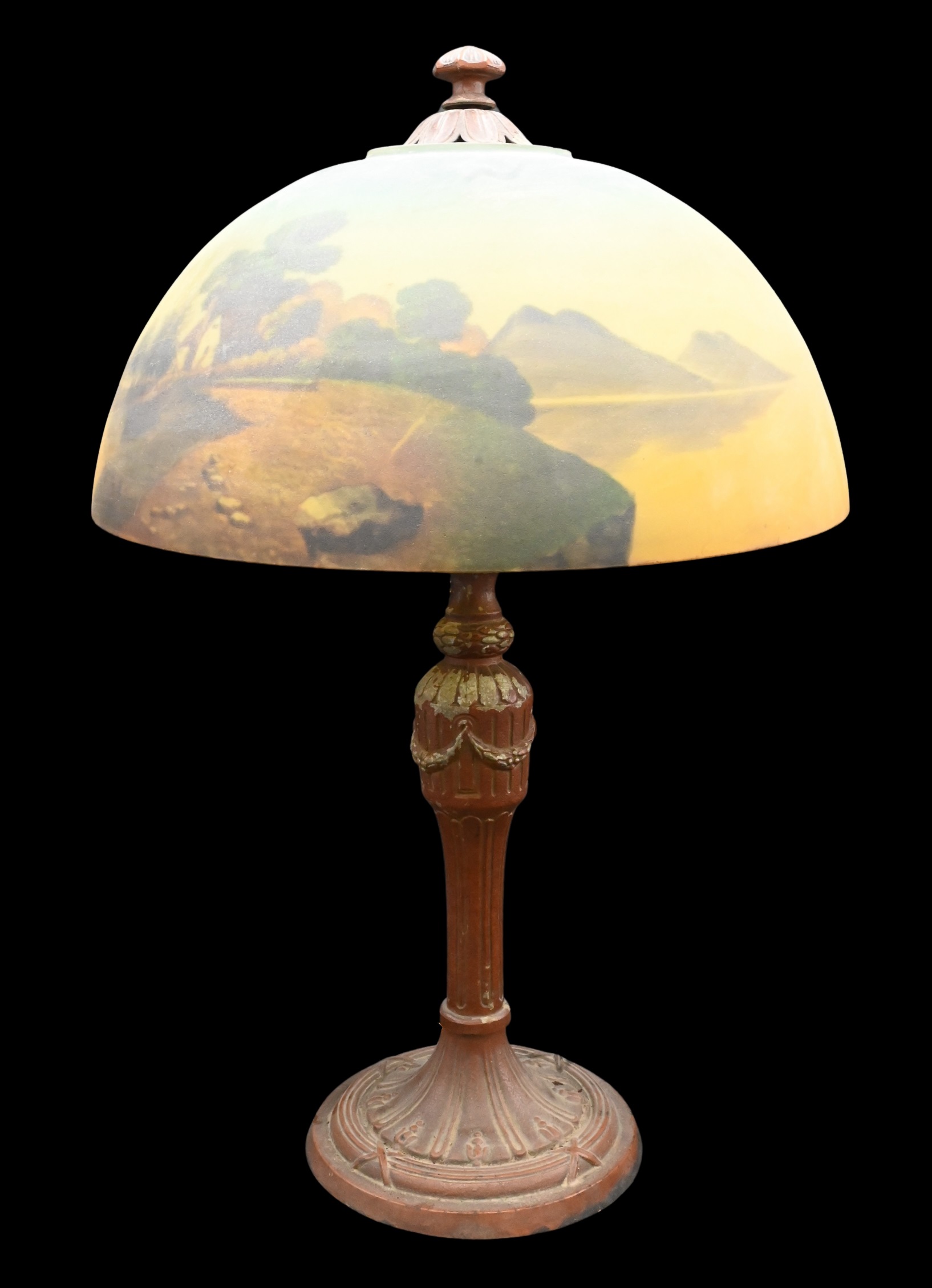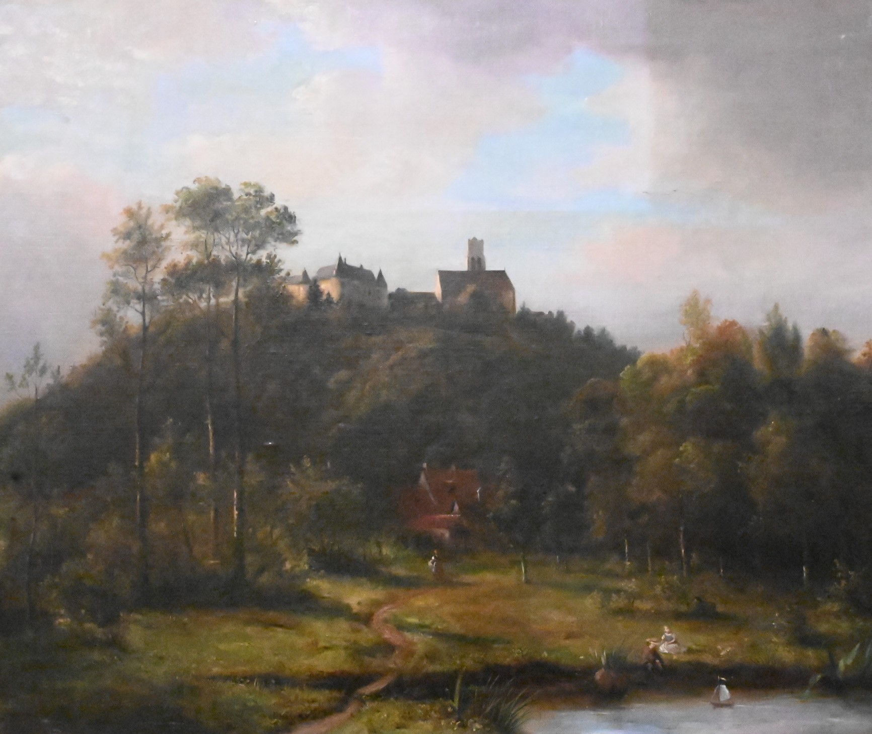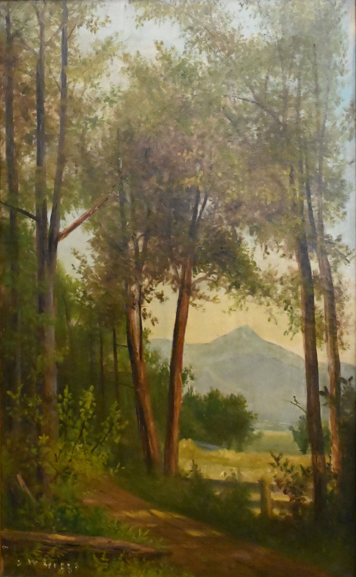 Samuel W. Griggs (American – Massachusetts,1827 – 1898), forest landscape with mountainous background, oil on canvas, signed lower left “S.W. Griggs”, 26″ x 16″, small patch/repair to center.