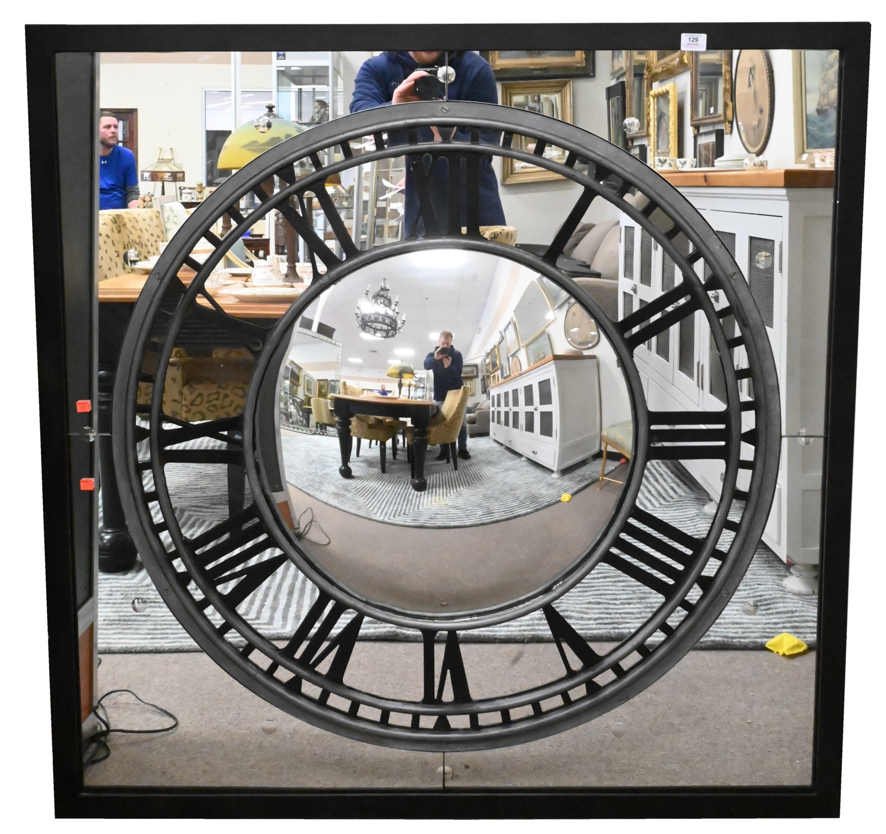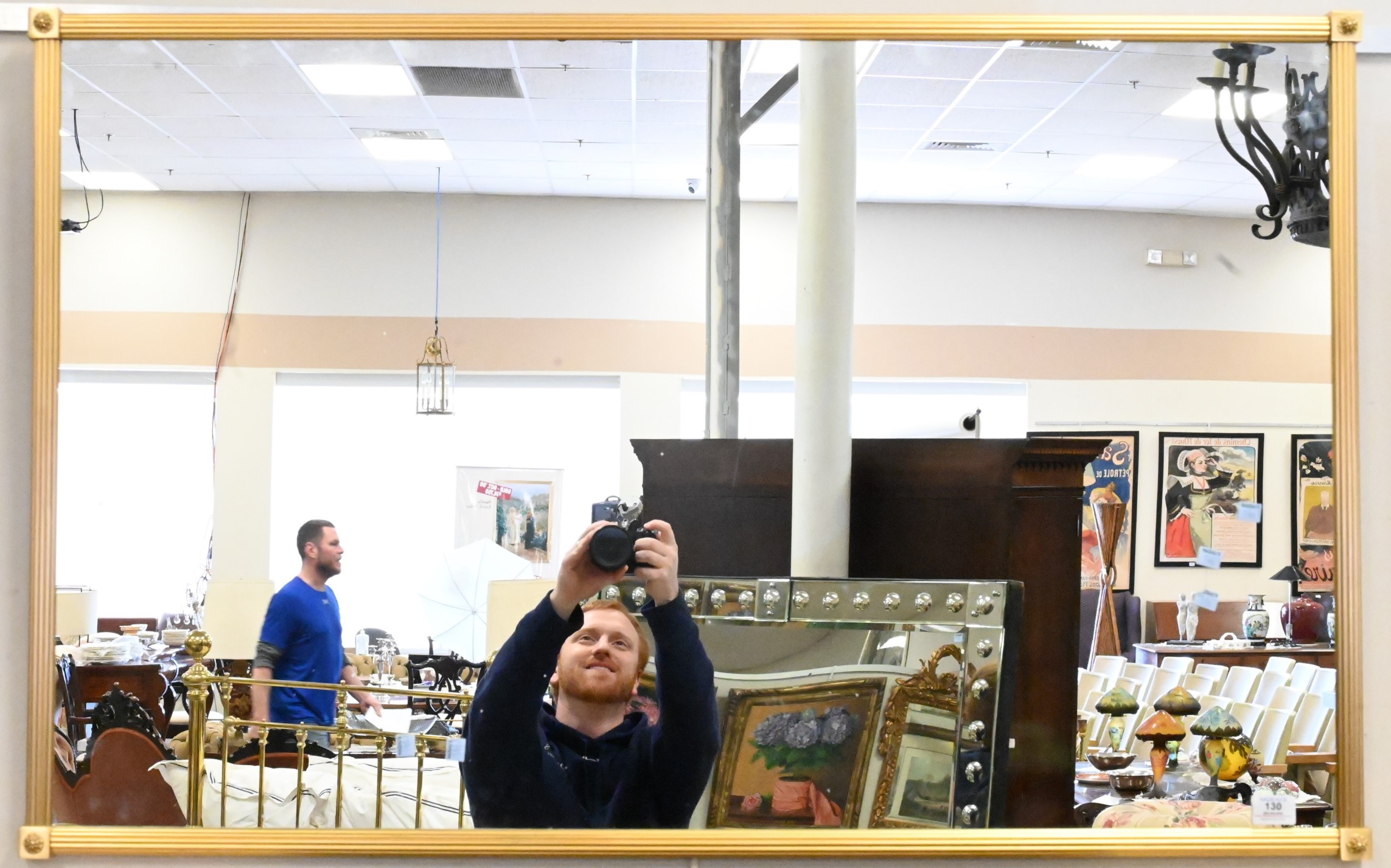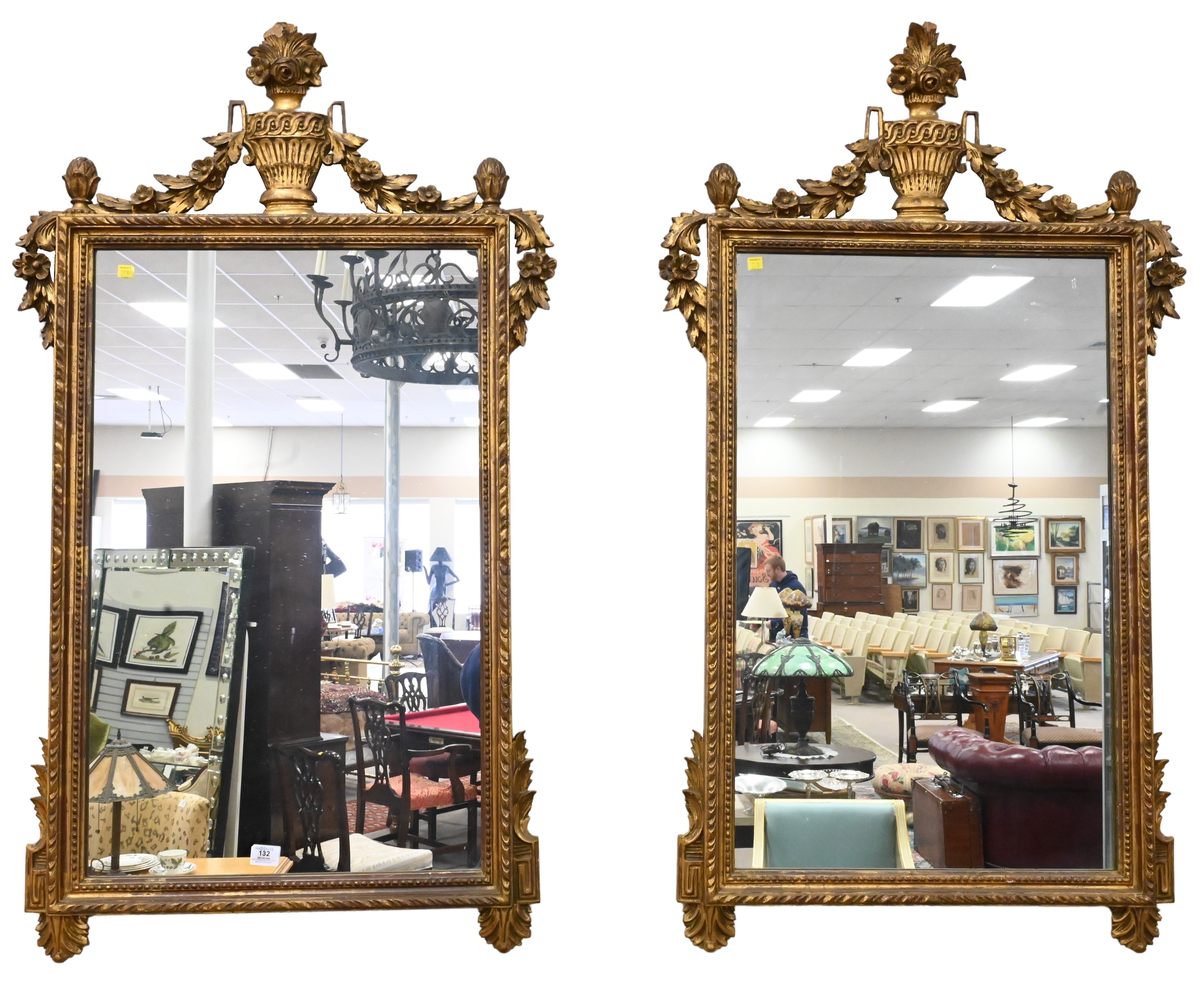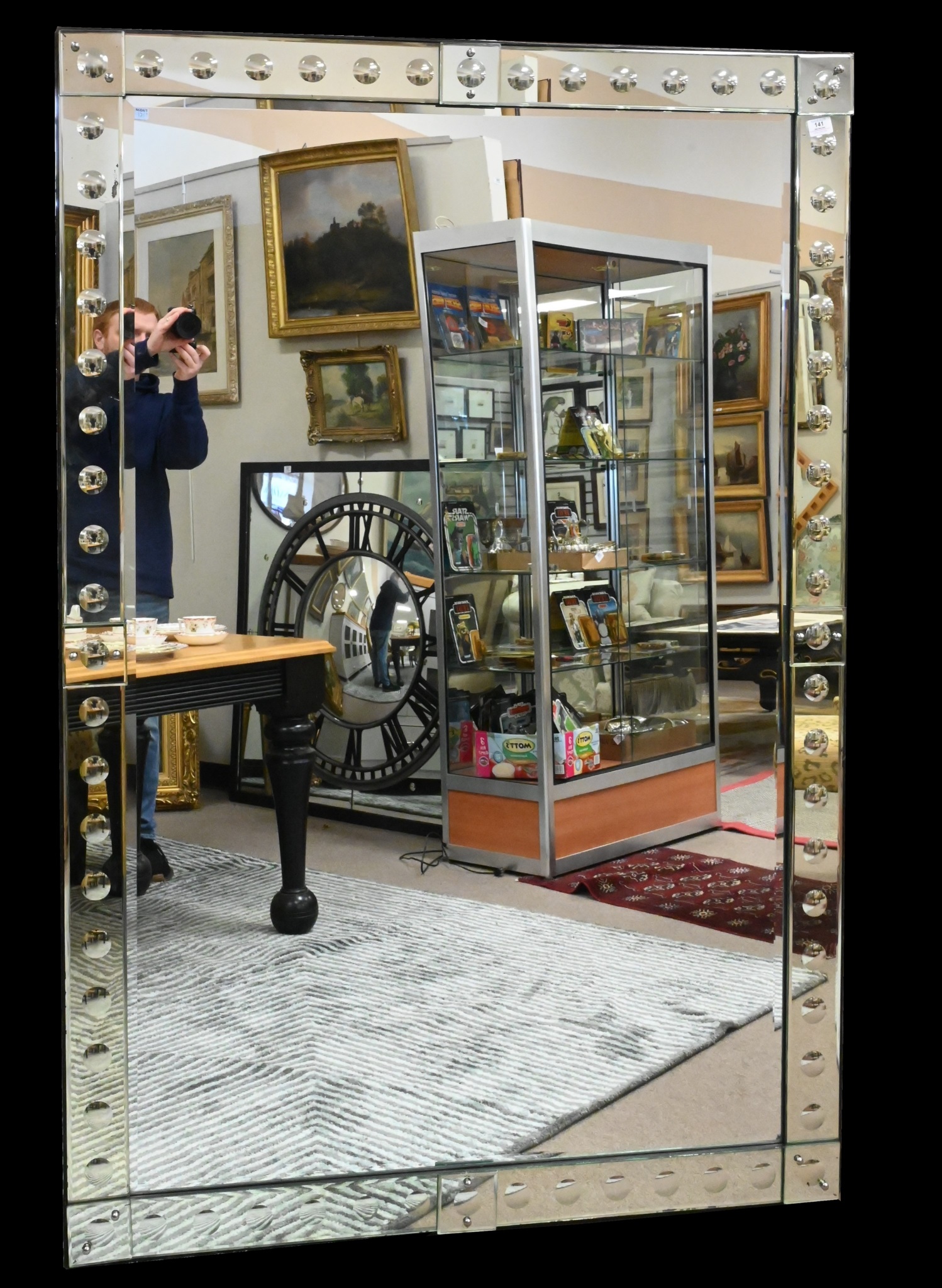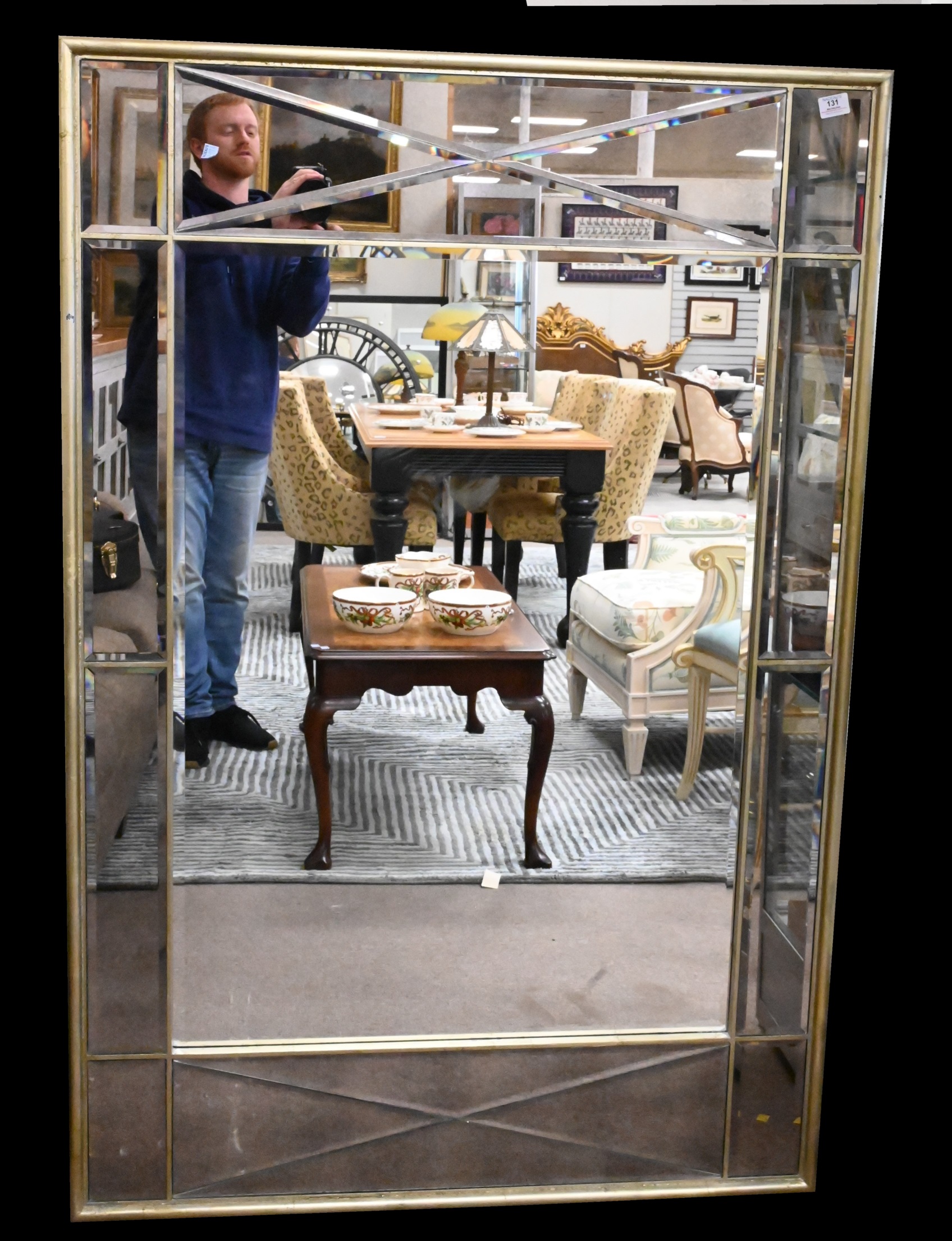 Gilt Bronze Neoclassical Mirror, rectangular with fluted frame, four rosette corners, possibly Maison Bagues, 48″ x 30″; along with a custom upholstered stool, height 18 inches, top 20″ x 14 1/2″.