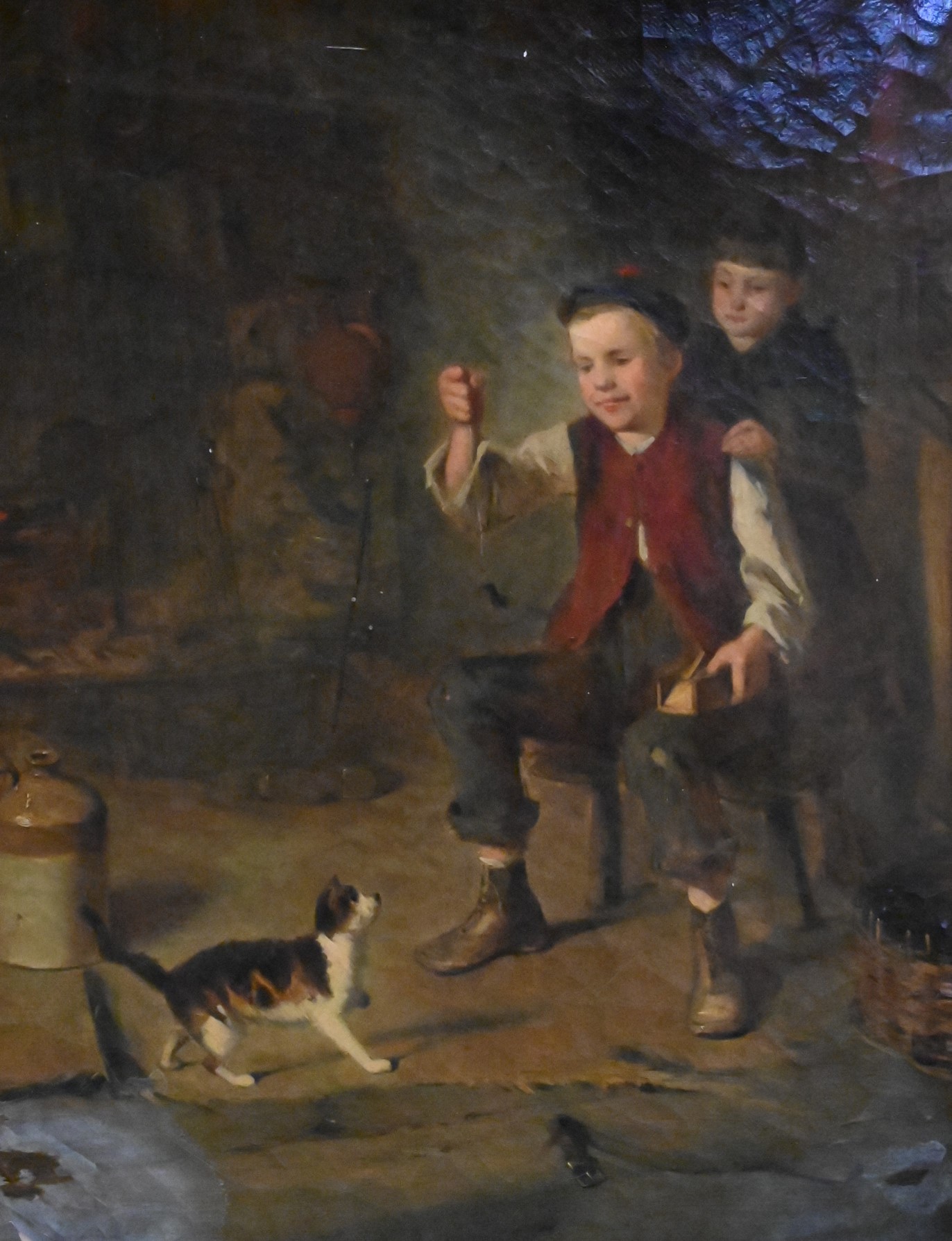 Attributed to Gertrude Jameson (Jenkins) Barnes (American, 1865 -1939), “Expectations”, interior scene with two young children playing with a cat, oil on canvas, 18″ x 14 1/4″.