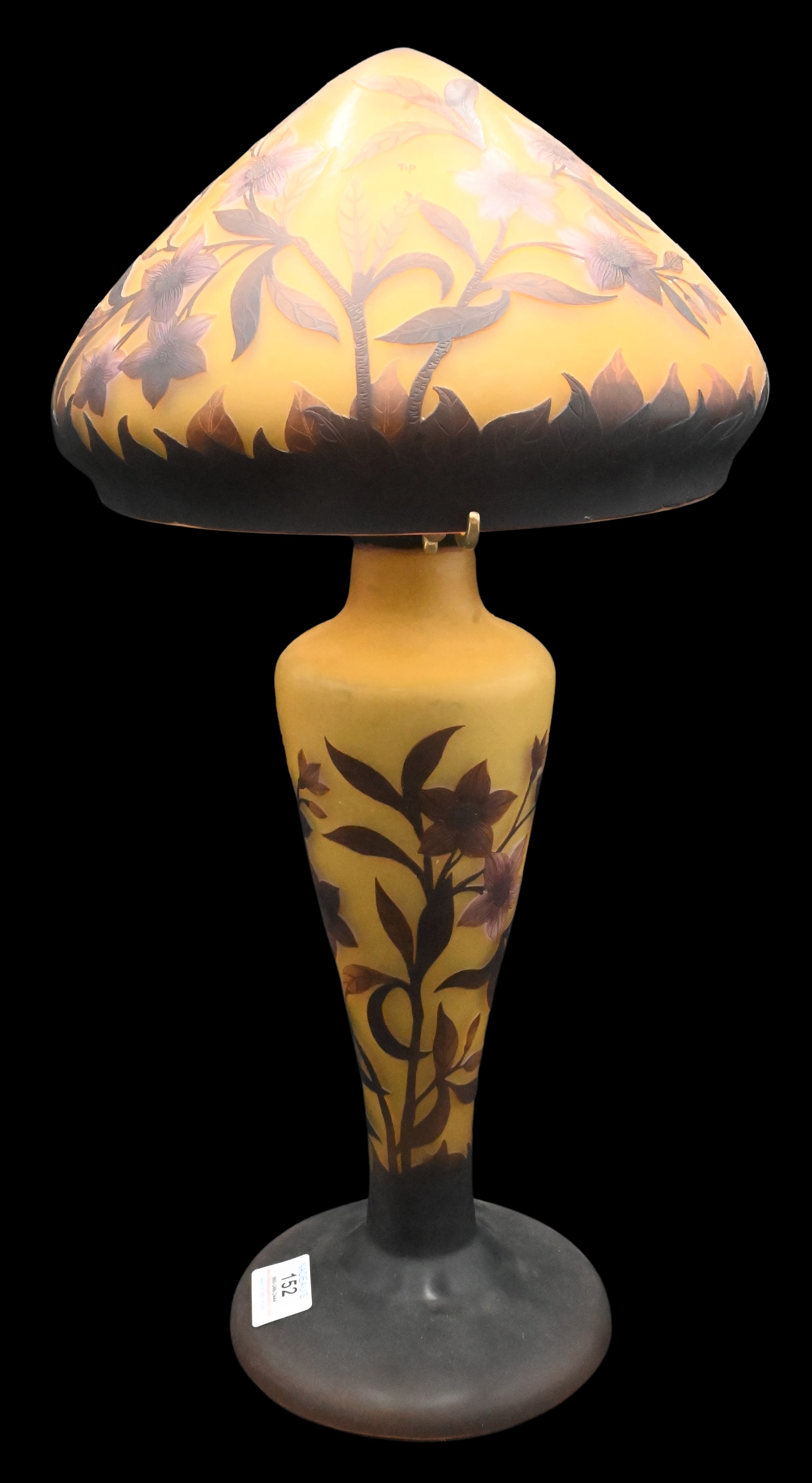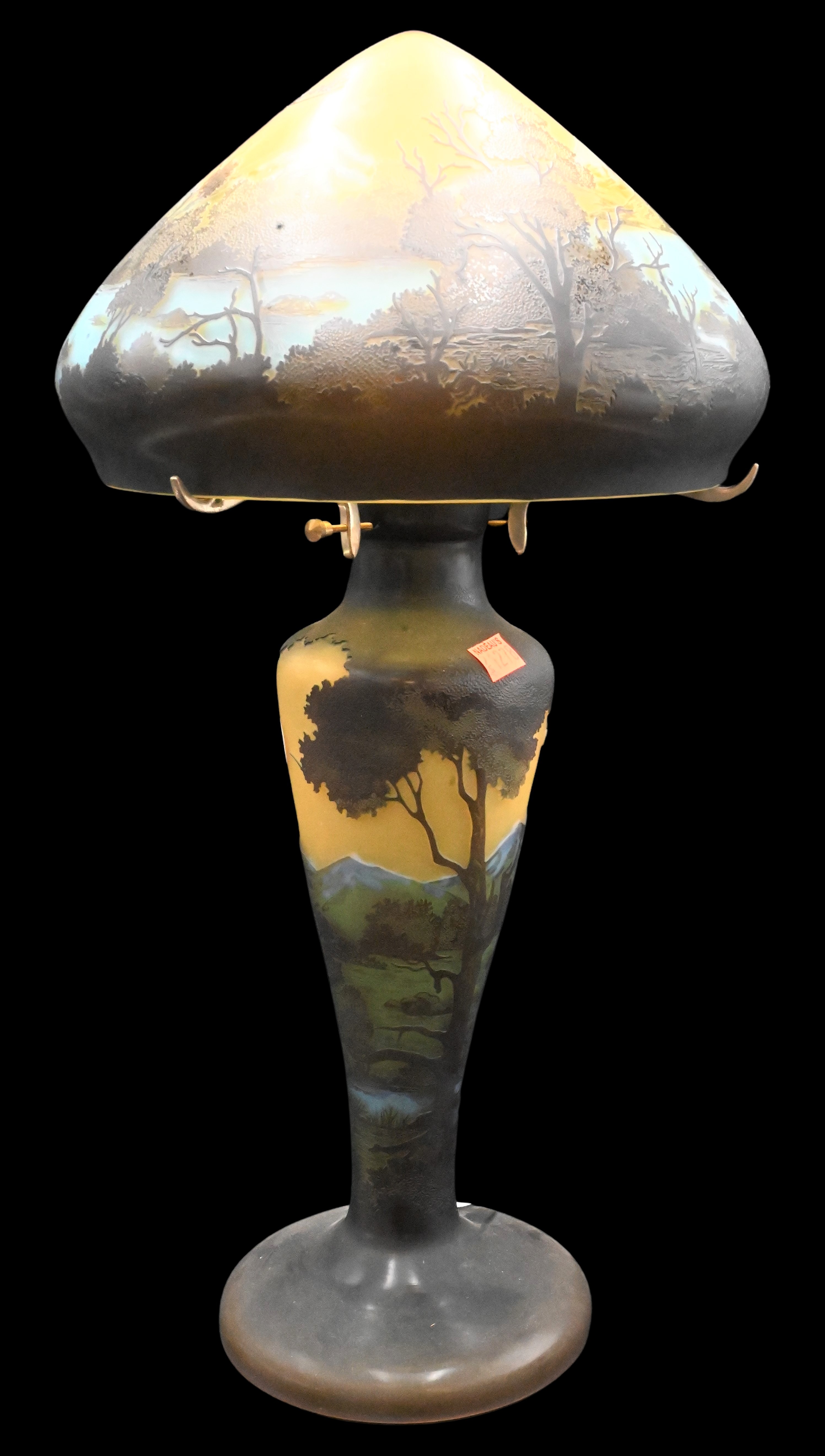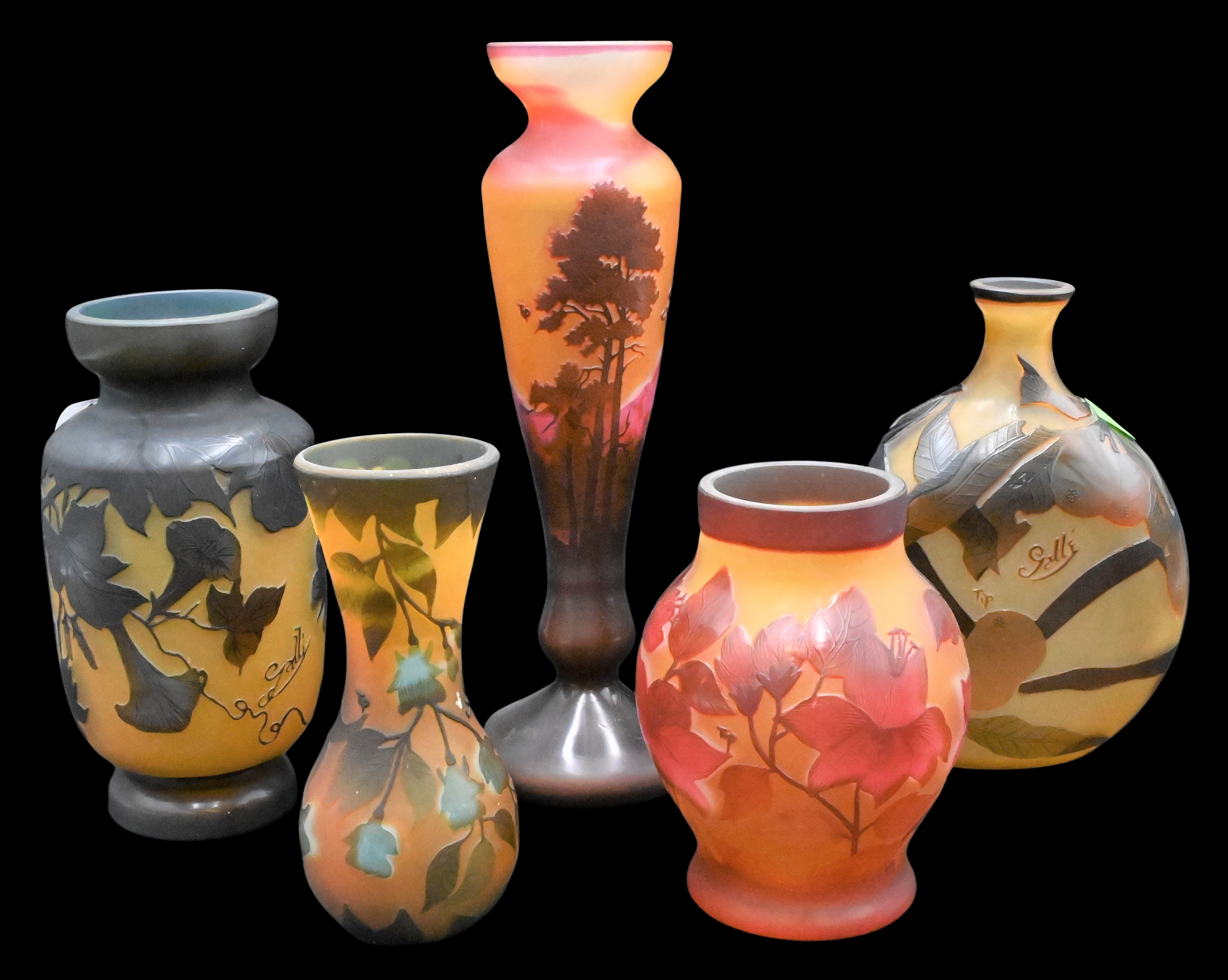 Five Galle Style Cameo Glass Vases, to include a tall vase having landscape motif, three smaller vases all having floral motifs, along with a fruit vase, tallest 11 3/4 inches.