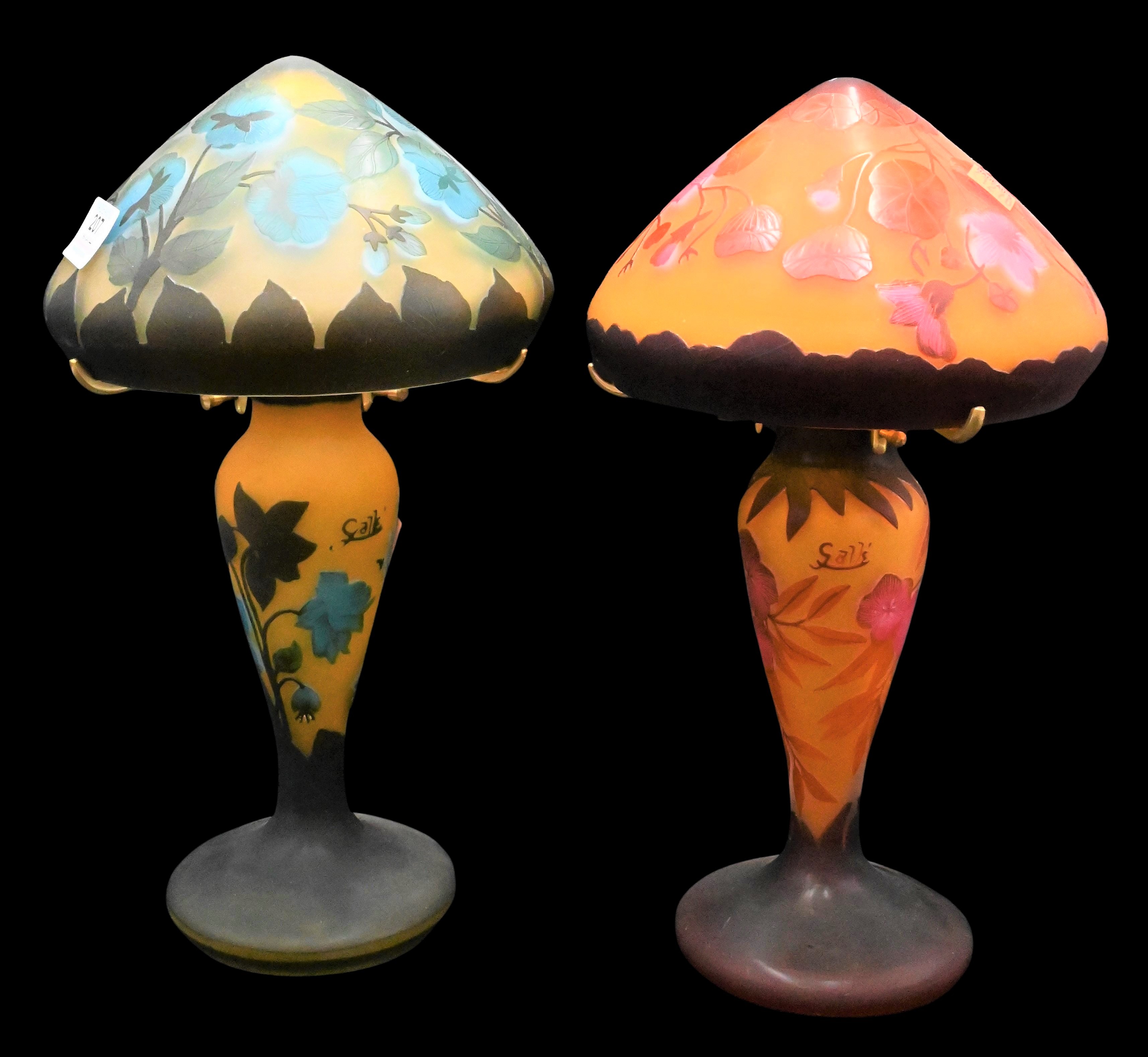Two Galle Style Cameo Glass Boudoir Lamps, each having mushroom form shade, one yellow ground with floral motif, one having dragonflies, height 13 1/2 inches, not electrified.